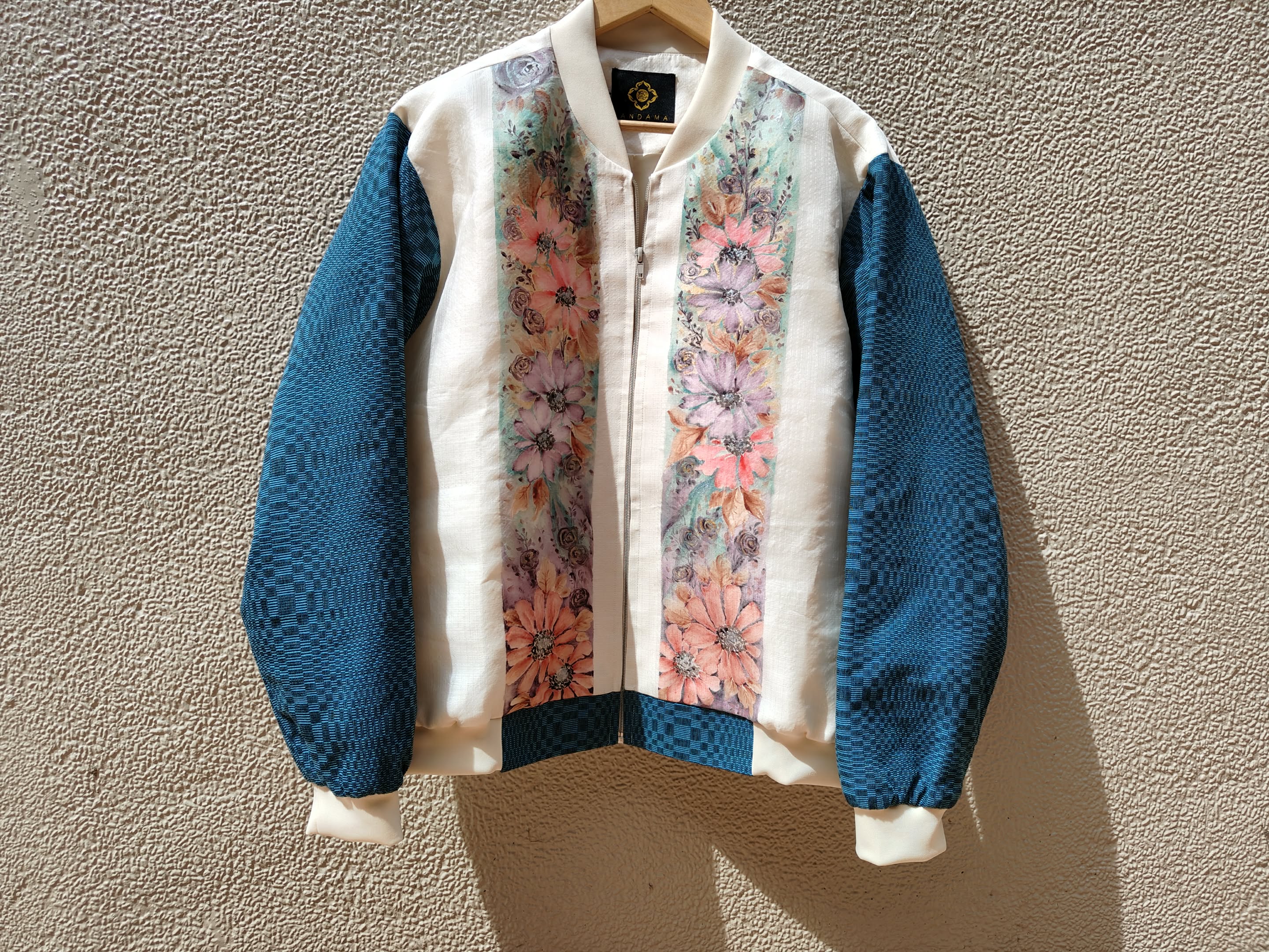 A woven bomber barong jacket made of cocoon pinya with unique hand painted designs.