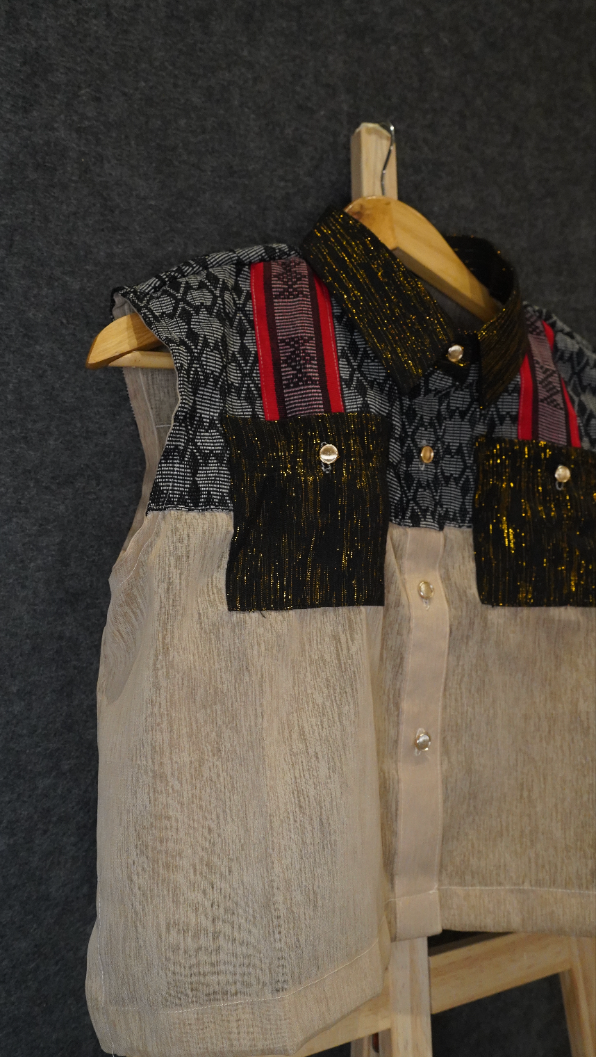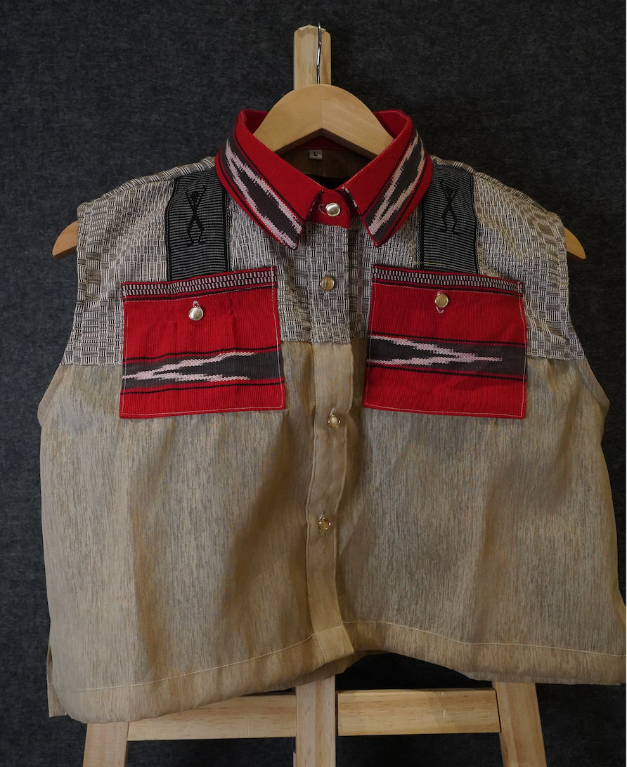 This sleeveless barong is a creative reinterpretation of Filipino tradition, crafted from jusi fabric that lends it a light, translucent texture with a natural sheen. It features patchworks of handwoven fabrics from Ifugao and Abra, each piece showcasing the vibrant patterns and cultural identity of their respective weaving communities.