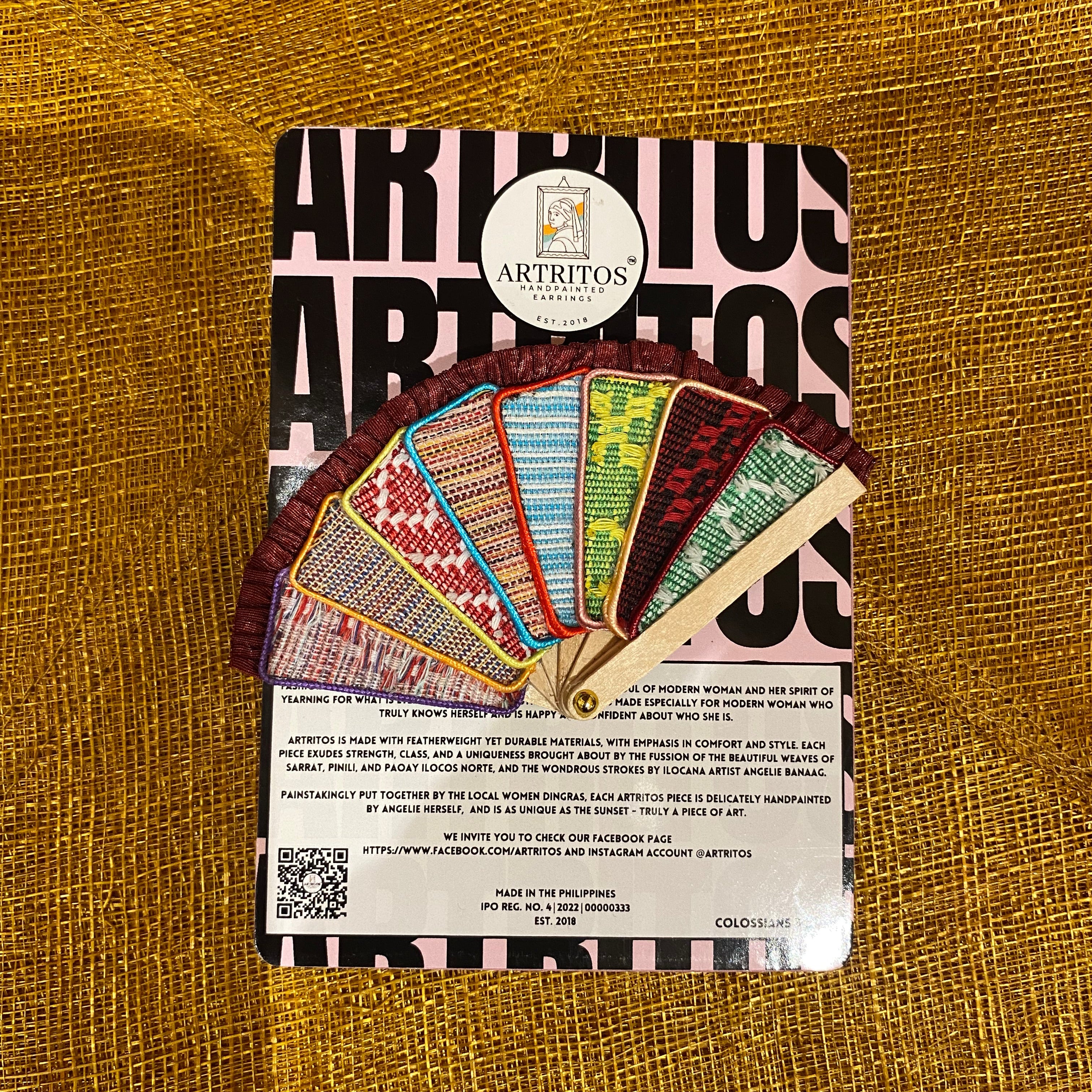 Artritos specializes in fashion accessories that encapsulates Filipino heritage and culture. With earrings and brooches made from local textiles woven in Sarrat, Paoay and Pinili, Ilocos Norte, and hand painted by the owner and designer, Angelie Banaag, these are carefully crafted for the modern day woman.