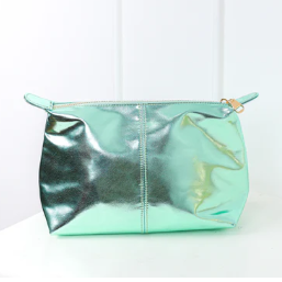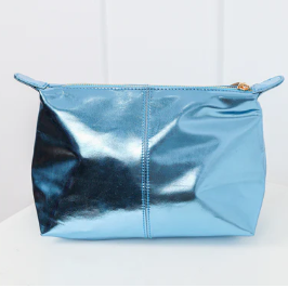 This is a large-sized metallic pouch with a sleek, glossy finish.  The pouch has a simple rectangular shape with a visible center seam on the front, giving it a clean and modern design. It looks spacious enough to hold makeup, toiletries, or small travel essentials.