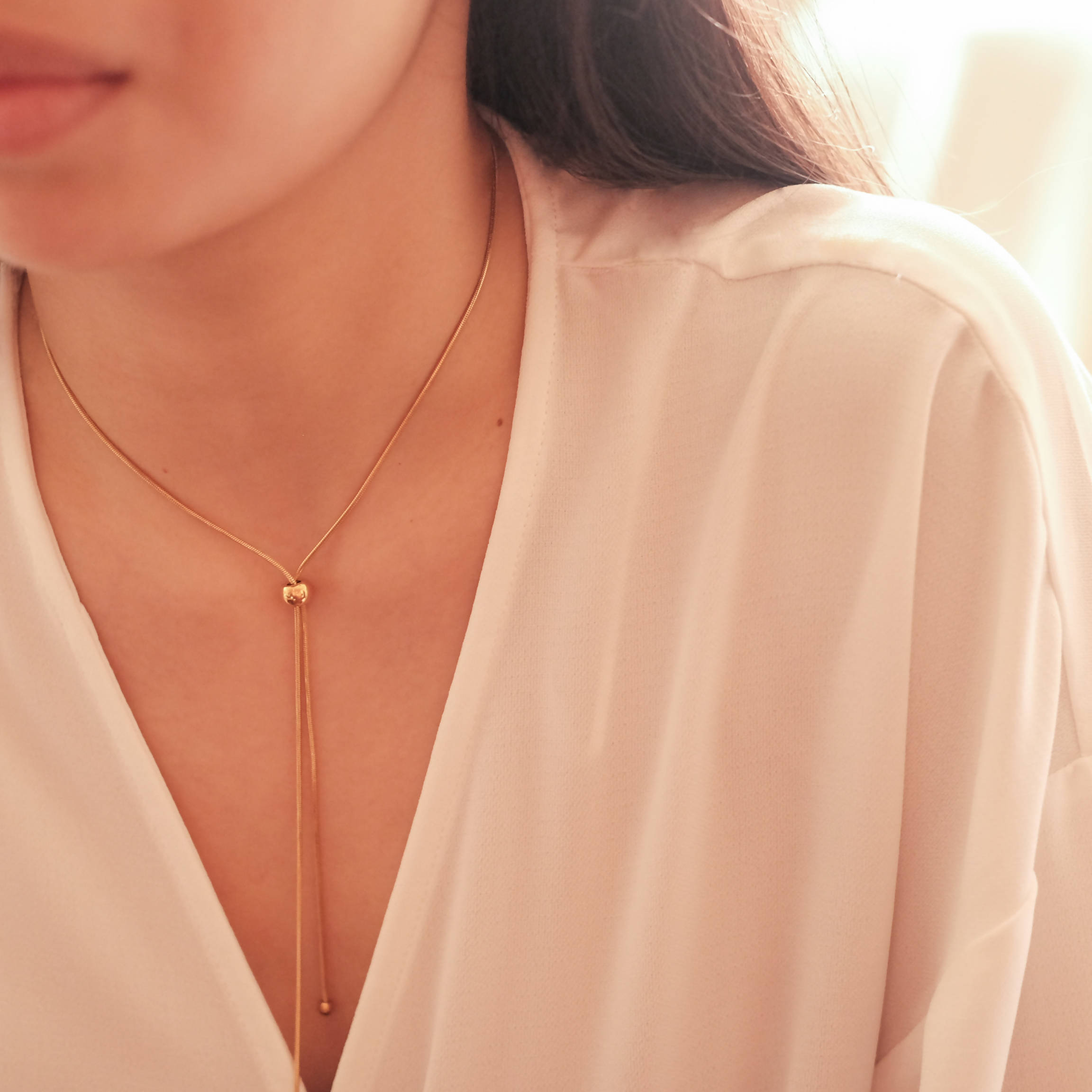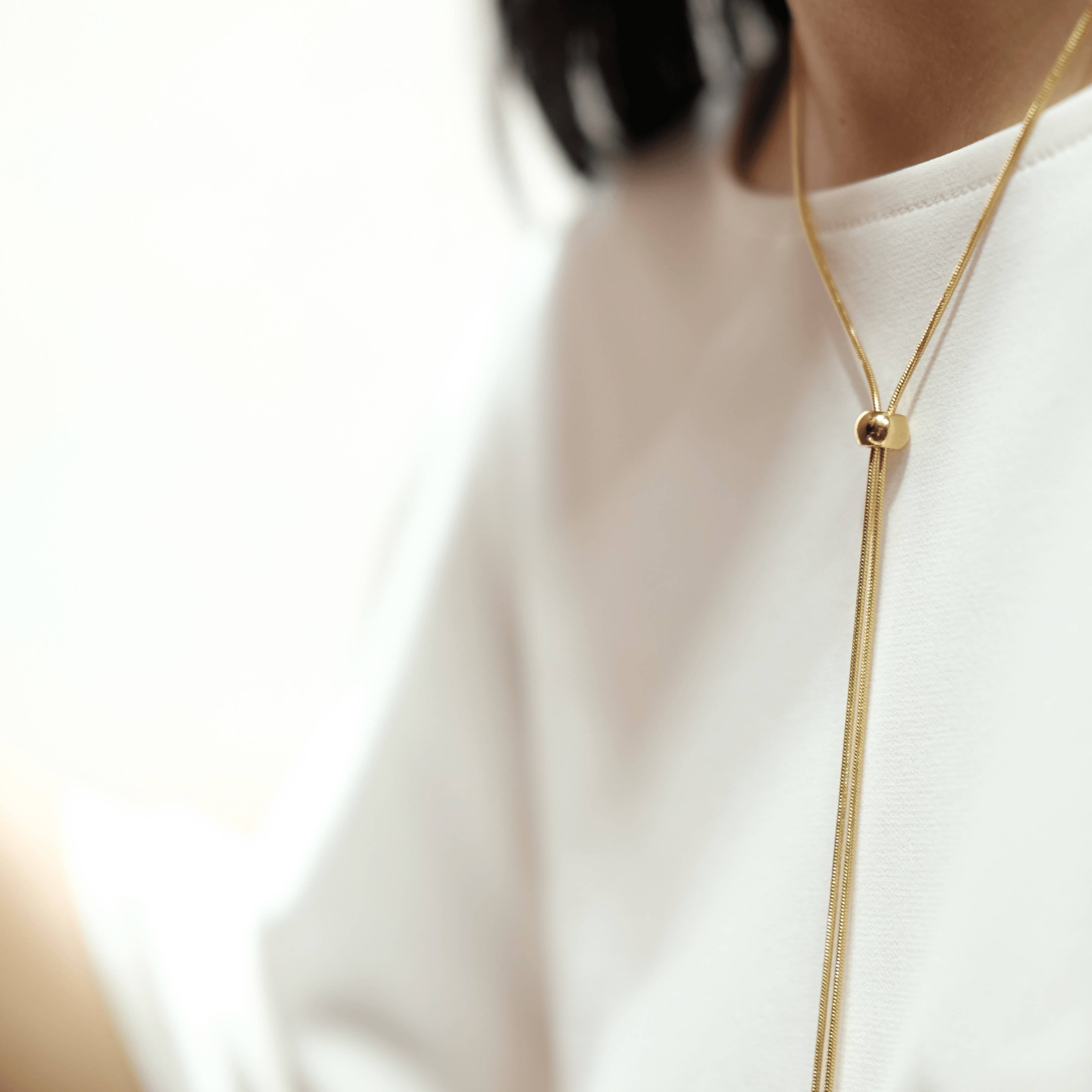 An minimalist yet elegant piece. Ball is adjustable for loose or tight wear; all depends on your style of the day.