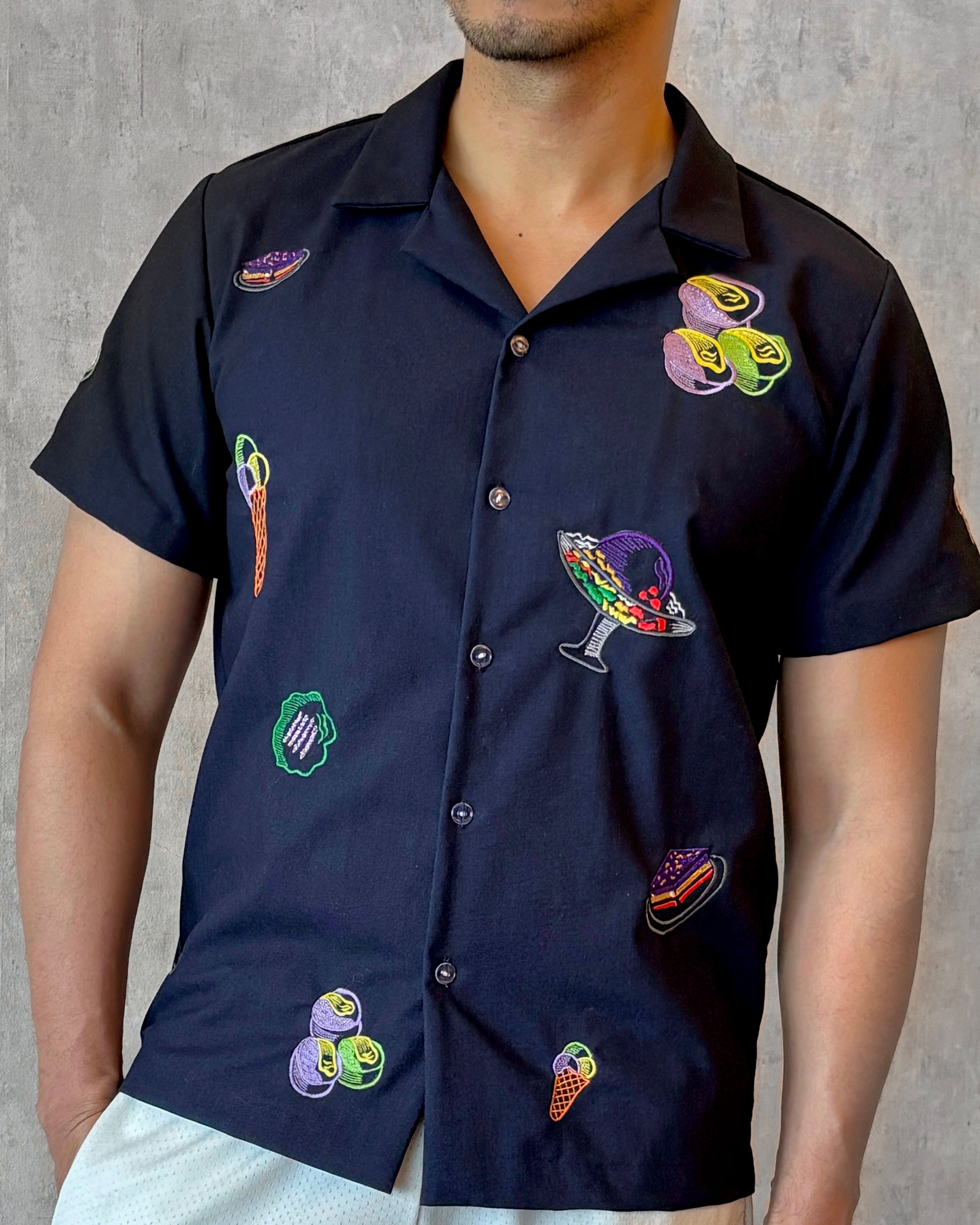 Brighten up your day with this button-down that’s filled with local desserts you love. Delicately crafted using manual hand-guided embroidery.