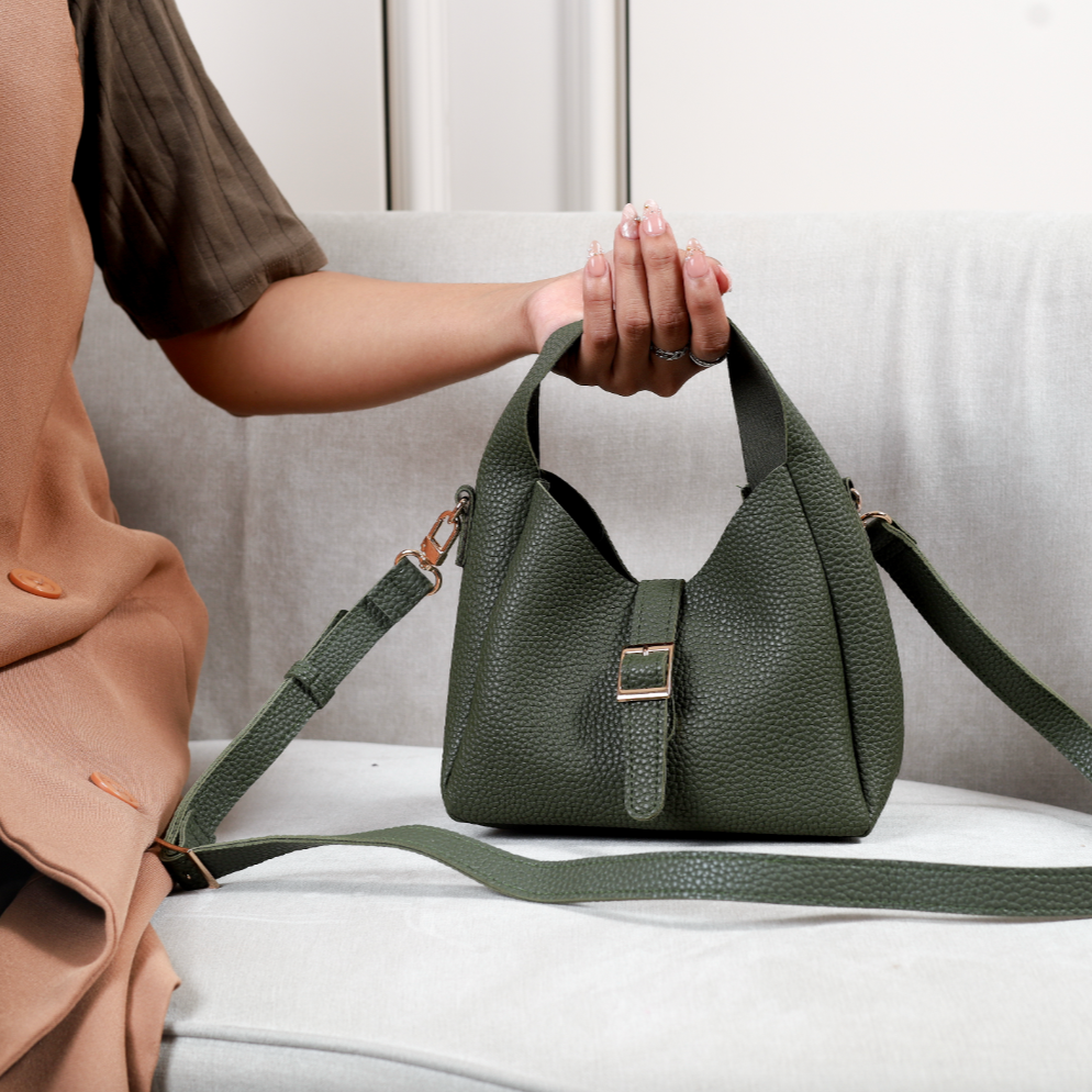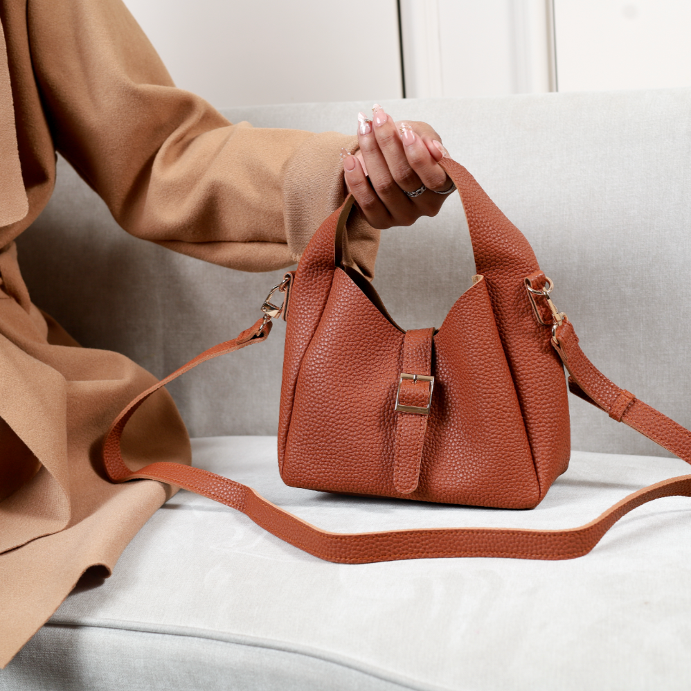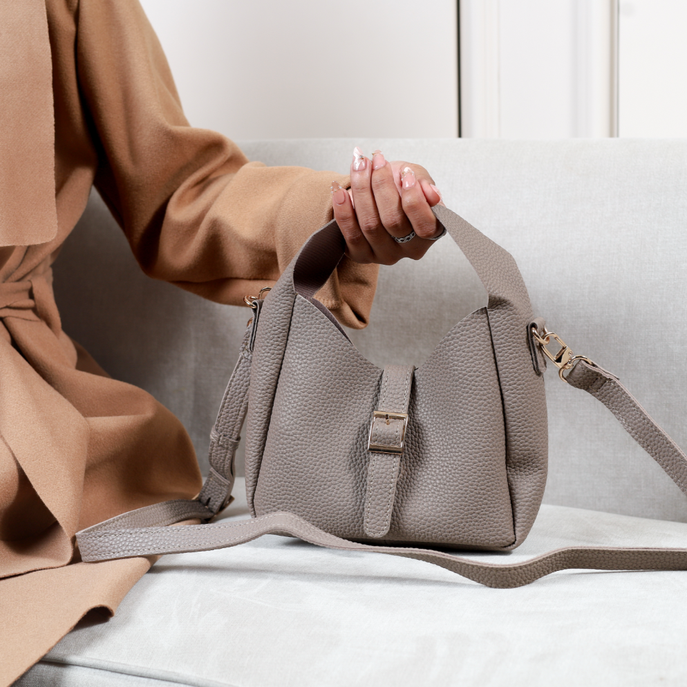 Upgrade your everyday look with the Aliza Mini Buckle Hobo Bag, where elegance meets practicality. With its structured yet soft design, this chic bag is accented by a sleek buckle detail for a refined touch.Compact yet spacious enough for your essentials, it features a versatile top handle that makes styling effortless for any occasion. Available in classic neutral shades for a timeless charm.