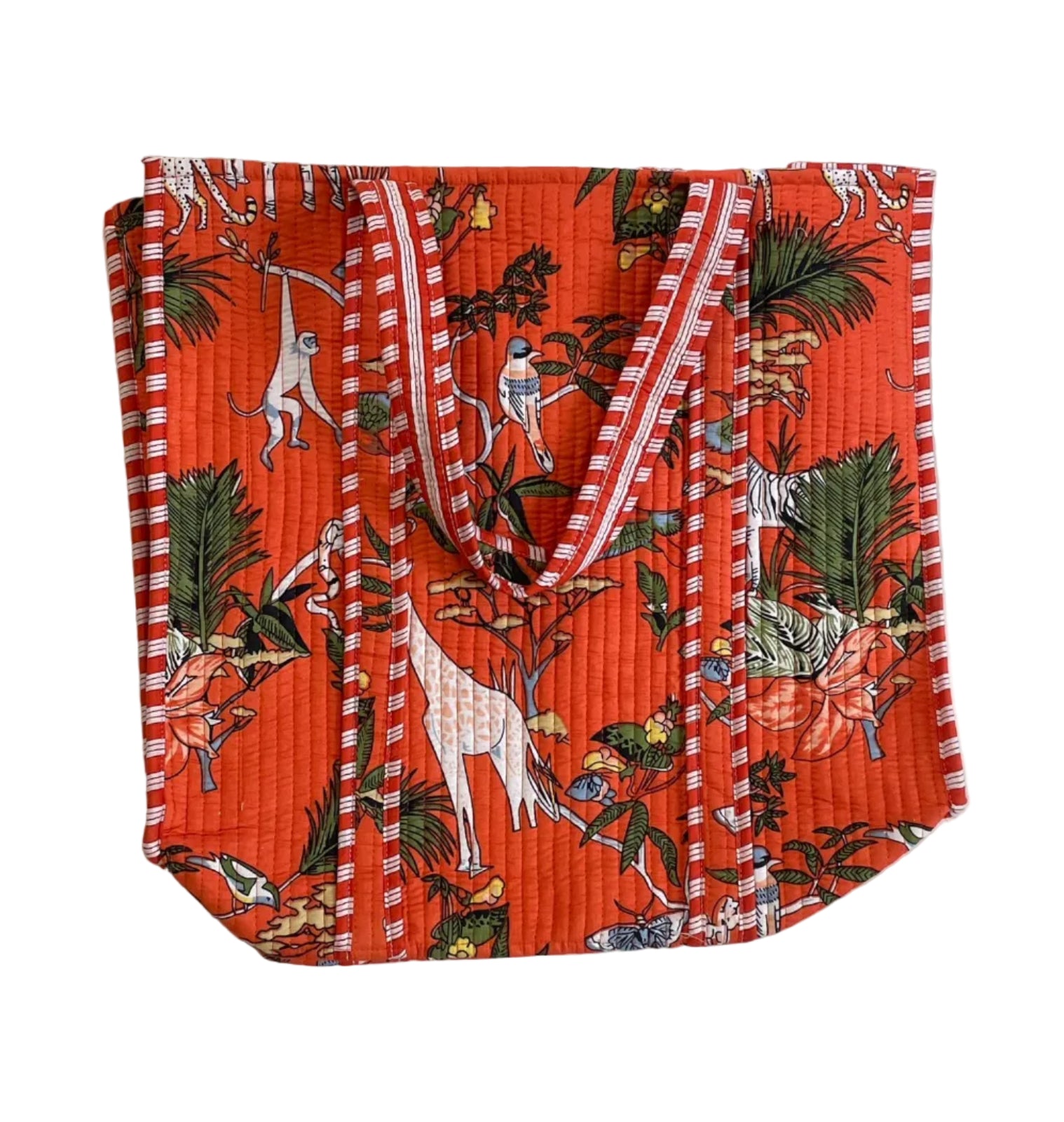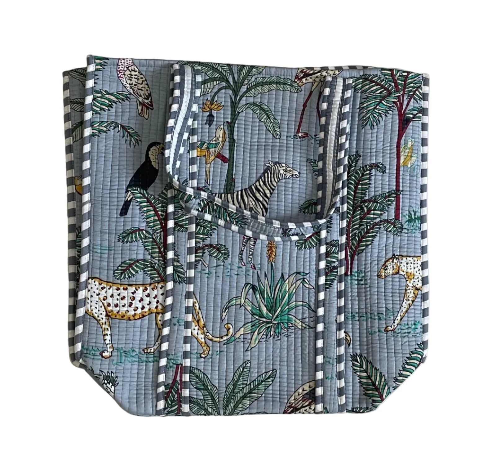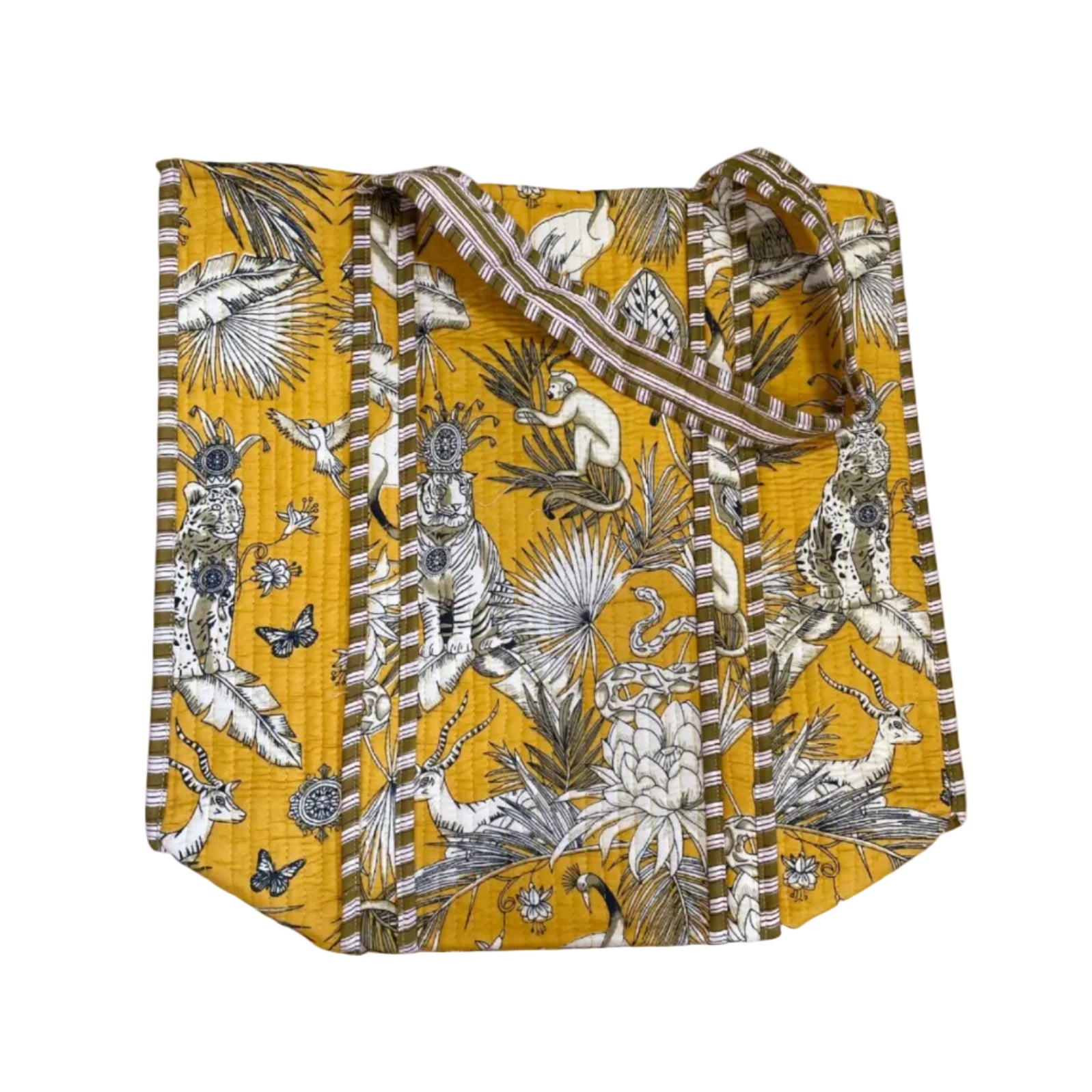 Discover the enchanting world of wildlife artistry with this handcrafted tote featuring traditional animal motifs. Master artisans have carefully carved birds, tigers, and other majestic creatures into wooden blocks, hand-printing each design using time-honored techniques. The rich, earthy tones and intricate details celebrate our reverence for nature and wildlife.