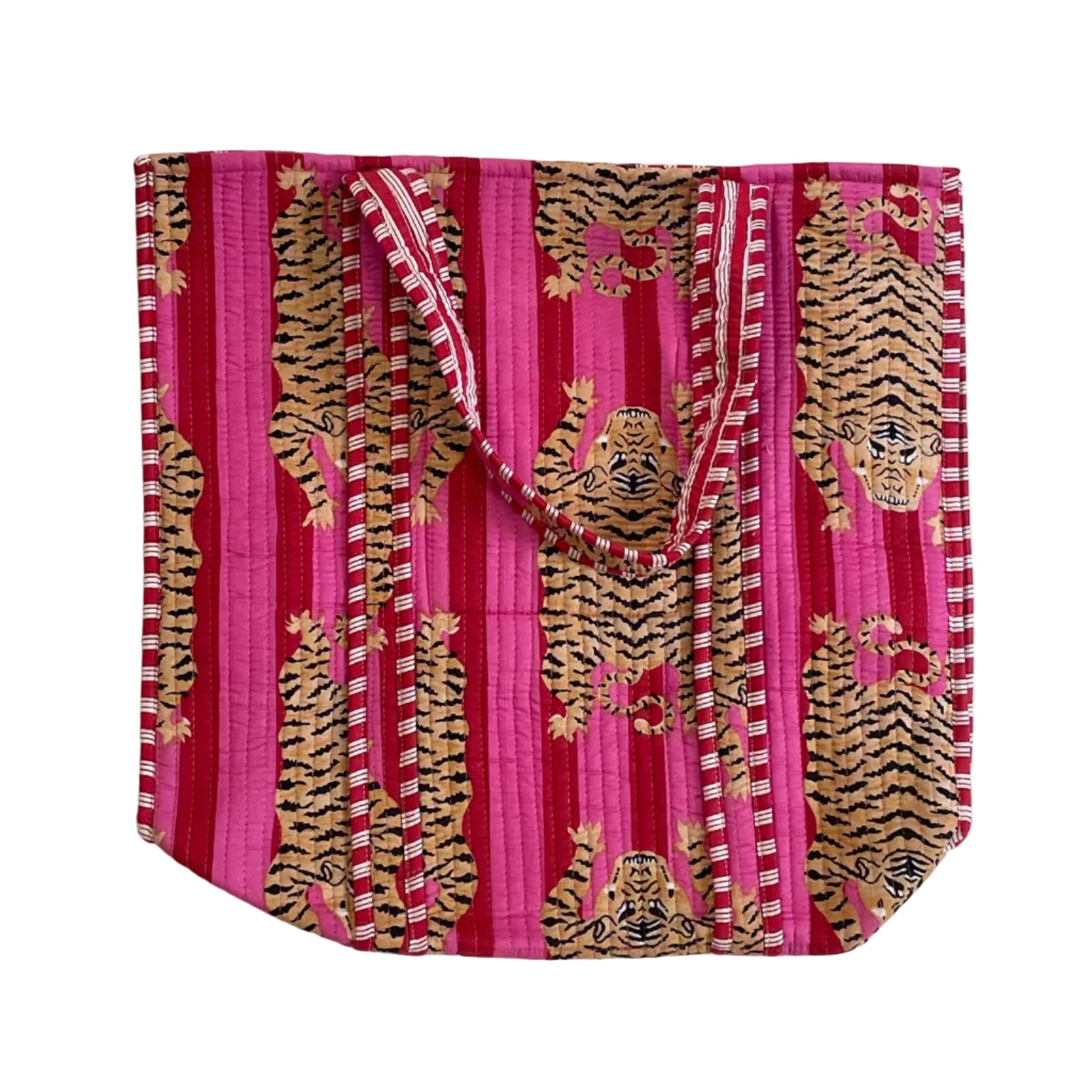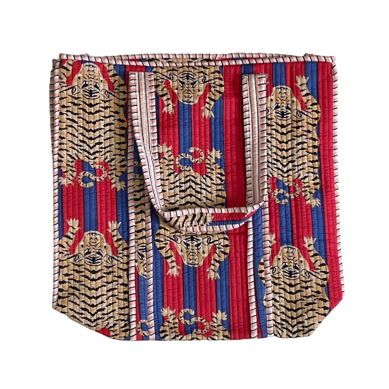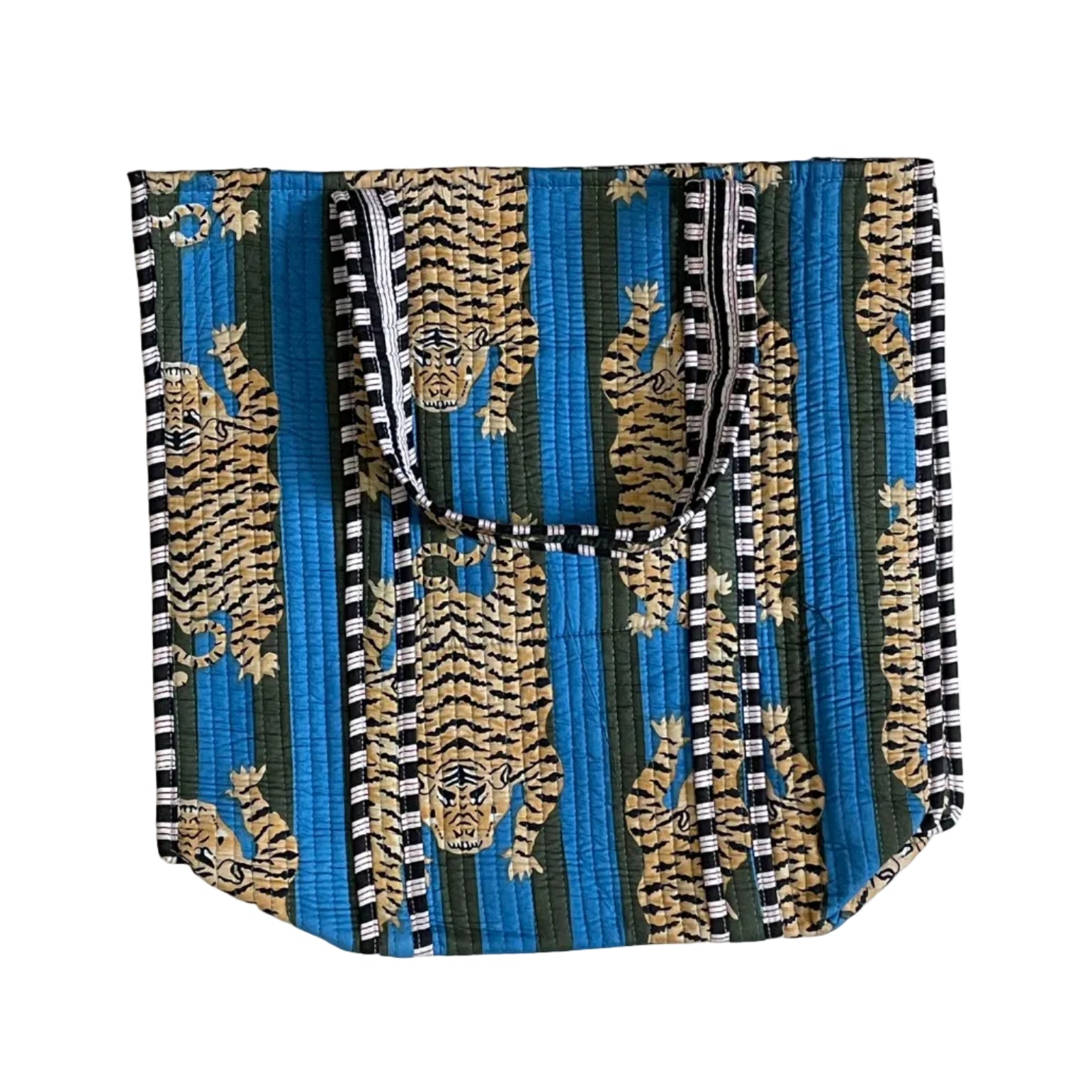 Discover the enchanting world of wildlife artistry with this handcrafted tote featuring traditional animal motifs. Master artisans have carefully carved birds, tigers, and other majestic creatures into wooden blocks, hand-printing each design using time-honored techniques. The rich, earthy tones and intricate details celebrate our reverence for nature and wildlife.