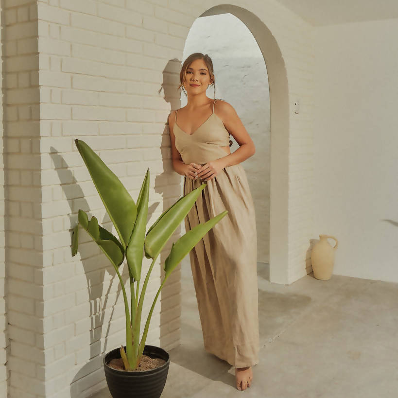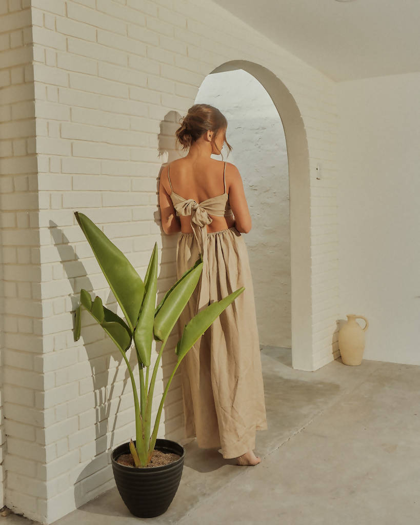 The Antonia maxi dress features a center back cutout, tie at back and elasticated waistline.
