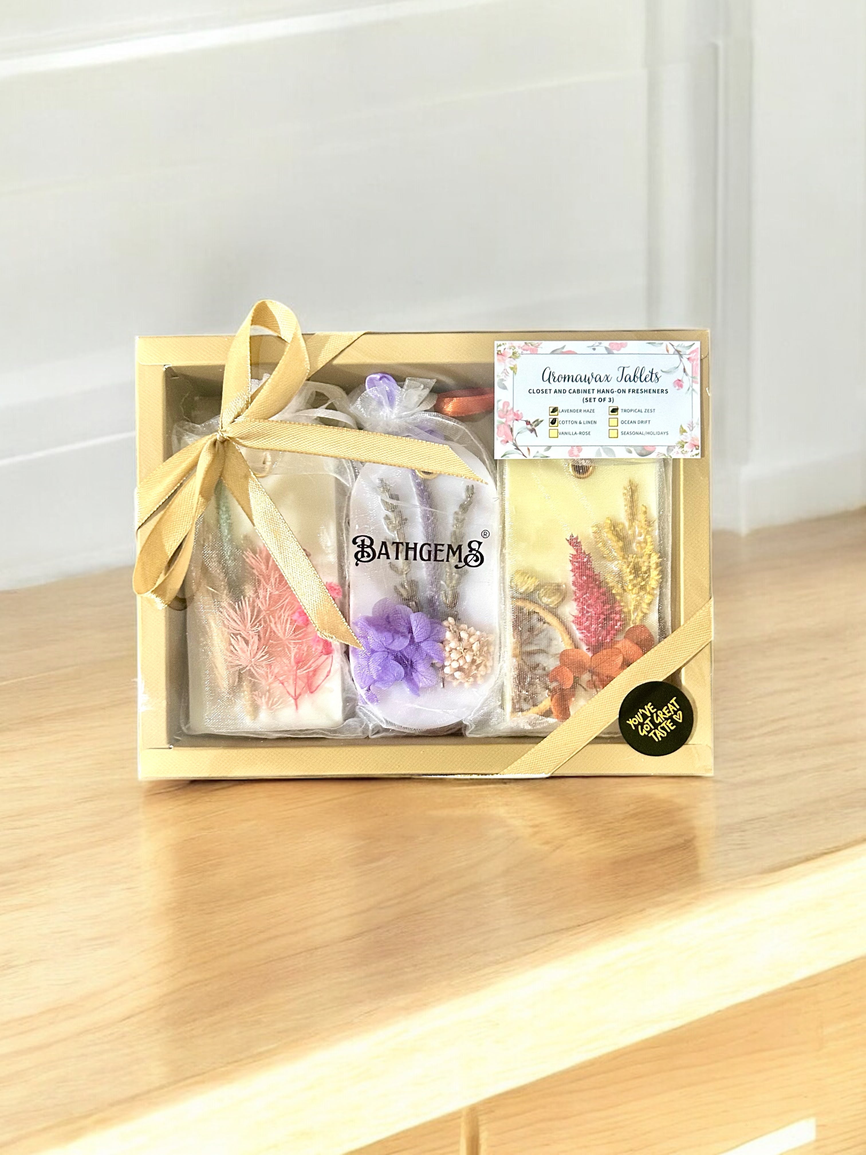 Aromawax Closet & Cabinet Freshener Elevate your small spaces with our elegant hang-on Aromawax freshener—perfect for closets, cabinets, powder rooms, and more. Designed to hang easily in any small space Organic, non-toxic, and free from harsh chemicals Chic and charming design to complement your space Made with a soy-blend wax, premium fragrance oils, and natural botanicals like dried florals and foliage Long-lasting freshness for up to 3–4 months