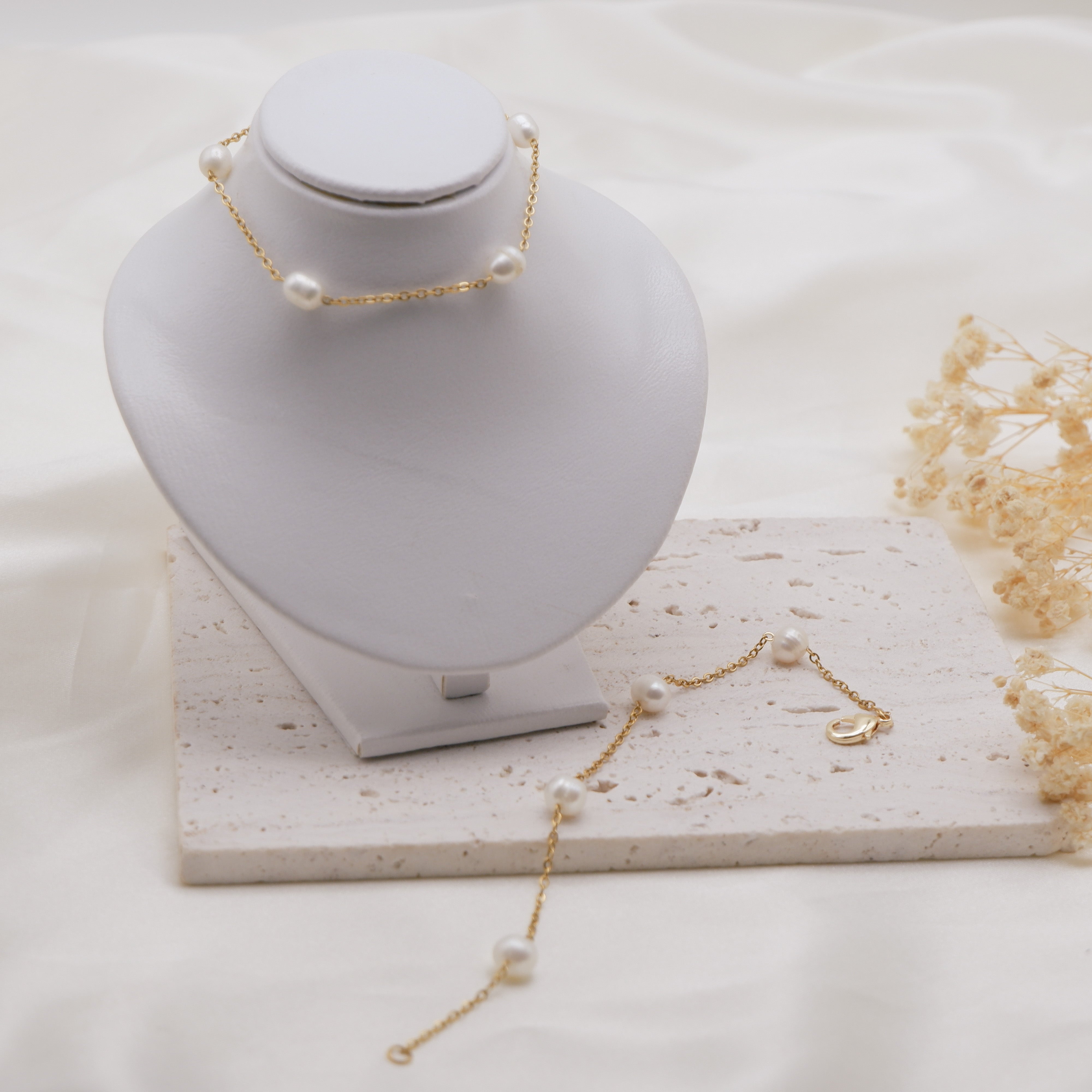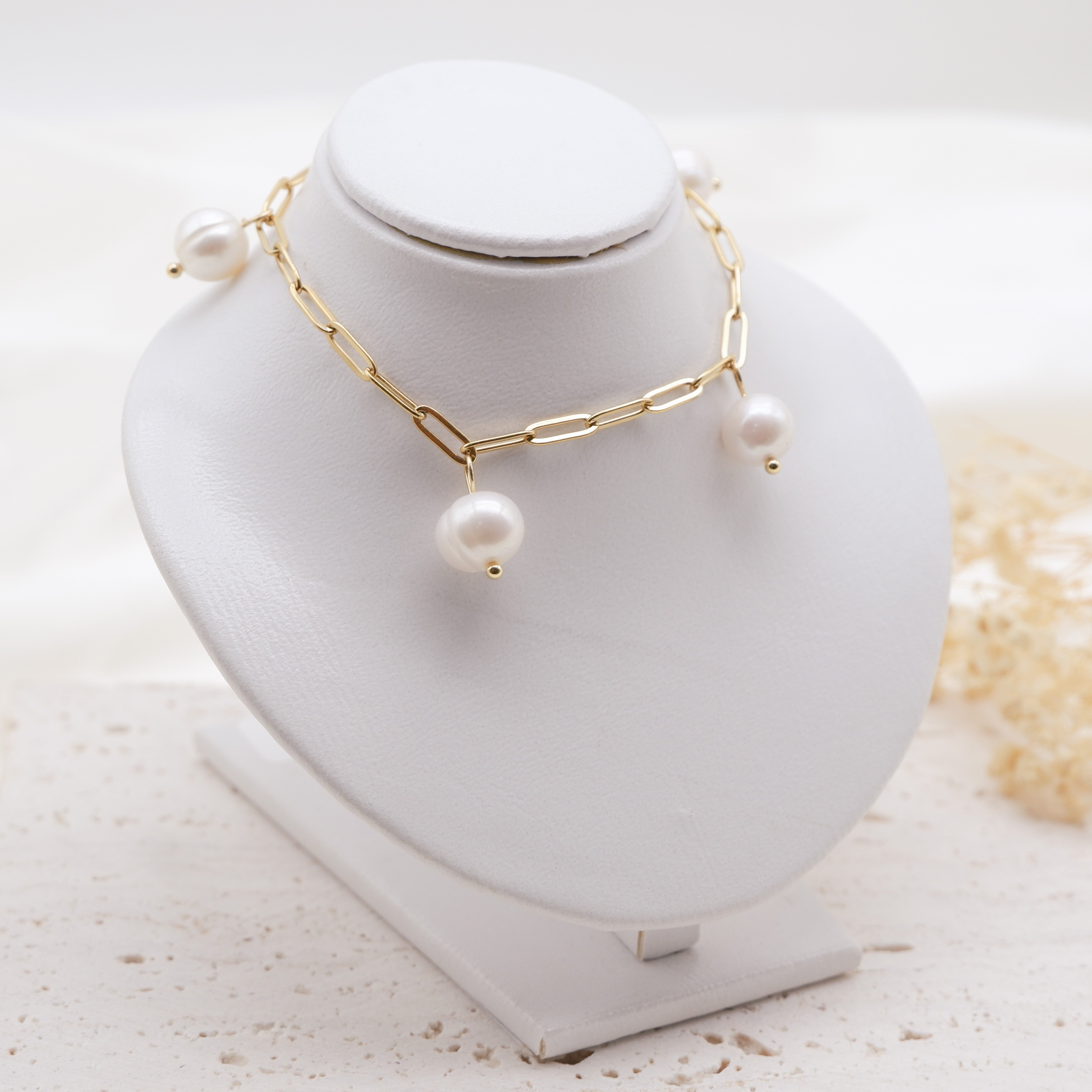 Materials:Real freshwater pearls in stainless steel.Pearls vary in size and shape.Each product is unique. Please expect slight variations.Do's & Don'ts:Do remove jewelry before exercising or when sweating profusely, cleaning with harsh chemicals, showering, and swimming.Do not forget to wipe your jewelry before storing it away. This will make sure any moisture/oil/dust is removed.Do carefully store jewelry in separate compartments of a jewelry box to prevent them from scratching each other and dulling the finish.