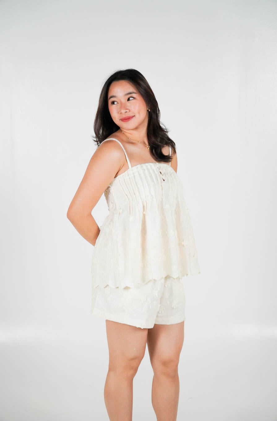 The Astrid Set is your go-to for effortless style and all-day comfort.FEATURING A spaghetti-strap & adjustable top. Three delicate pearl buttons and charming pleats, it’s designed to flatter while keeping things light and breezy. Paired with matching shorts made with soft, stretchable garters and handy side pockets. Perfect for lounging at home or enjoying a breezy summer day out, the Astrid Set offers versatility you’ll love. SIZEDesigned in one comfortable size that fits XS–XL.FABRIC: Cotton MODEL HEIGHTS & COLOURS Beige: 5'2'' Salmon Pink: 5'5" Pastel Floral Blue: 5'4"