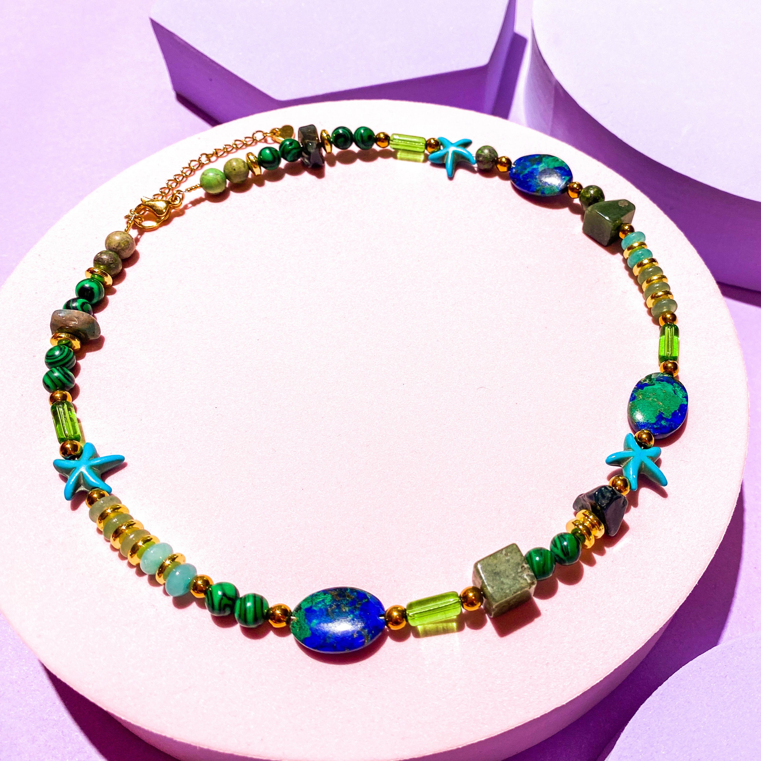 • This green and blue Atlantic necklace is made of flat Australian azurite stones, turquoise star fish, green and sea blue aventurine, manmade malachite, gold iron oxide mineral beads, green glass cylinder beads, a stainless chain and clasp.
