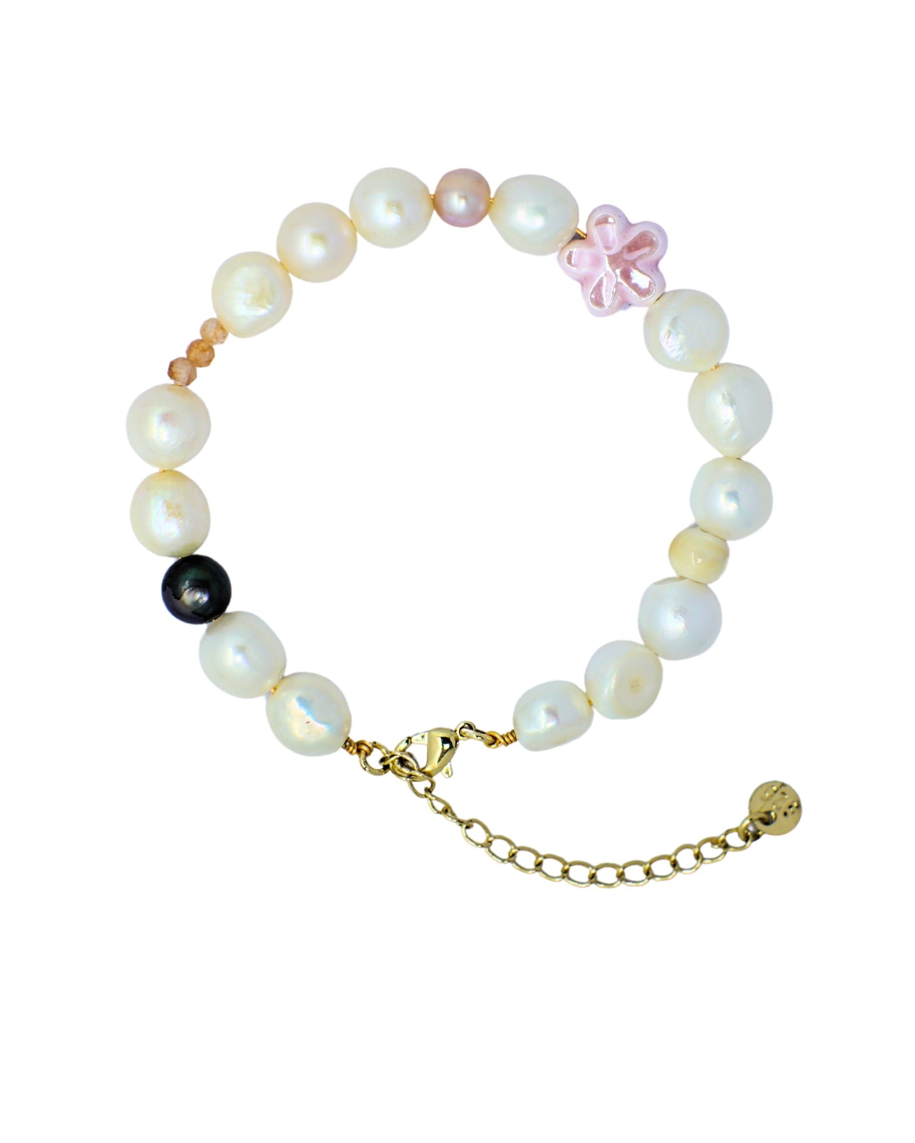 Composed of 14 natural 9–10mm baroque freshwater pearls, accented by pink beads, Kyoto pearls, a ceramic flower, black pearl, and ceramic bead in brown. Sourced from natural farms across Asia, including the Philippines, and hand-strung for a unique finish.