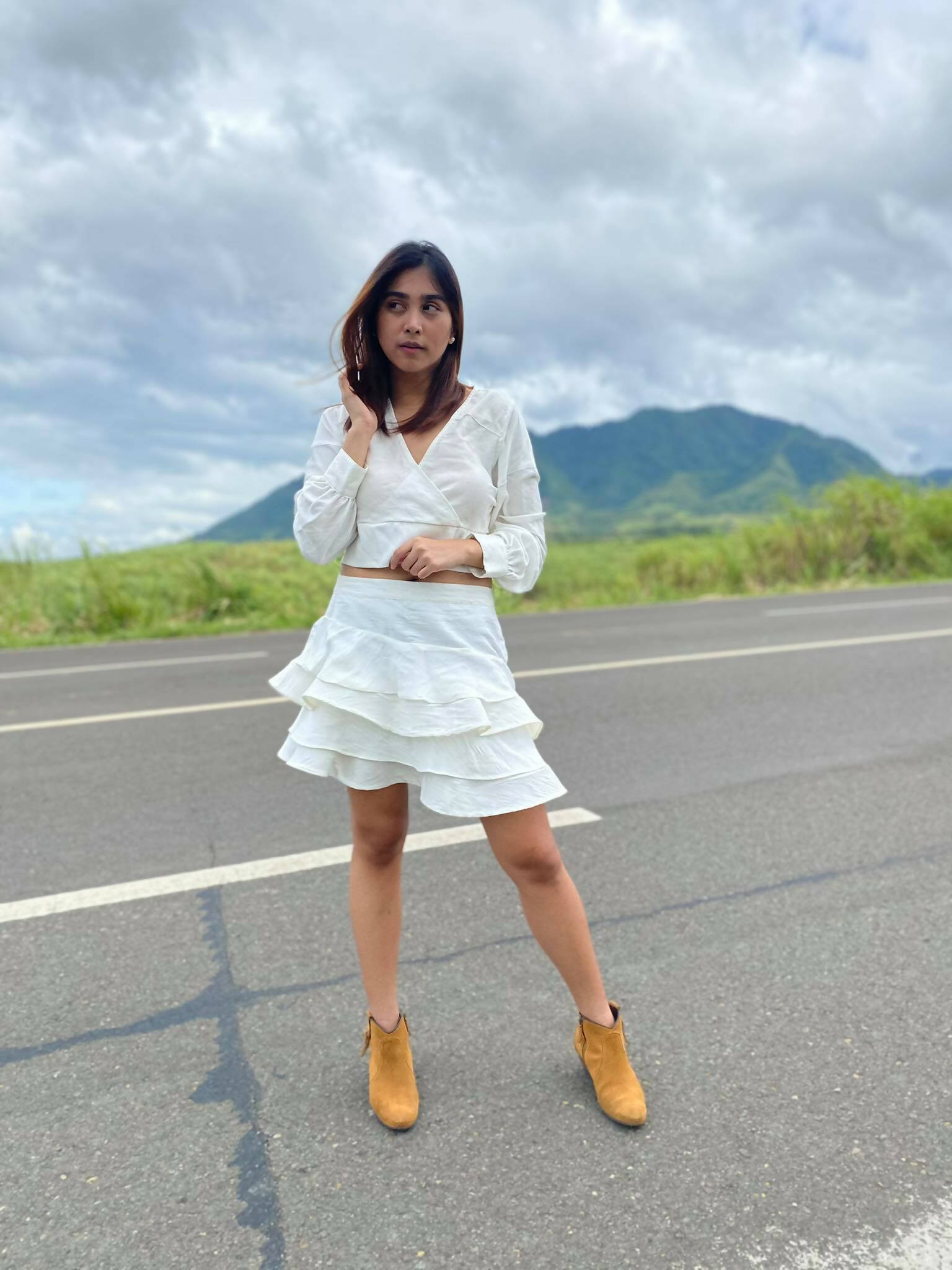Capturing the beauty of white, this ruffle skirt matches with a long sleeve blouse is Bernadette and crafted by Negros Island Weavers. Vida designs this sophisticated matchy clothing made of silkworm woven. Model wearing - size M 200 g   100% handwoven 80% silk worm & 20% cotton Hand wash cold & mild detergent Dry in the shade Use warm iron Made in Negros, Philippines