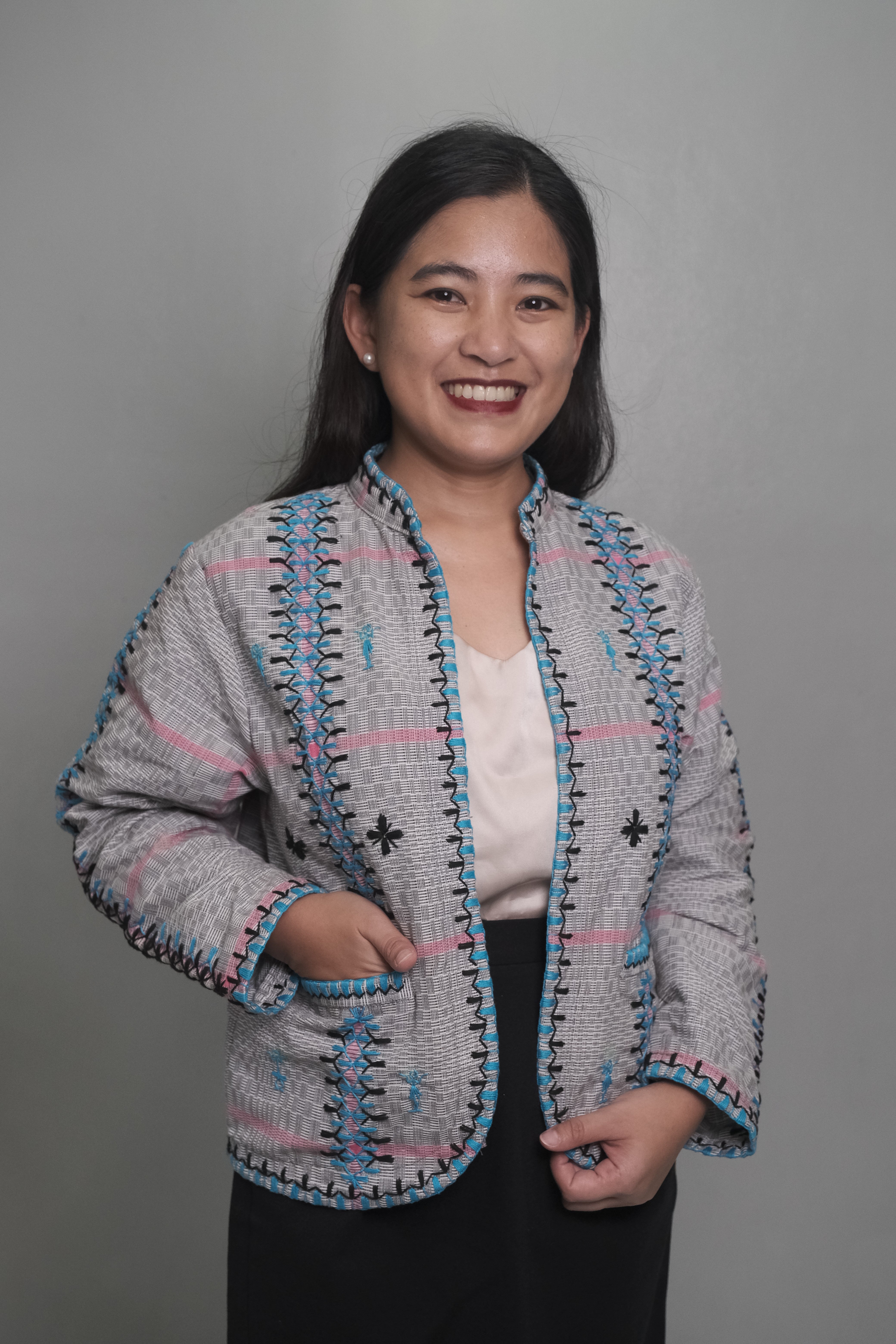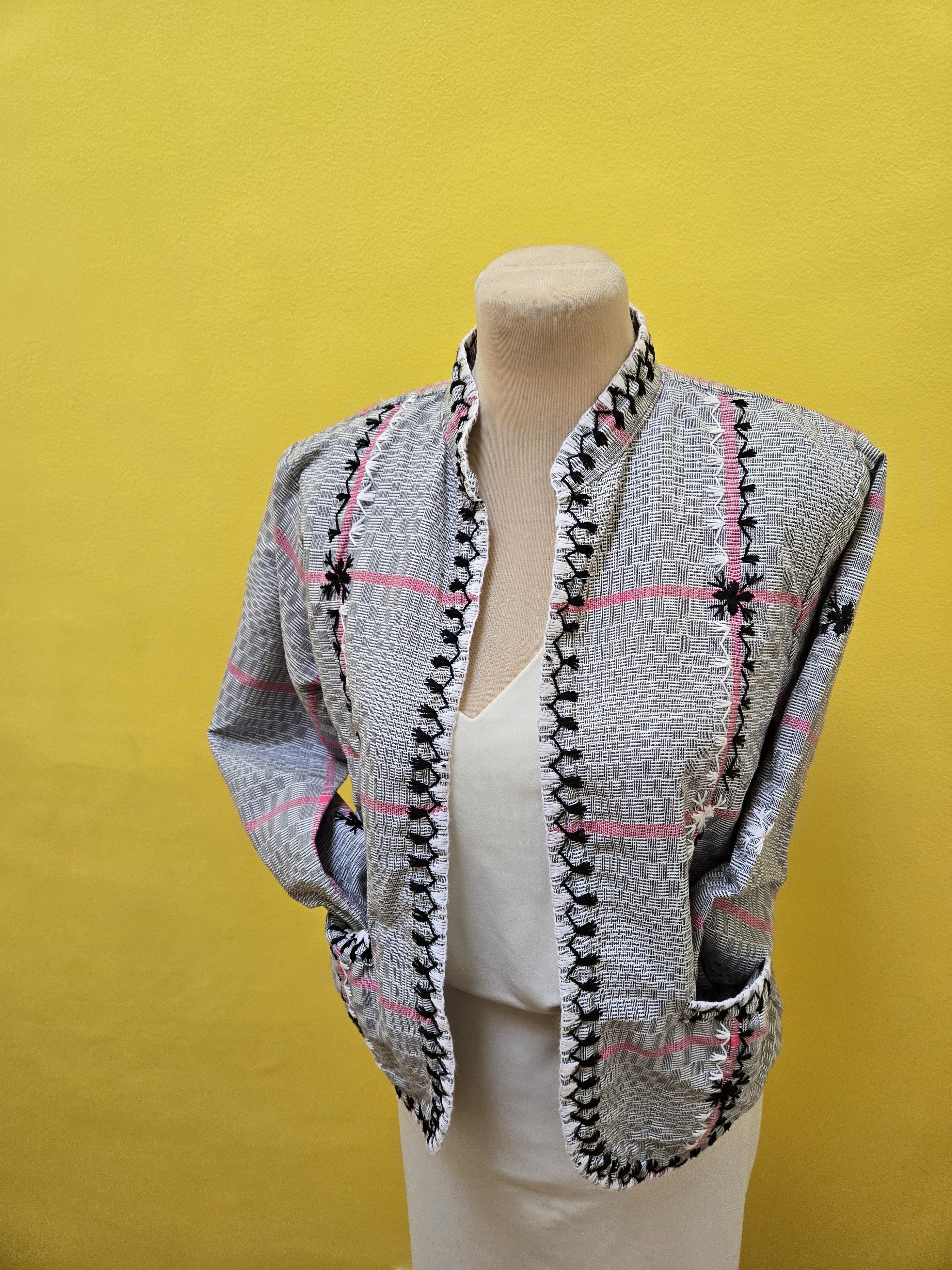 Binakol Blazer in grey with pink striped detailing, accented by Itneg embroidery, with front pockets and mandarin collar.  Handmade in Abra Province by Itneg artisans. Style this blazer from boardroom to events and travel. Proudly Filipino-made.
