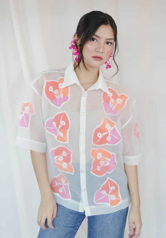 Unisex barong made from silk organza, with hand-drawn and hand-printed bougainvillea flowers on linen stitched between layers