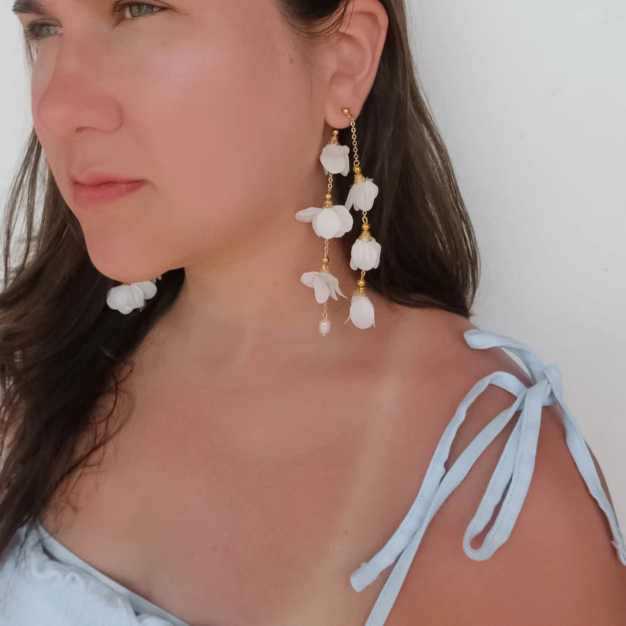 Handmade silk flower earringsAlso available in ruby, teal and blushComponentsgold-plated studssilk flowerssouth sea pearls Dimensions4.75 inches in lengthLightweightDue to the handmade nature of our earrings, lengths and sizes may vary but very minimal. Note: Pearls are naturally irregularly shaped and may not exactly match as a pair.
