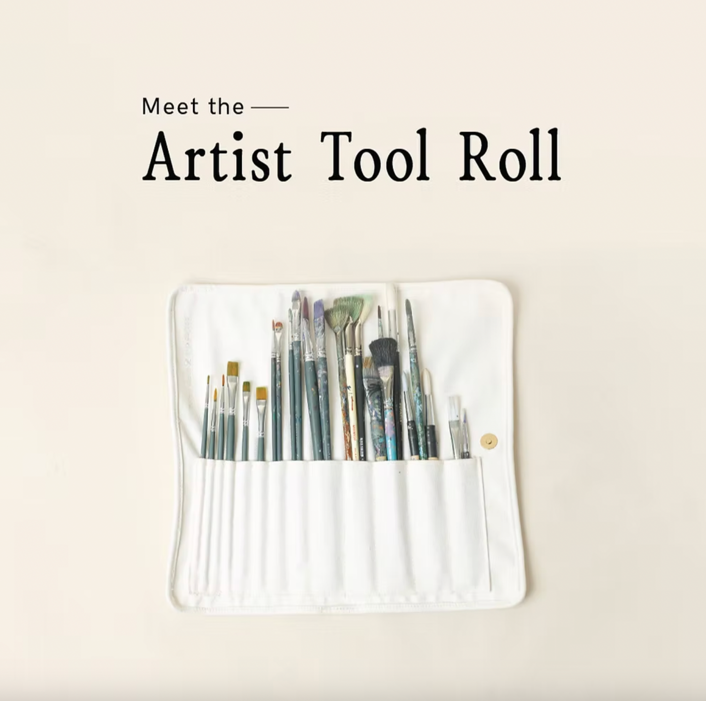 The Artist Tool Roll has 13 pockets to fit your wet medium brushes for all shapes and sizes. Watercolor, acrylic, gouache, oil, etc. Roll it up to close with a magnetic-type closure.