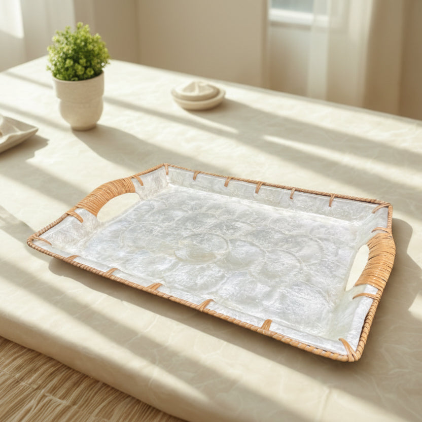 • Handcrafted rectangular serving tray featuring natural capiz shell panels with hand-wrapped rattan edges.