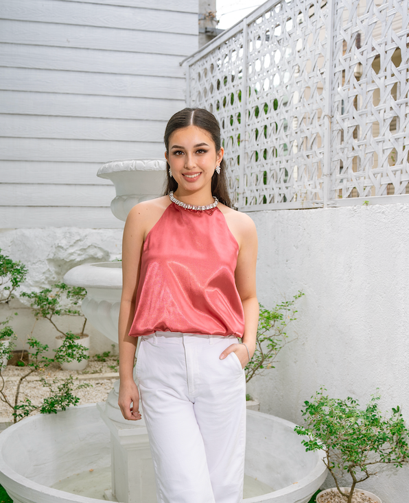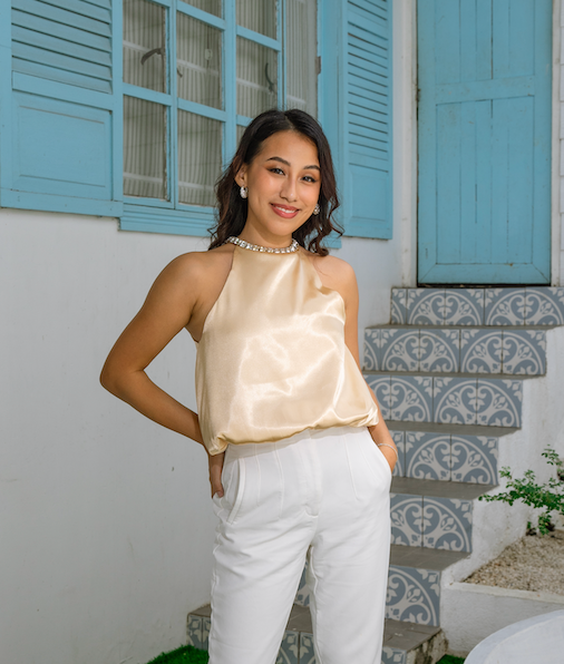 This silk halter top brings elegance and ease with its soft, flowing fabric and necklace-inspired rhinestone detailing along the neckline. It features a back zipper for convenience and a fully garterized hem that creates a subtle bubble silhouette—perfect for dressing up with trousers or a sleek skirt.