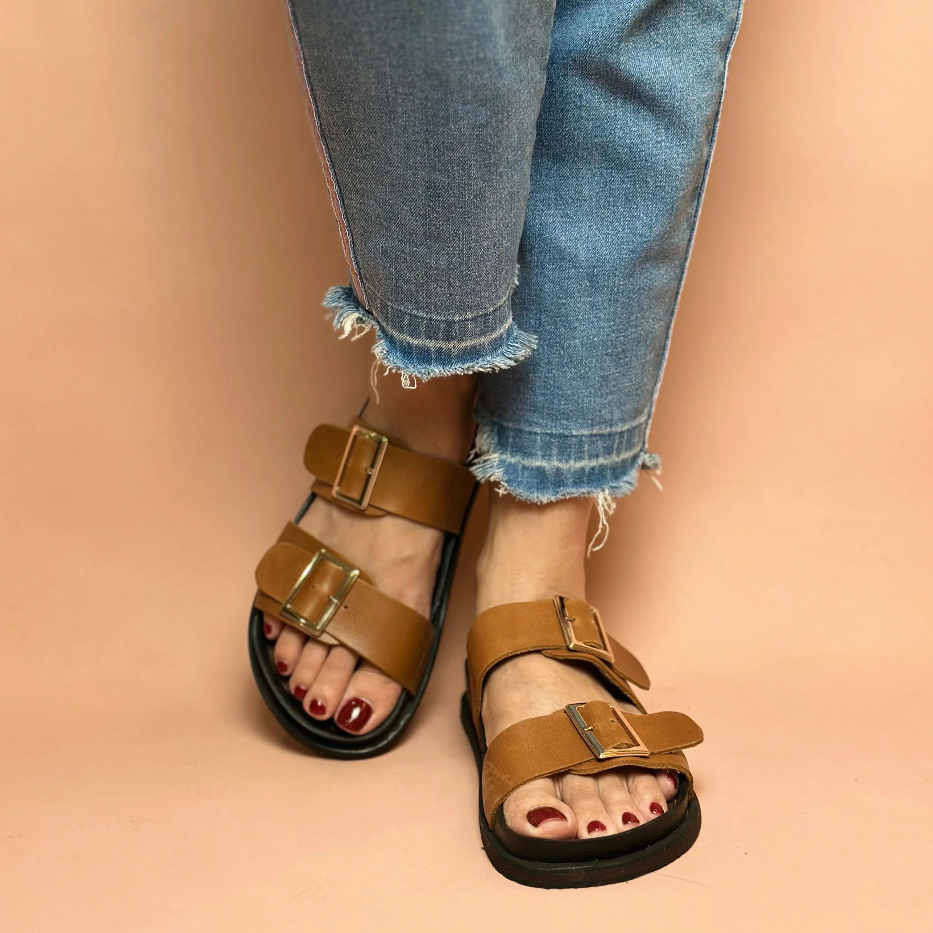 Keep your feet comfortable yet fashionable with "Celia". Materials used: Genuine Leather (straps and insole) / Molded Soles (non-skid rubber outer sole)