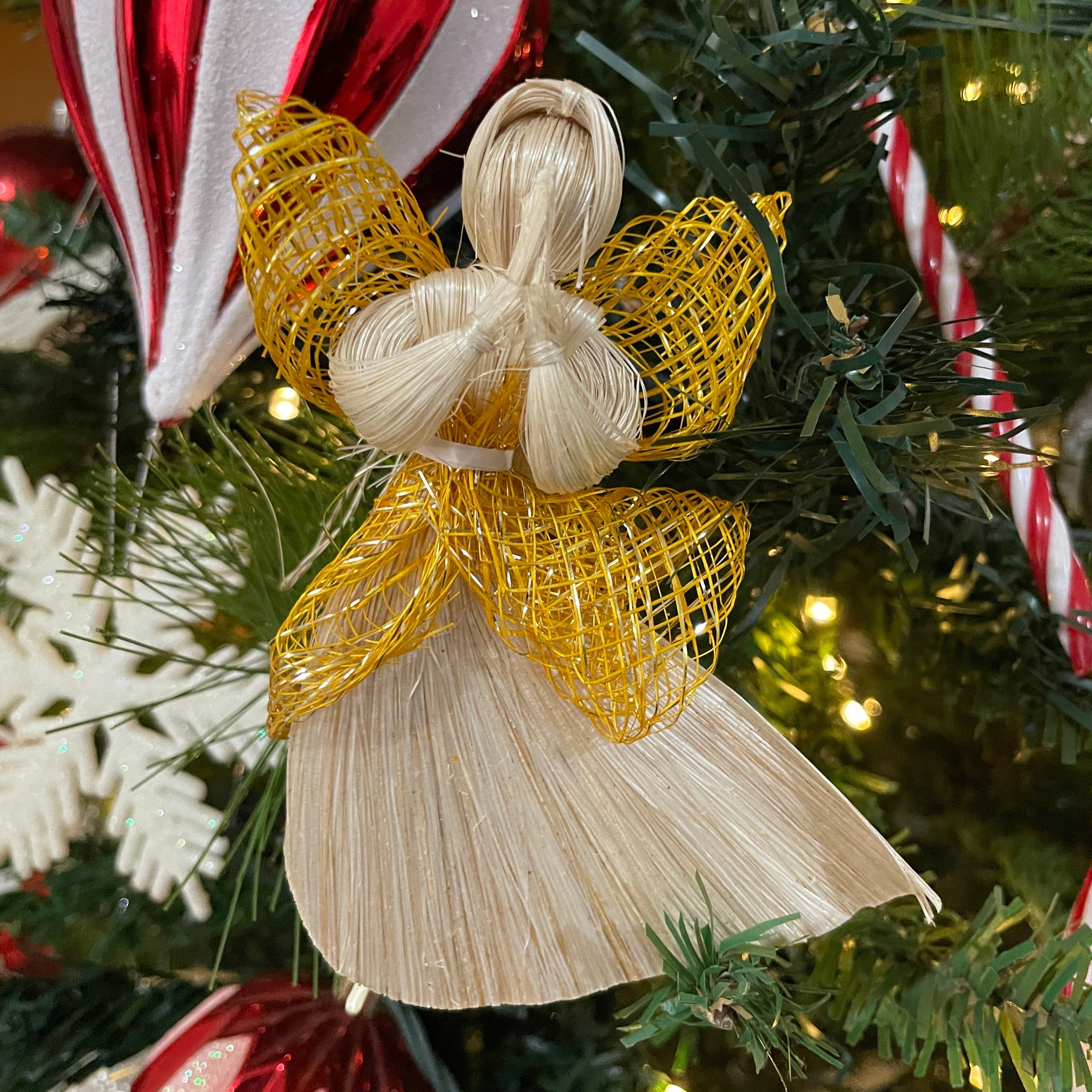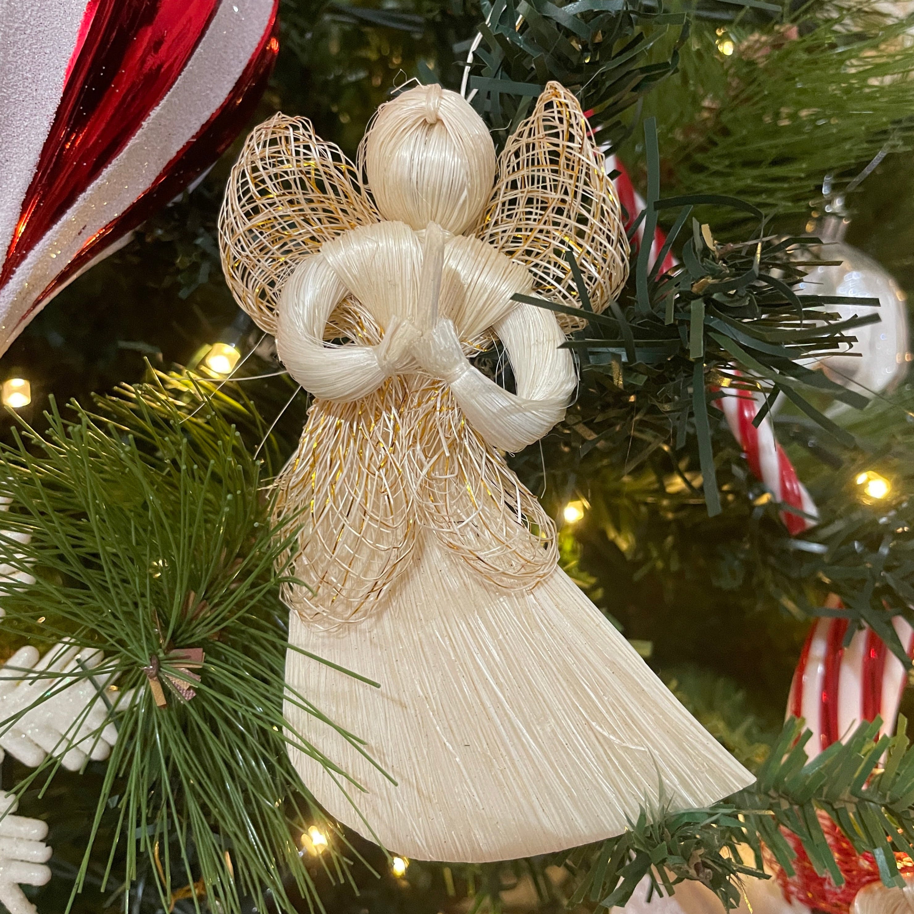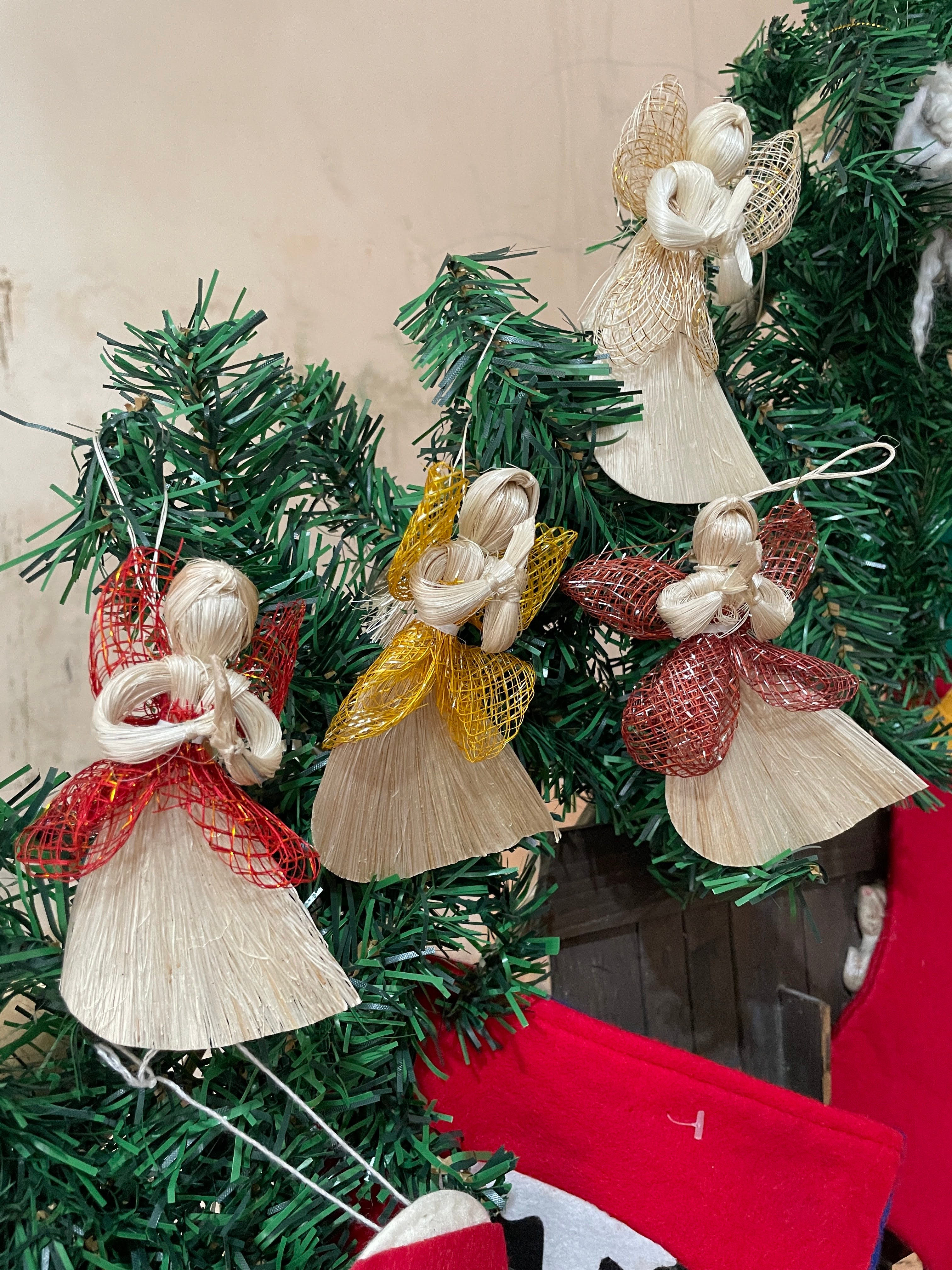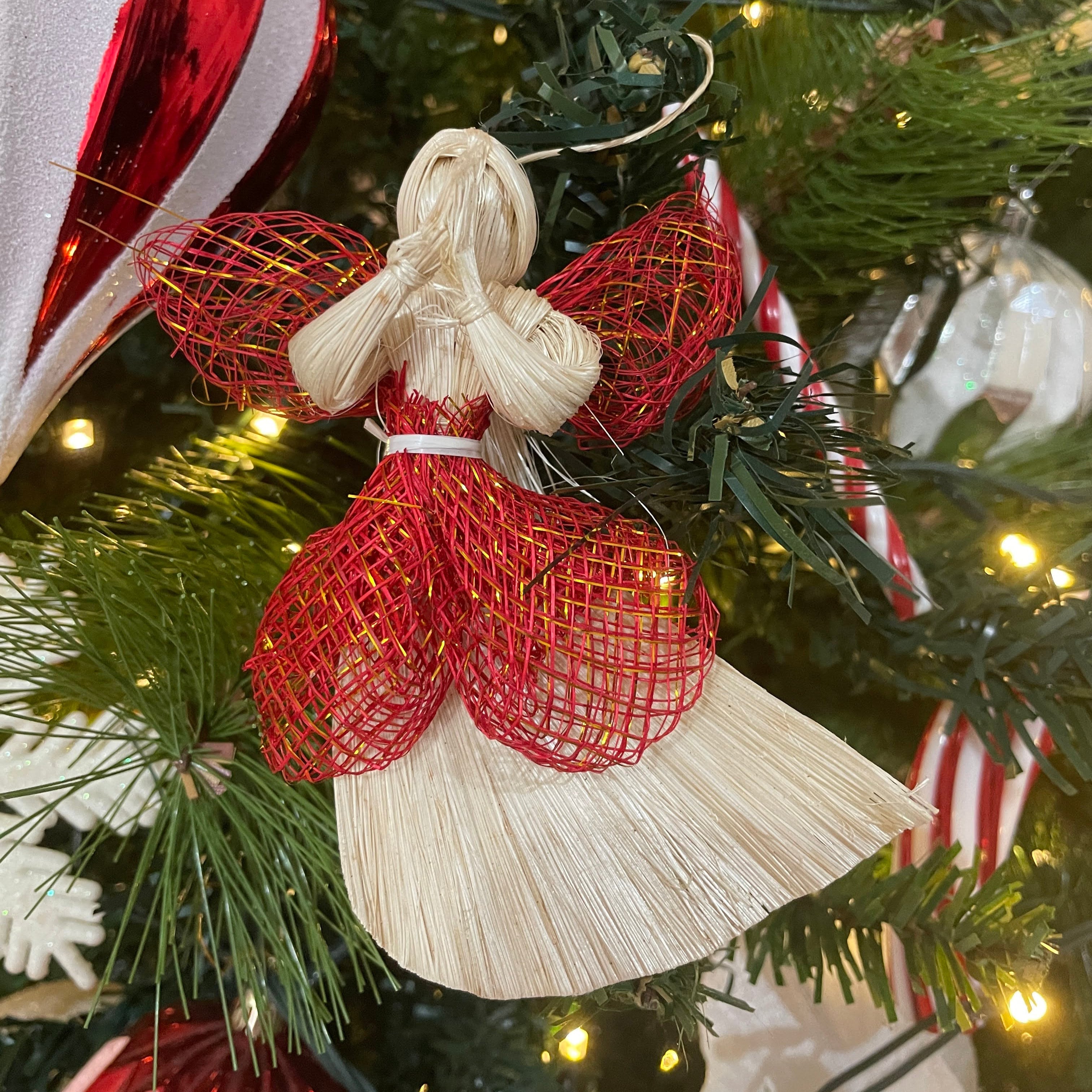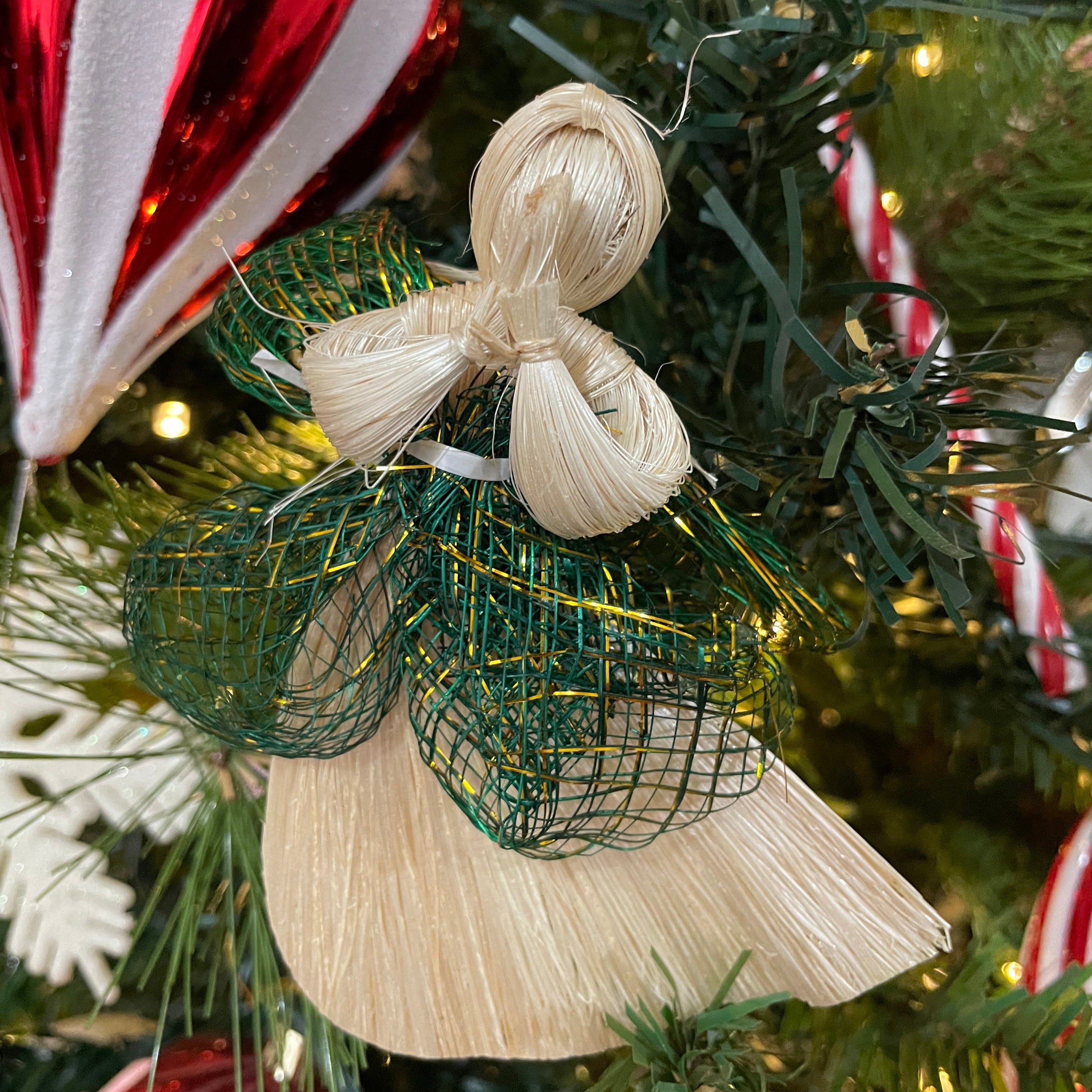 Elevate your holiday decor with this stunning Native abaca hanging angel. Its intricate details and delicate wings add a touch of elegance to your Christmas tree, wreath, or home.