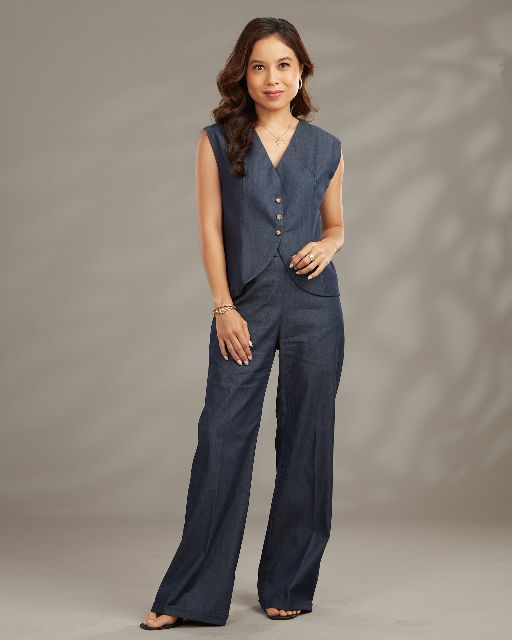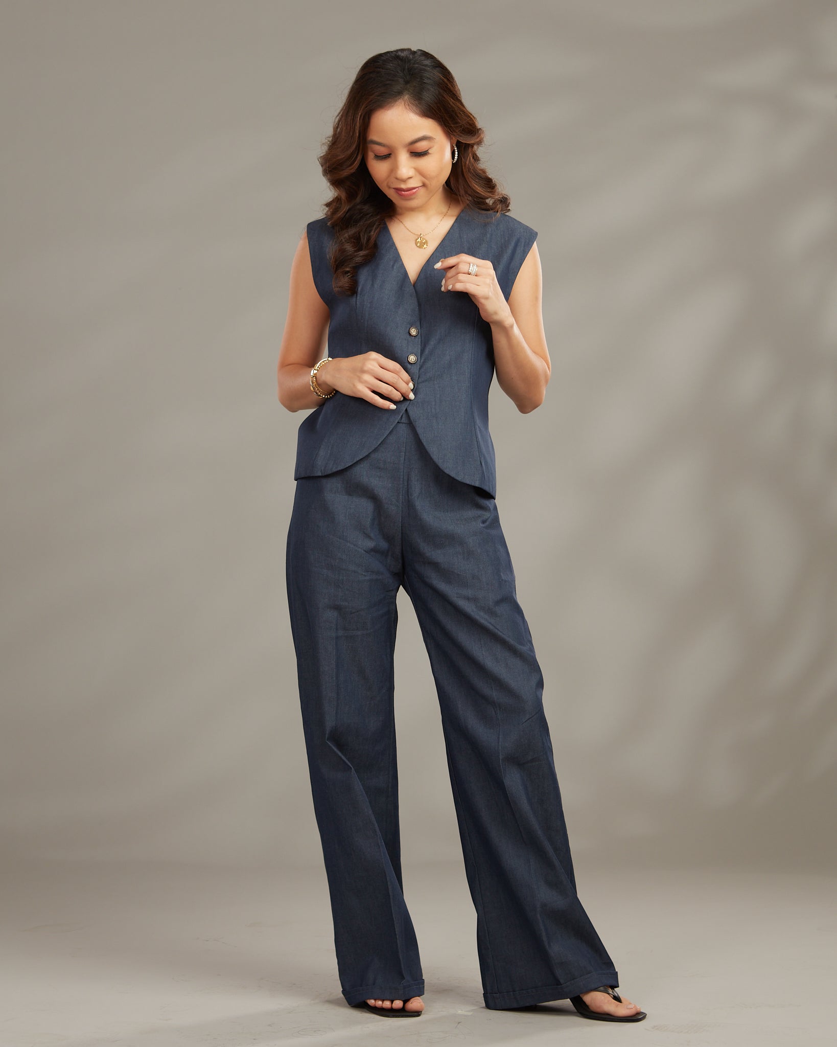 Size Guide Cielo vest S/M: Bust 35”, Hips 38” XS: -2” L: +2" XL: +4" Length: 18-19" across all sizes Palazzo pants S/M: Waist 28-29" gartered, good for hip size 37-38" Length: 38"