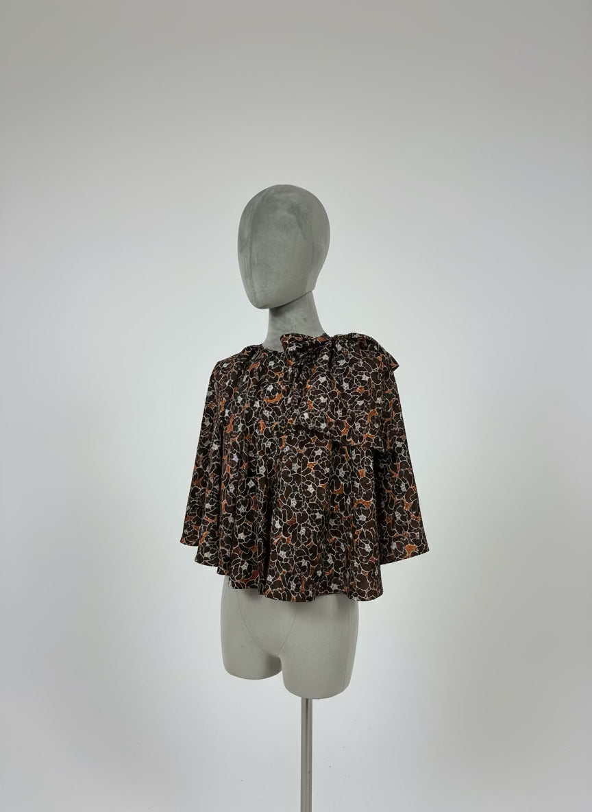 A floaty, feminine statement piece — the Circular Ribbon-Tie Silk Overlay Top is crafted from our signature brown floral silk and designed to elevate layering with effortless grace. With a soft drape and generous cut, this top is worn by simply slipping it over the head and tying the shoulder ribbon at the neck. Features: Fabric: 100% silk in our exclusive brown floral print — featherlight, breathable, and perfect for layering Construction: Circular-cut overlay with a free-flowing silhouette that lifts gently in the breeze Closure: Single ribbon tie at the shoulder/neck — adjustable and elegant How to Wear: Slip-on style (no armholes); designed to be worn over a bandeau, sports bra, or lace bralette for a hint of contrast when the wind catches the hem Pairing Tip: Best styled with our Shirred Waist-to-Hem Skirt with Front Buttoned Slit (made in the same brown floral silk) for a coordinated, head-turning ensemble Fit: One-size relaxed fit, ideal for layering and styling flexibility