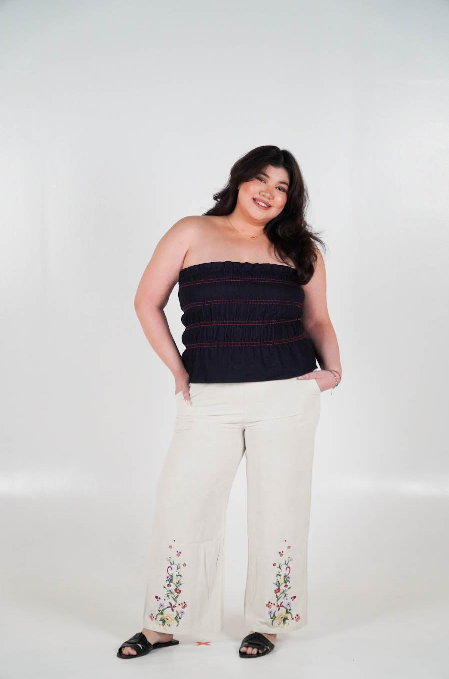 FEATURES:  Smocked soft denim top that blends casual charm with everyday versatility. Soft contrasting threads & garter that will provide a flattering fit while keeping it comfortable all day. Easy to style – pairs perfectly with skirts, trousers, or your favorite jeans.   SIZES: - Small: Fits XS–M- Medium: Fits M–XXLFABRIC: Soft Denim Model: 5'5" wearing Size S