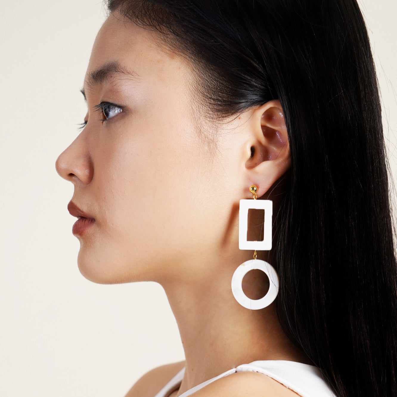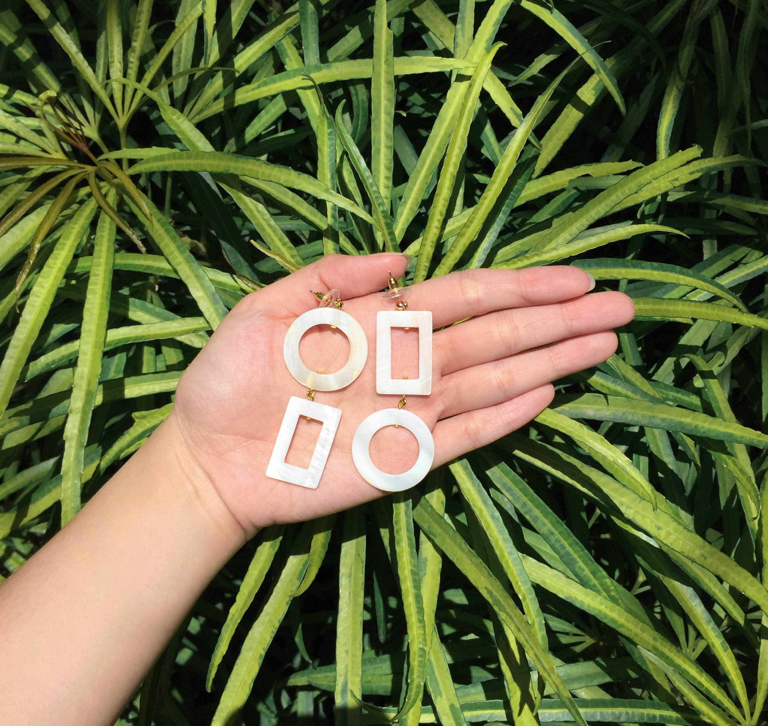 Handmade geometric earringsComponentsGold-plated studsMother of pearlDimensions3 inches in lengthLightweightDue to the handmade nature of our earrings, lengths and sizes may vary but very minimal.Note: Fragile- Do not drop from high distances, avoid applying pressure and always store in a flat hard container.