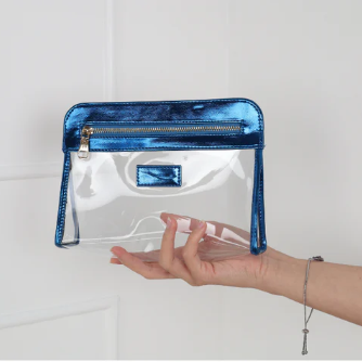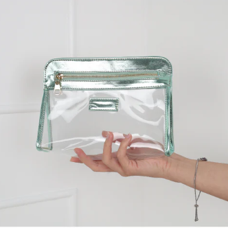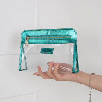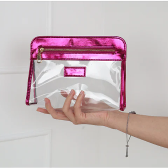 A stylish rectangular pouch with a clear pvc body, perfect for easily viewing the contents inside. Spacious enough for cosmetics, travel essentials or everyday accessories.