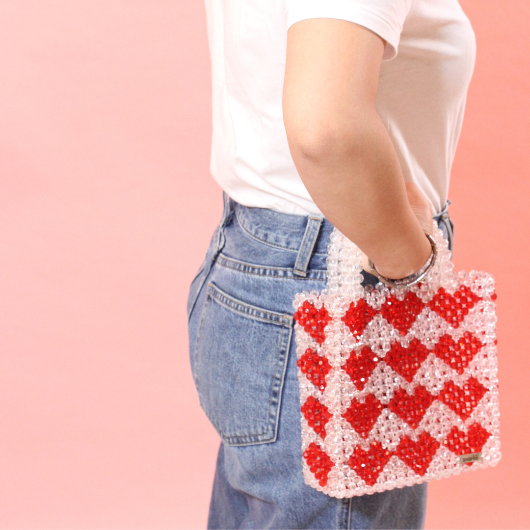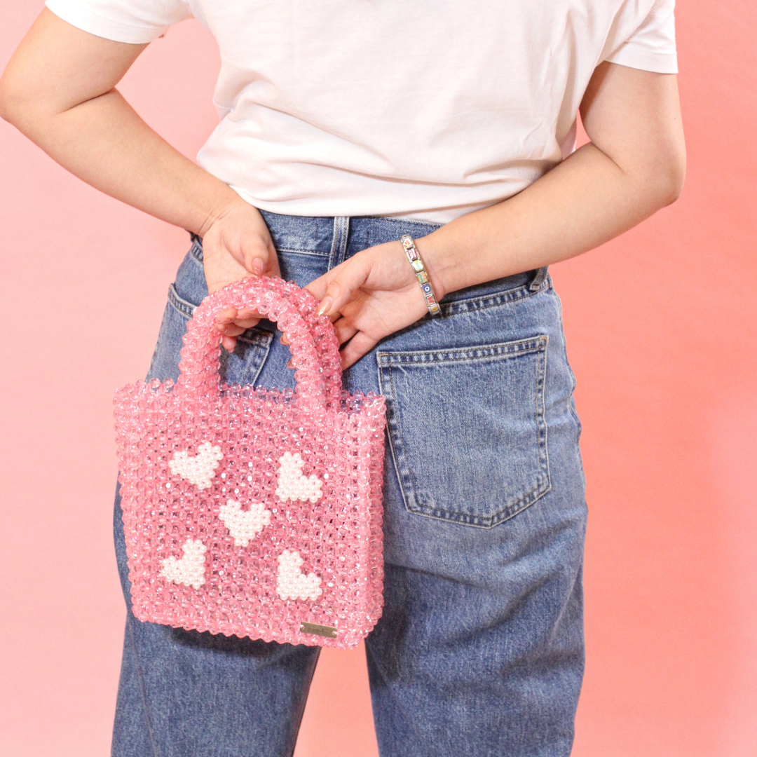Beaded Bags with Heart Patterns: Cupid and PsycheMade in the PhilippinesCupid: light pink crystal beads with "3D" pearl heart details on one side of the bag onlyPsyche: clear crystal beads with red crystal heart patterns on both sides of the bagsMeasurements: 7 inches (Length) x 3 inches (Width) x 7 inches (Height)