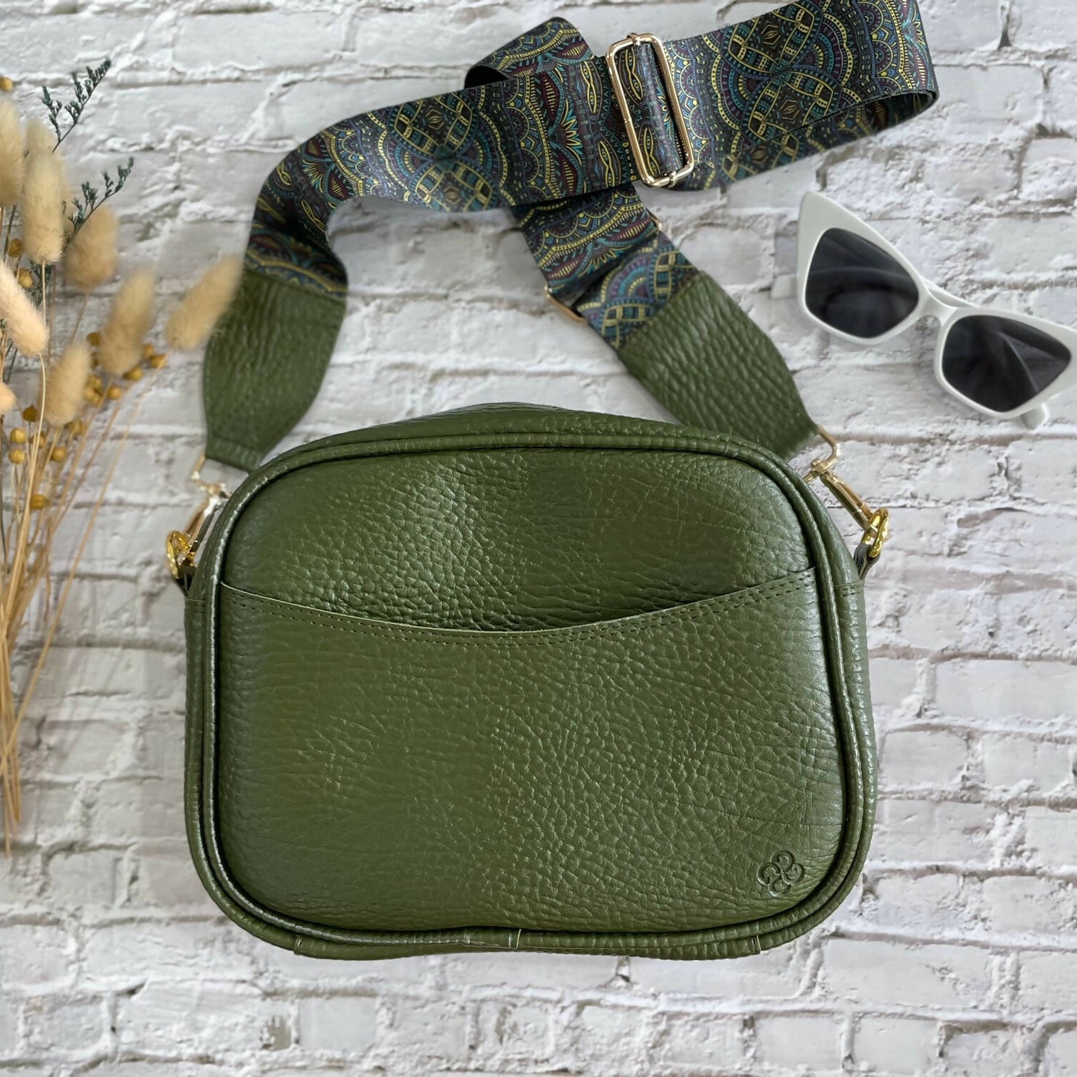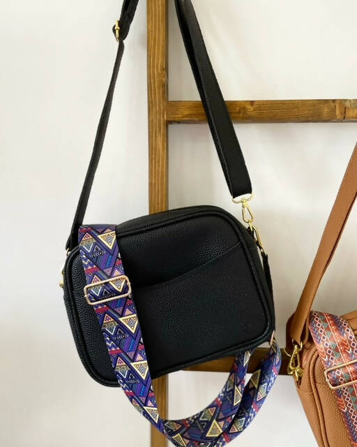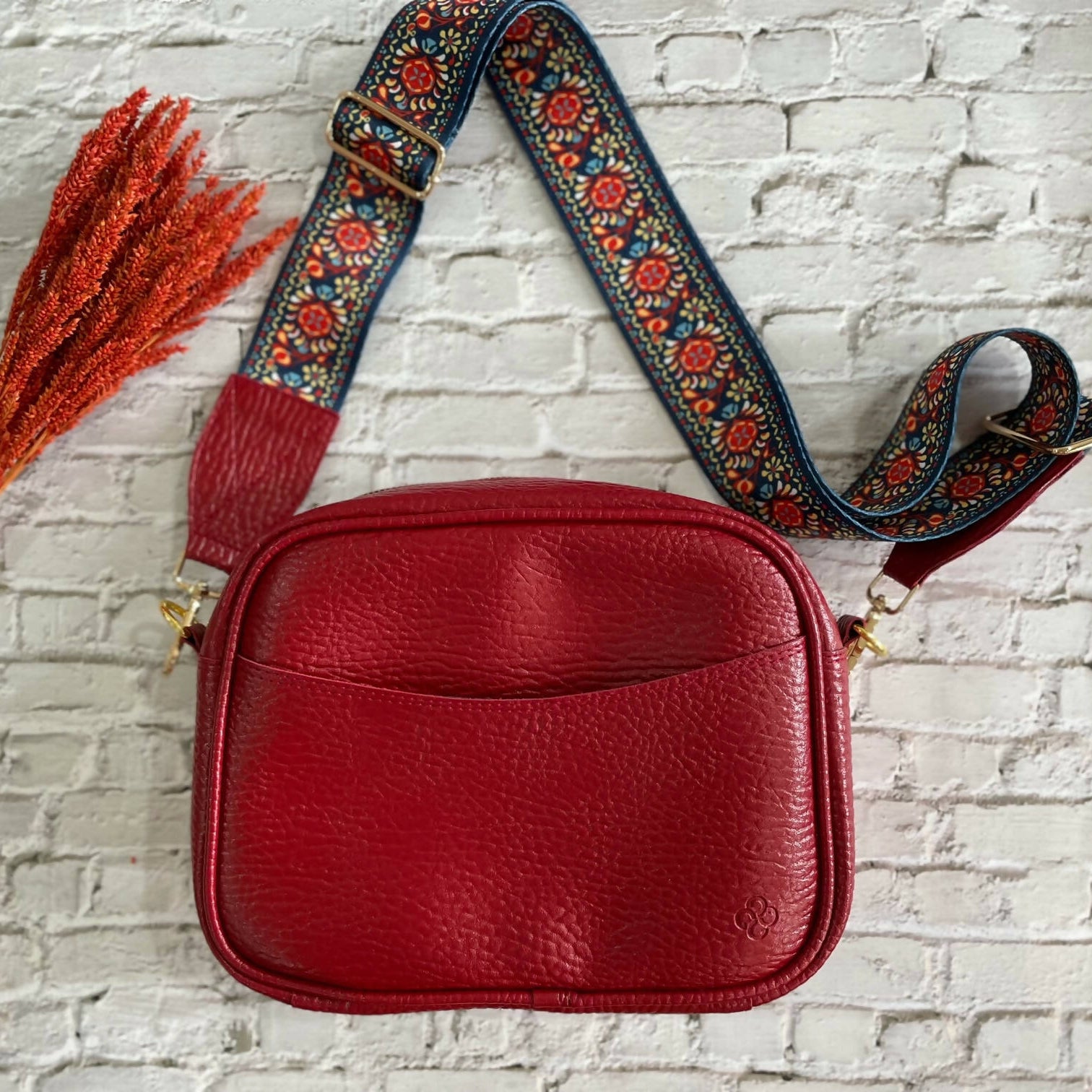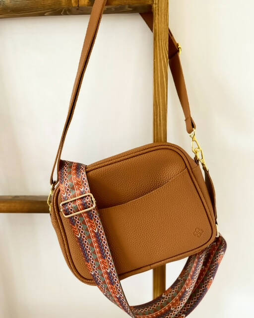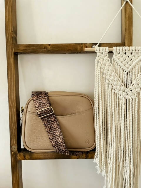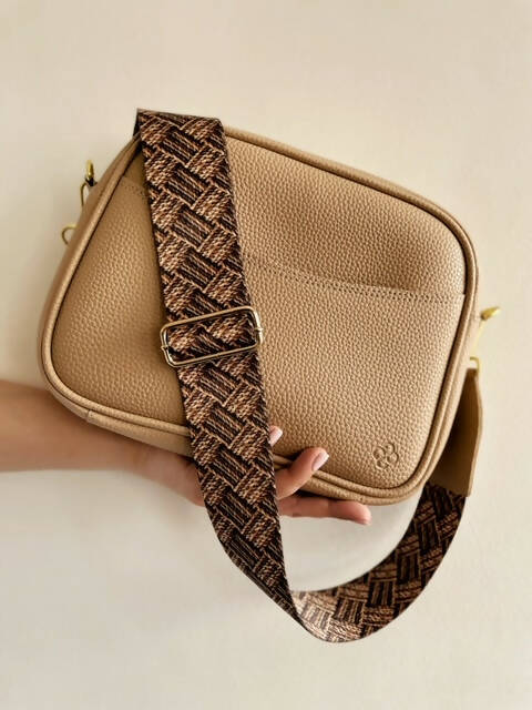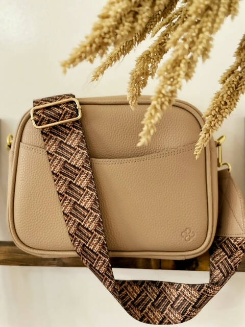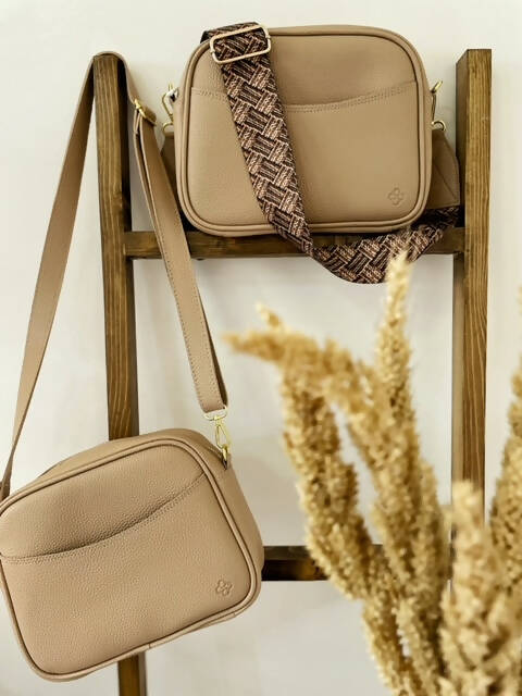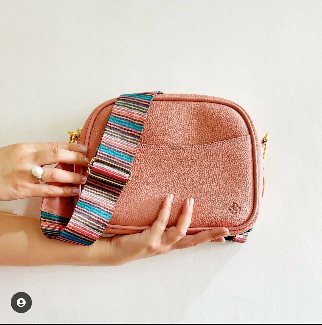 8" x 10" x 3" HLWComes with an additional leather strap for more versatility.Lightweight. Roomy. ChicWide straps for extra comfortAdjustable and Detachable strapsCan fit long wallets and foldable umbrellaFits 330ml spray bottles too!