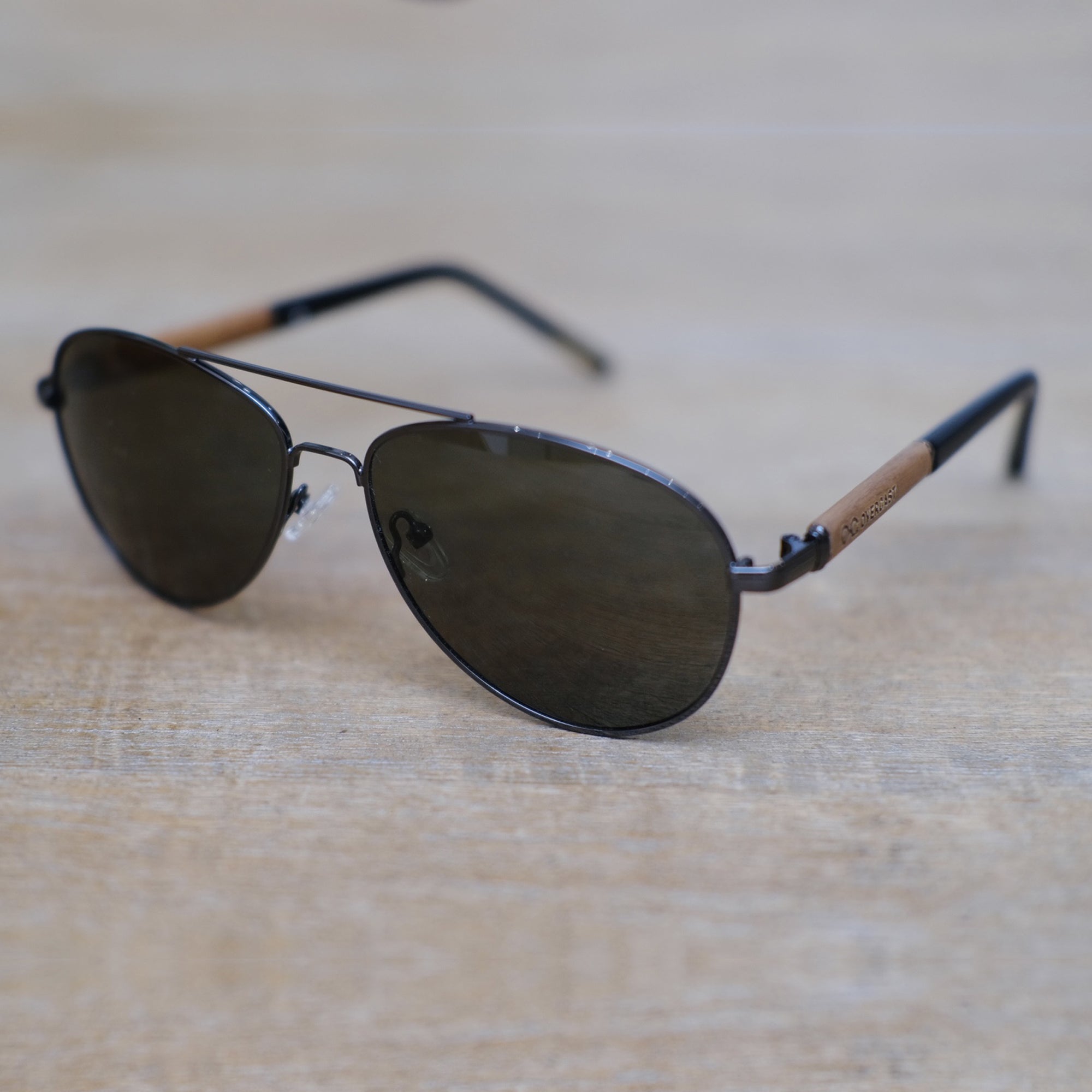 A unique combination of natural wood and metal frame featuring a double-bar bridge, metal spring hinges, silicone nose pads, acetate end caps and G15 polarized lenses with built-in UV400 protection.Lens 58 mm | Bridge -18 mm | Temple -150 mm