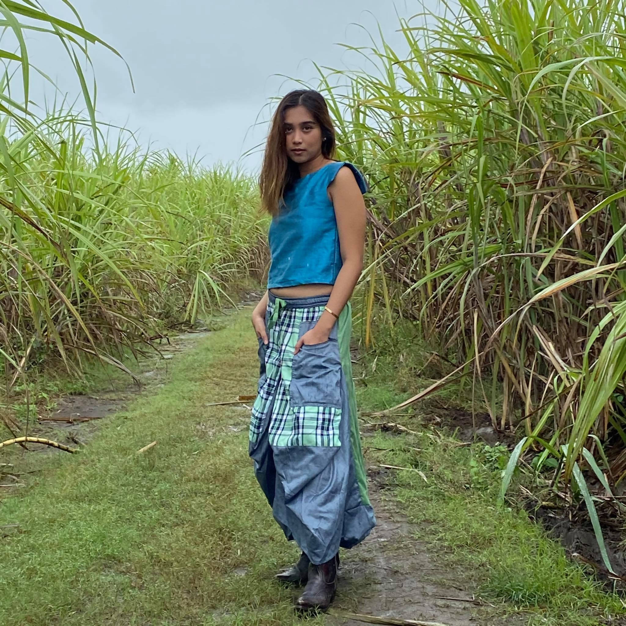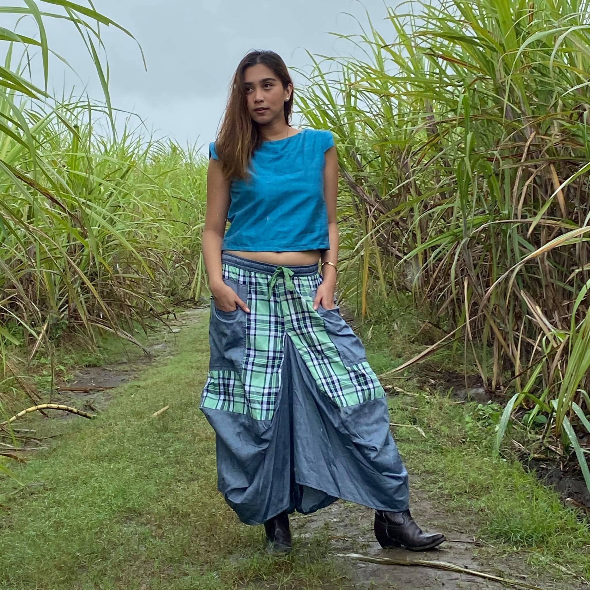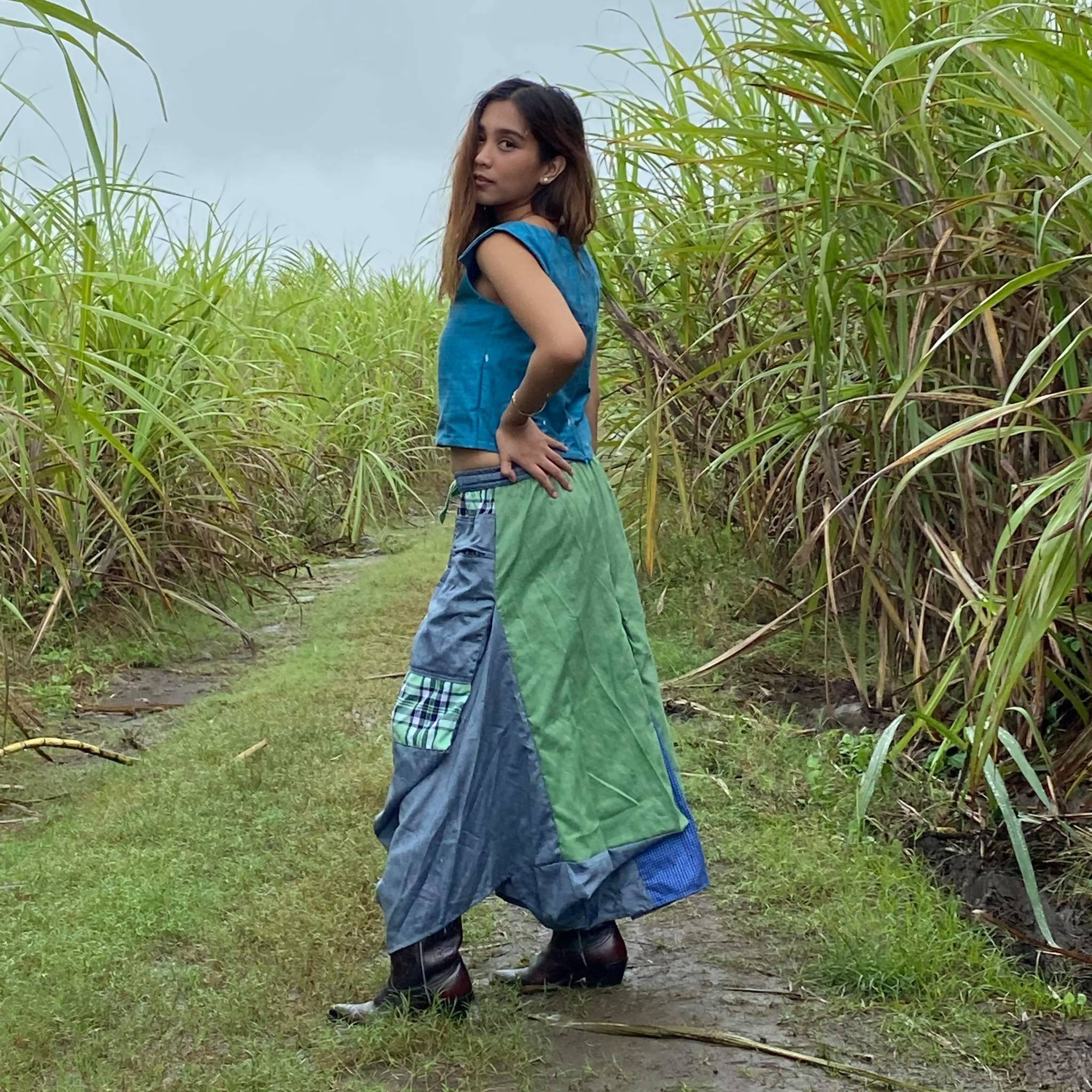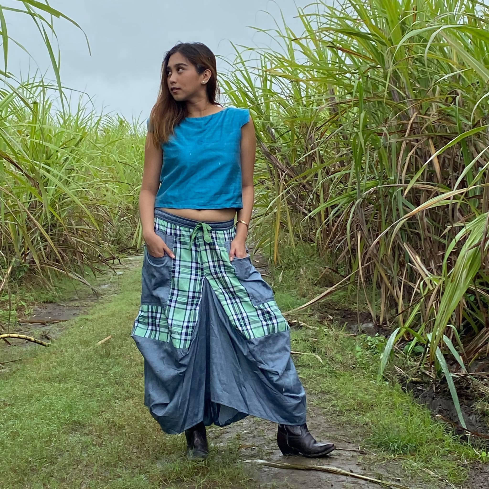 An eclectic outfit presents Deb, 100% handwoven by Negros Island Weavers.  A unique clothing match that Vida Hayes styled using upcycled fabric to finish a cool look.
