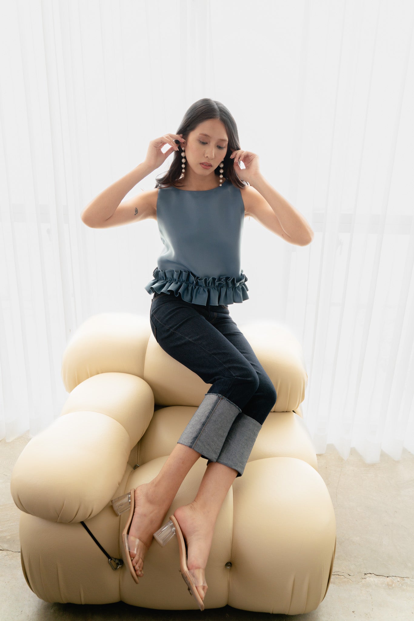 Elevate your wardrobe with the Demi Ruffle Top, designed with a back zipper for easy wear. It's made from duchess and organza fabric. It also features dainty ruffles along the hem for a subtle yet stylish statement. Available in white and steel blue for a chic and comfortable look.