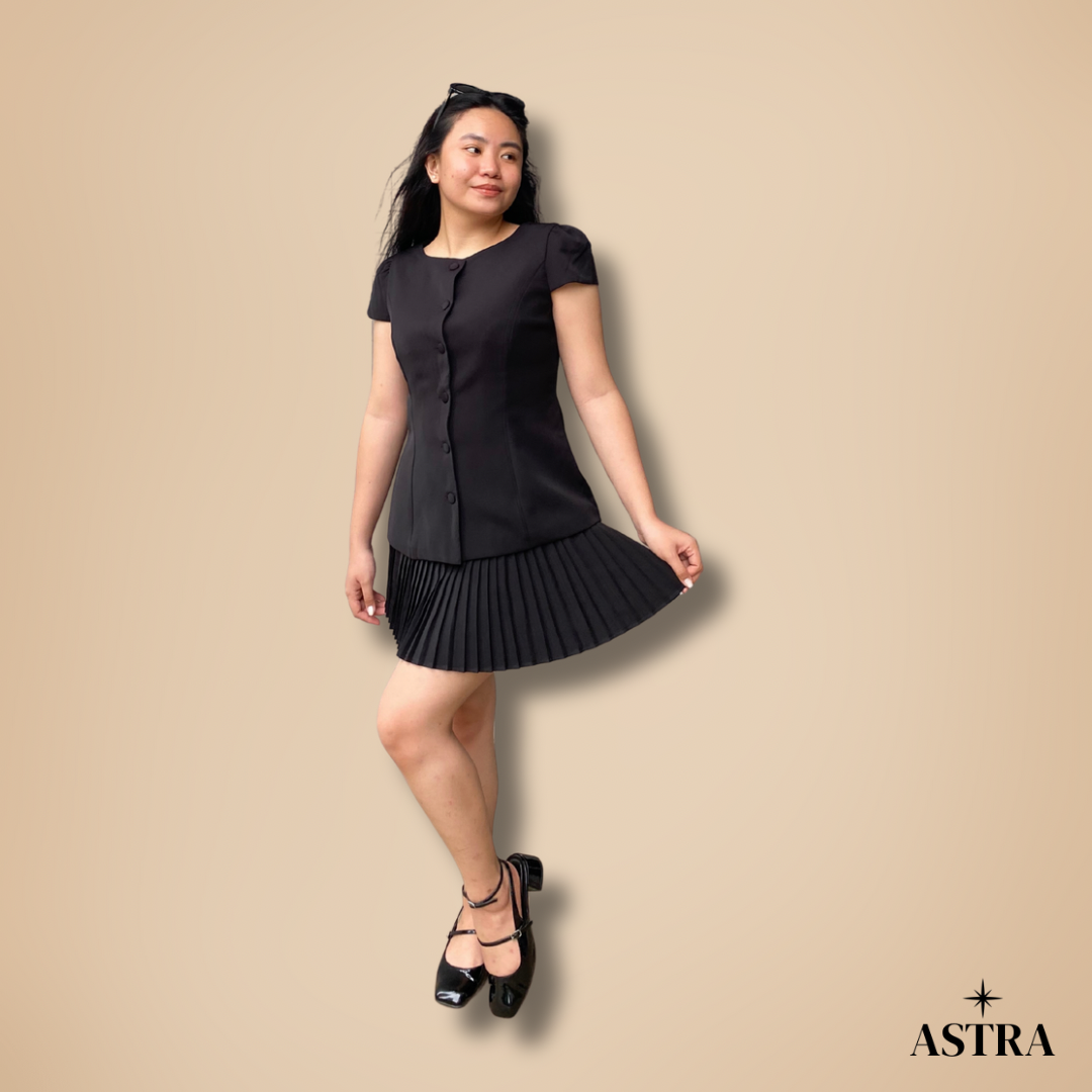 A fitted black short-sleeve top with a button-down front and subtle tailoring through the waist, paired with a black pleated mini skirt. The look is finished with black closed-toe heels with ankle straps. The outfit feels classic and feminine, with clean lines and a slightly structured silhouette.