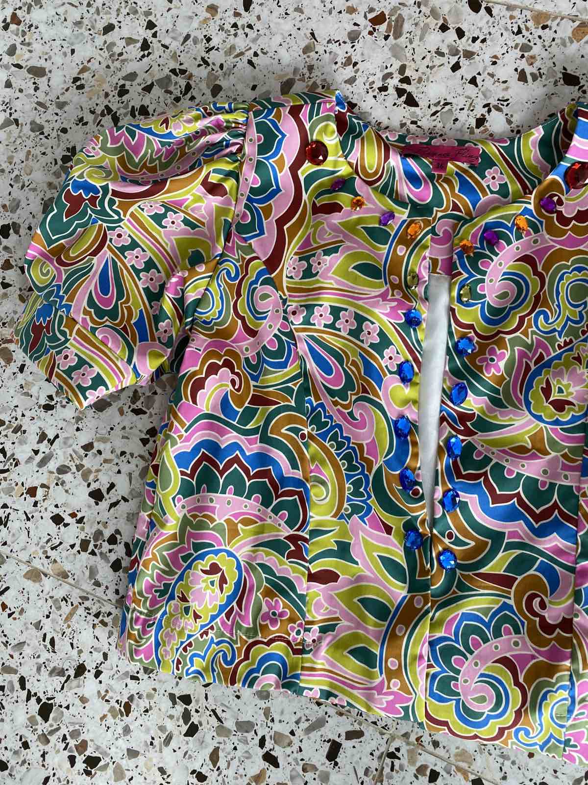 A new print of our best-selling Diego Bolero. Vibrant colors in swirling patterns with rhinestone attachments . What a unique style!