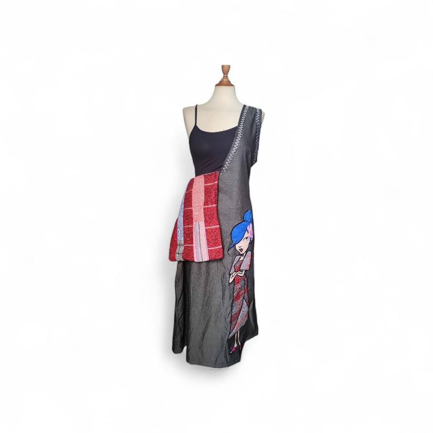 One shoulder dress with bag attached.