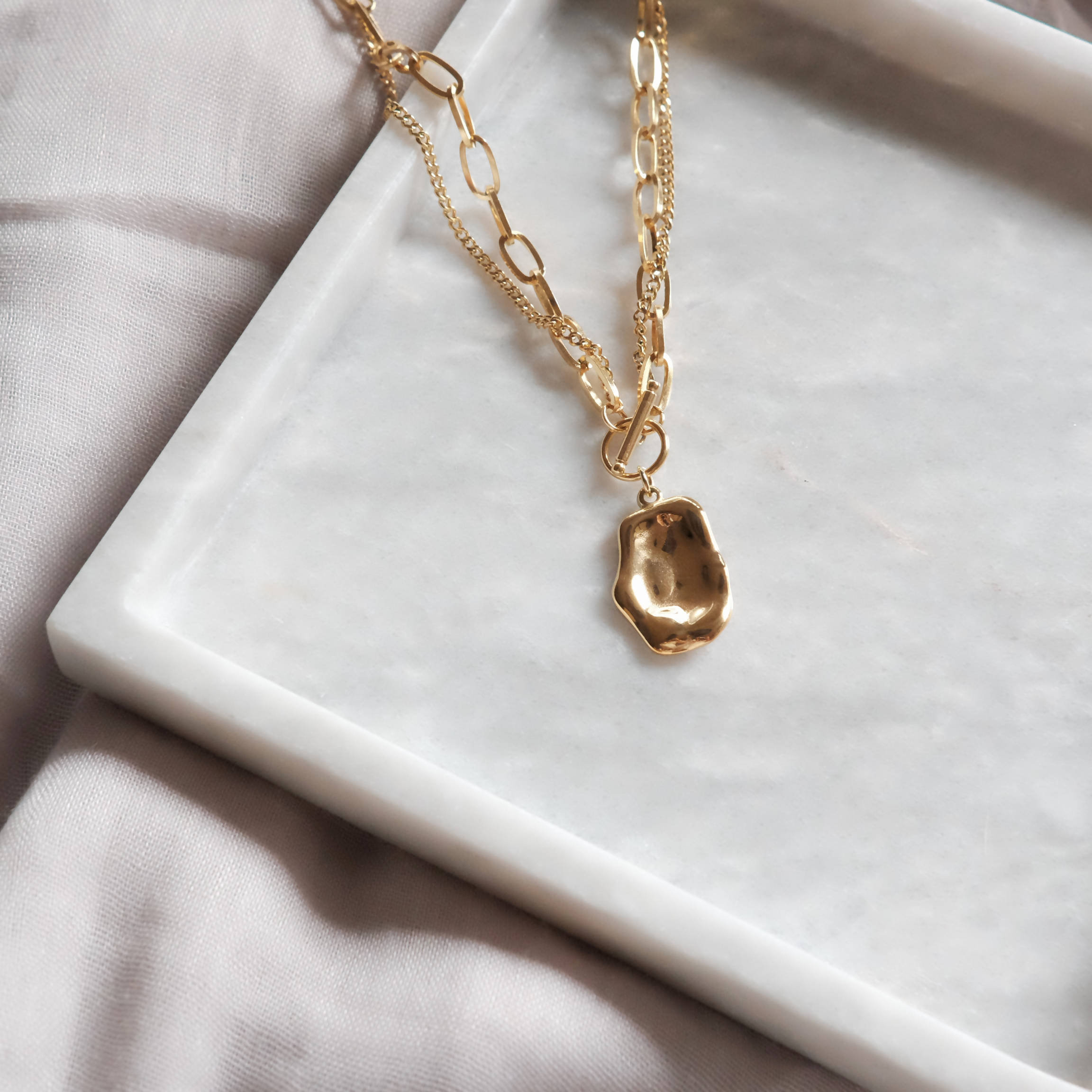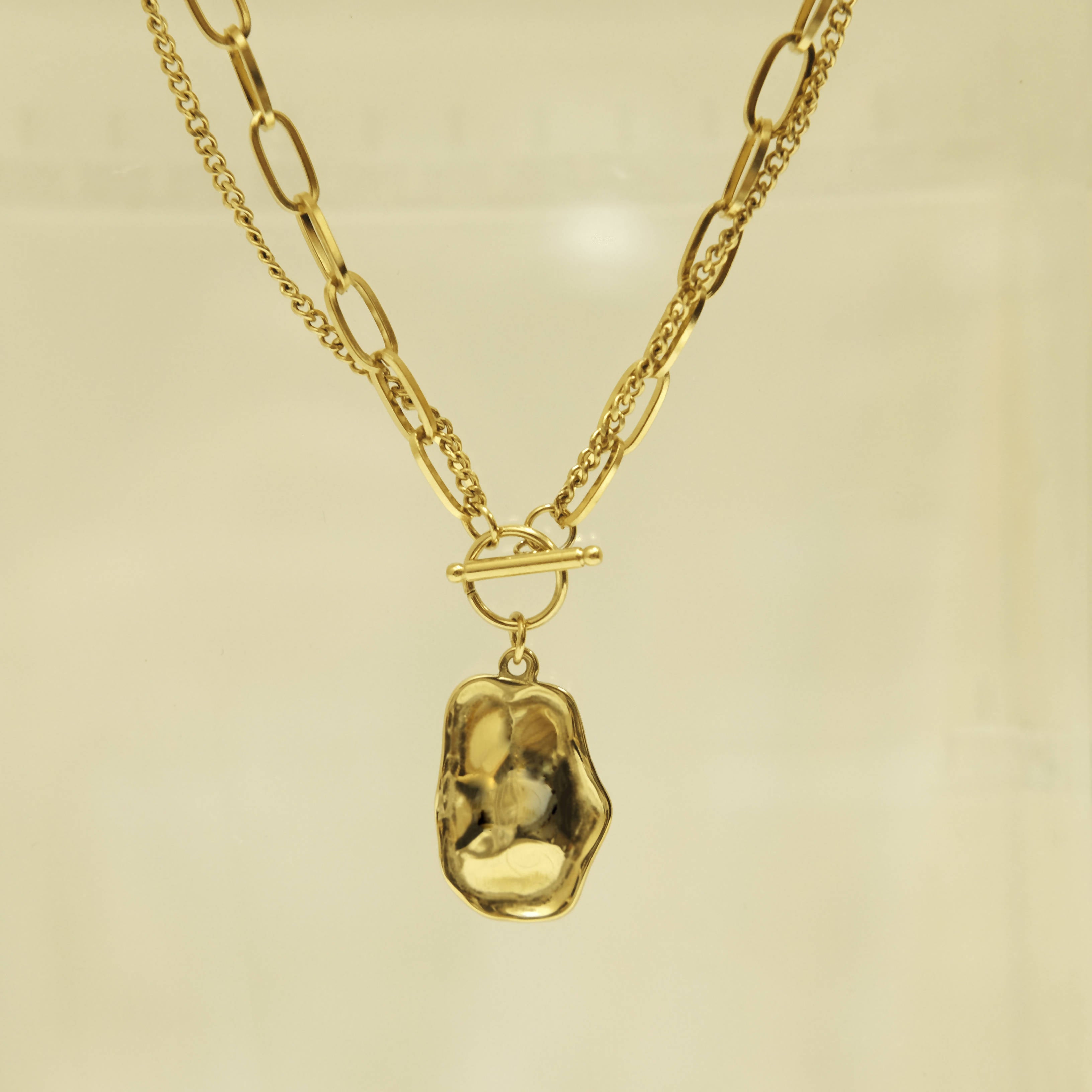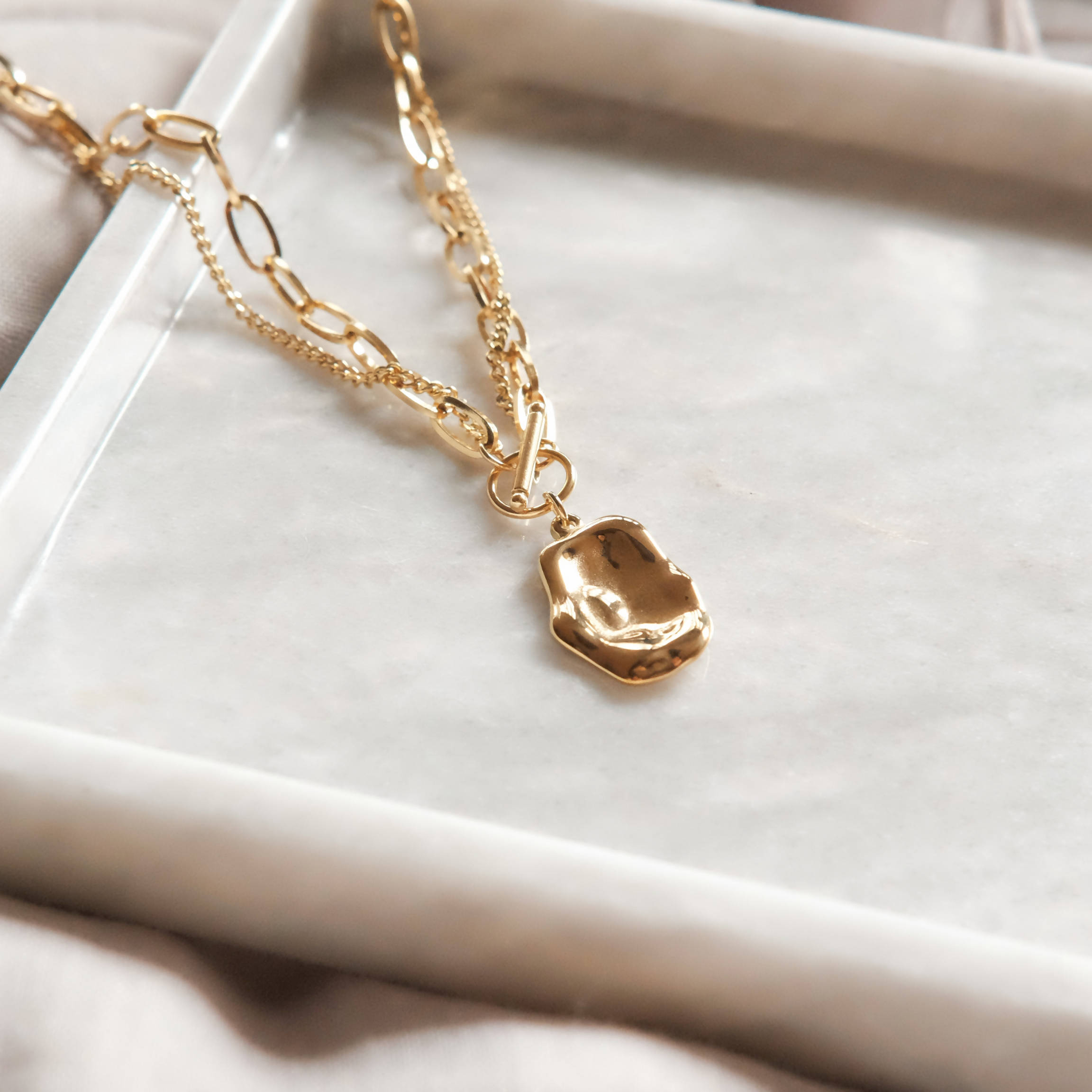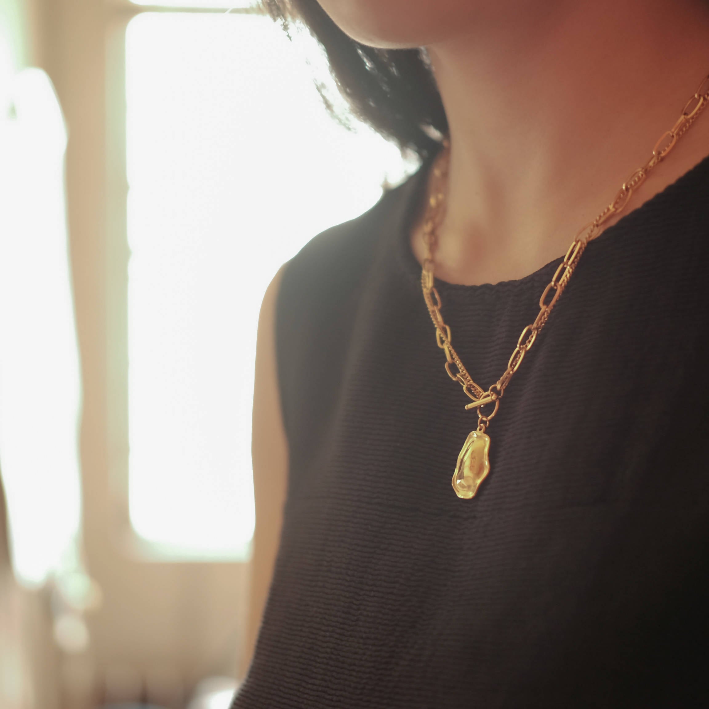 Charming, odd-shaped pendant catches the light from any angle. This piece combines two types of chains and features an easy-to-wear toggle lock, an effortless approach to sophisticated style!