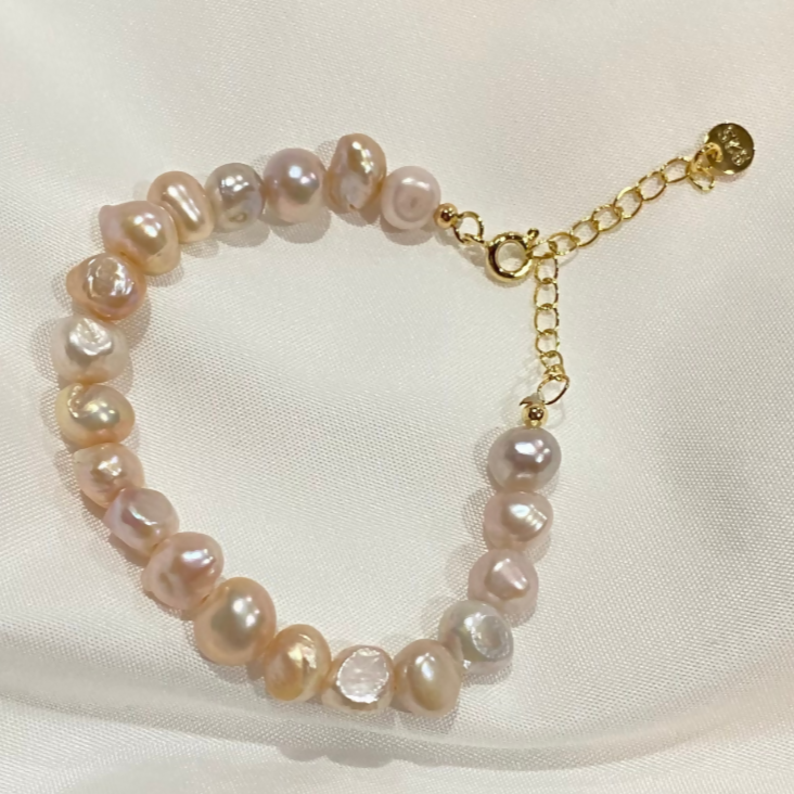 Freshwater Pearl Bracelet Material: Gold Plated Lock Length: 8 inches (adjustable) Shape: Semi-Round Size: 9-10 mm