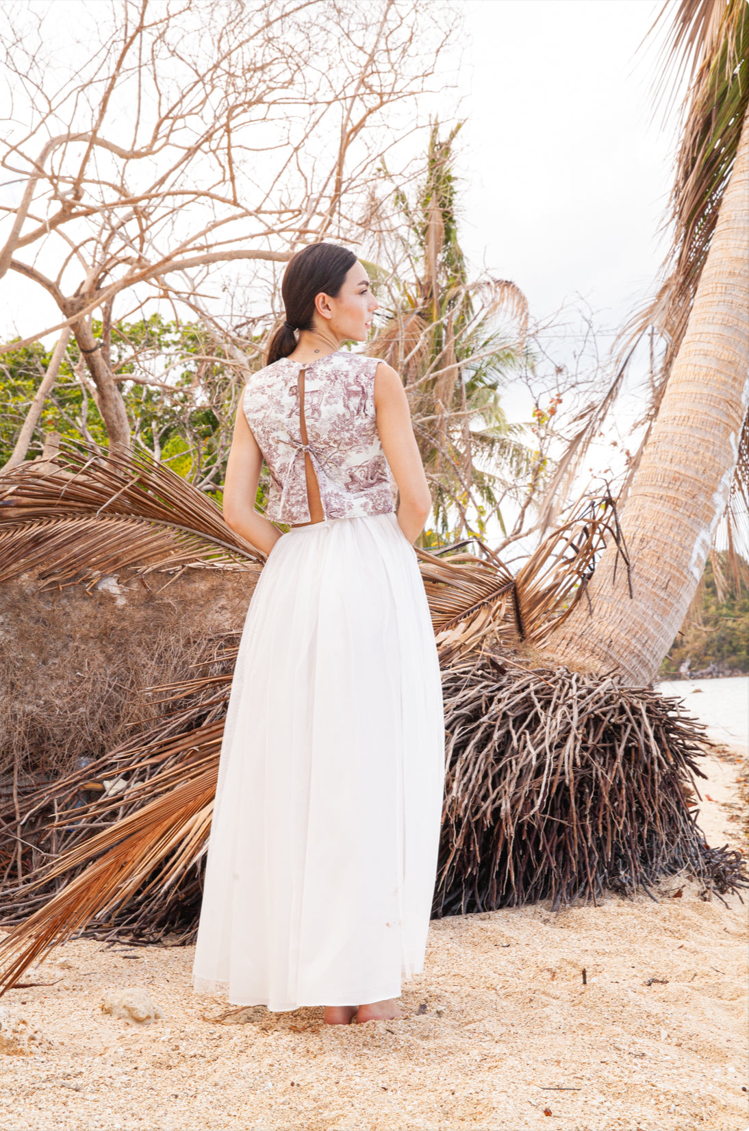 Open Back detail with single button for back closure and tie back ribbon for additional closure using printed canvas fabric.