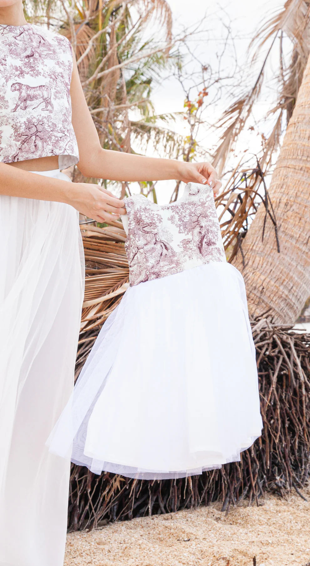 A classic Unaricci favorite for both mom and daughter — this sleeveless top, crafted from maroon lion-printed canvas, pairs beautifully with a voluminous white tulle balloon skirt.  A charming elegance and timeless design. Size Chart:Age      Chest     Waist     Sh - Waist     Hips     Skirt Length2-3yo     22 1/2"     20 1/2"     7 3/4"     Free Size     12 1/4"4-5yo     24 1/2"     23 1/2"     8 1/4"     Free Size     17"6-7yo     26 1/2"     24"     9 3/4"     Free Size     20 1/2"7-8yo     27 1/2"     26"     10"     Free Size     22"9-10yo     28 1/2"     26"     10 3/4"     Free Size     33 1/2"11-12yo     29 1/2"     27"     11 1/4"     Free Size     35"
