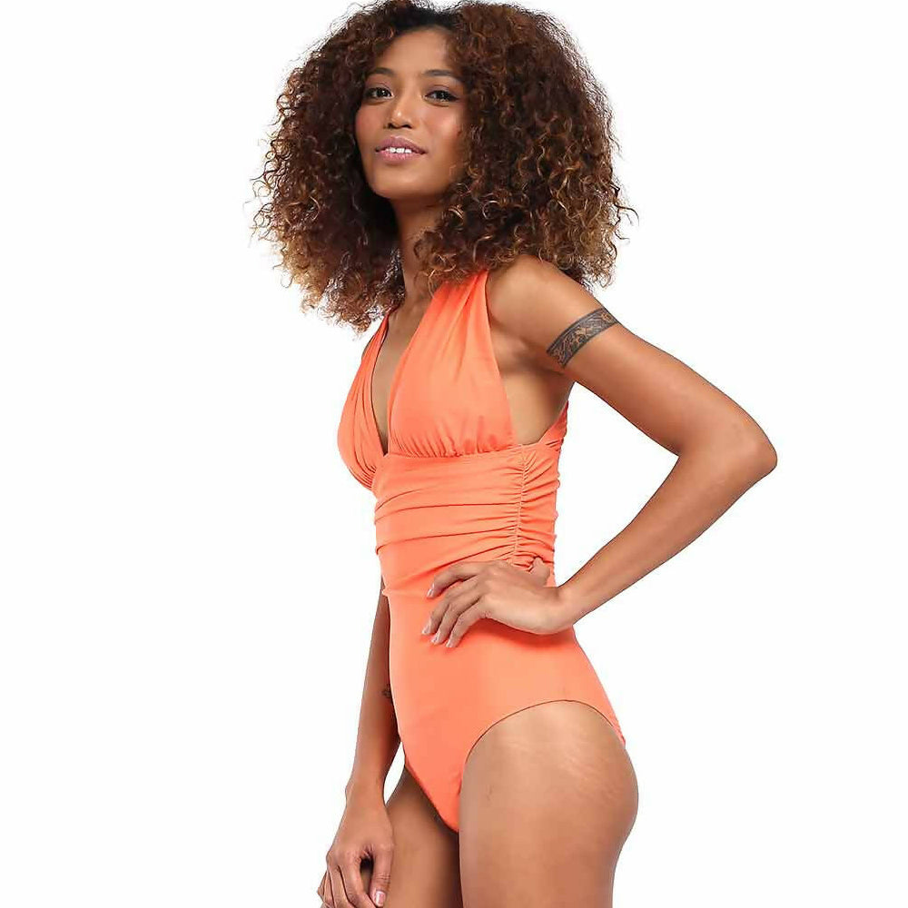 Designed to be worn two ways. It's like having two swimsuits for the price of one. Ethel one piece suit has a shirred waist design that gives a slimming effect on your tummy area. It has a classic cut bottom which makes this suit perfect for swimming, surfing or lounging. Dress it up or dress it down whichever you like. A classic design that will never go out of style.