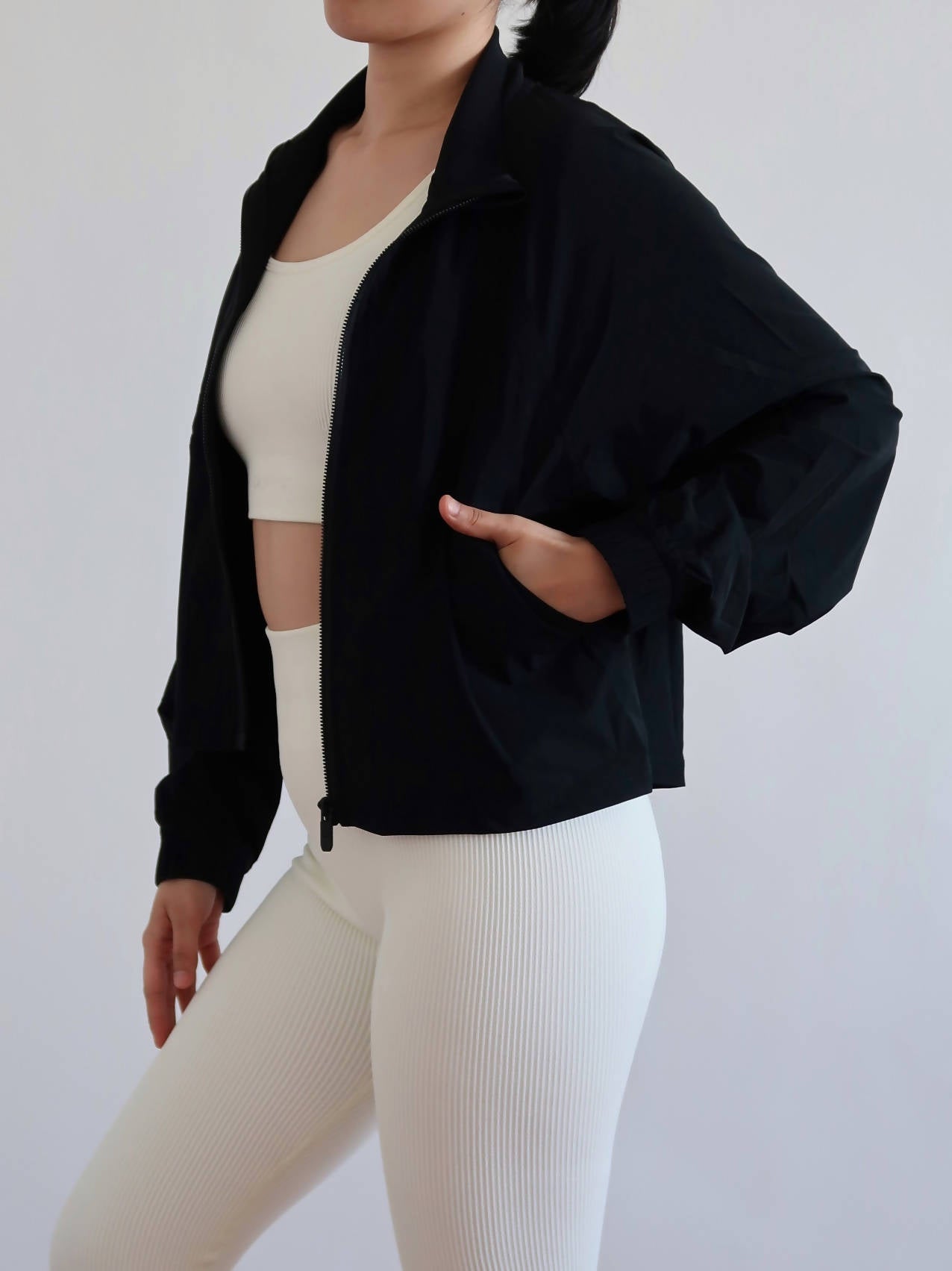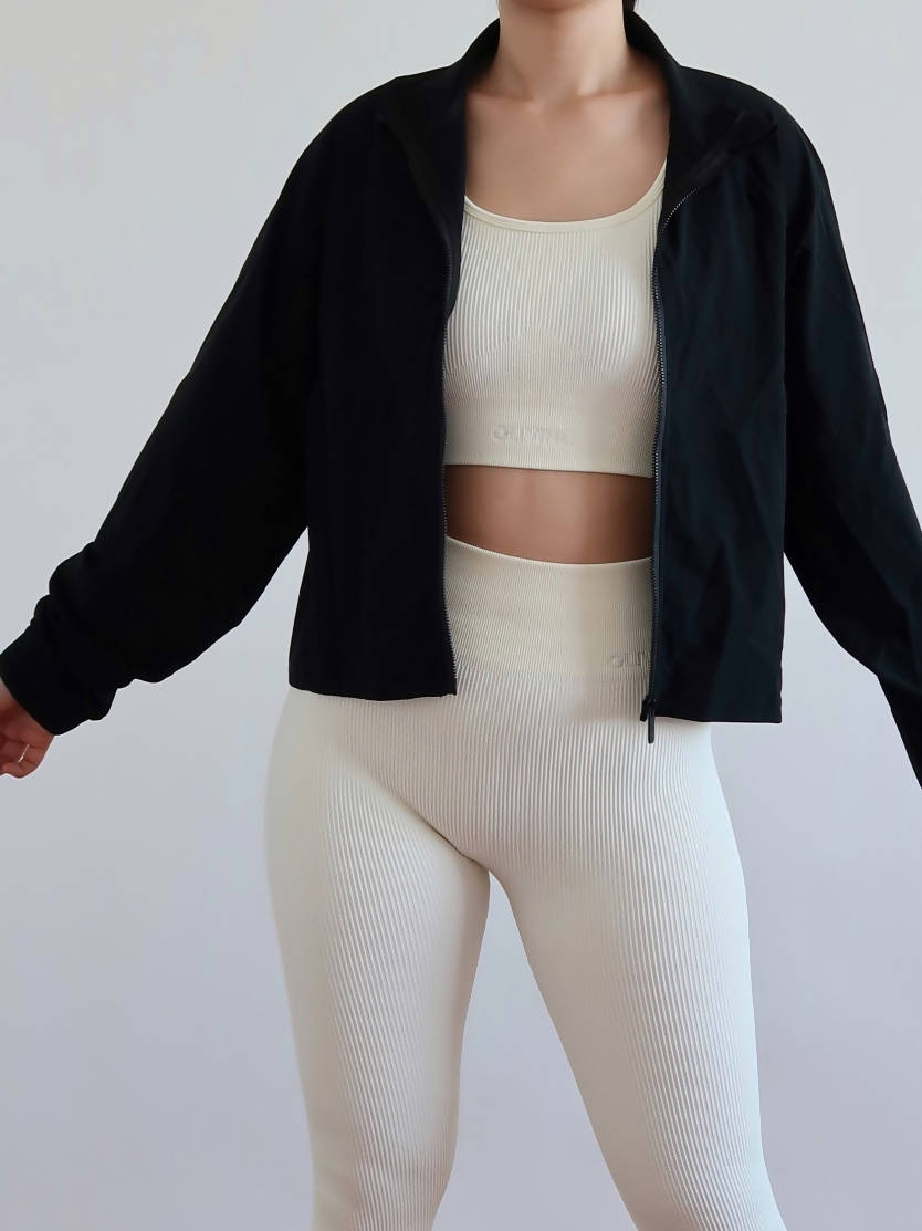 Made with feel good, breathable, soft and smooth material. You can literally wear this jacket from day to night all year round. Classic hip length Relaxed fit Designed for a comfortable everyday wear Two side pockets Full zip with chin guard Model's measurements are 34 Bust, 26 waist, 37 hips wearing Medium Available in 4 colors (Snow, Dune, Onyx, Sky) Size Chart Bust (in) Small 30-36 Medium 34-38 Large 36-40 X-Large 38-42