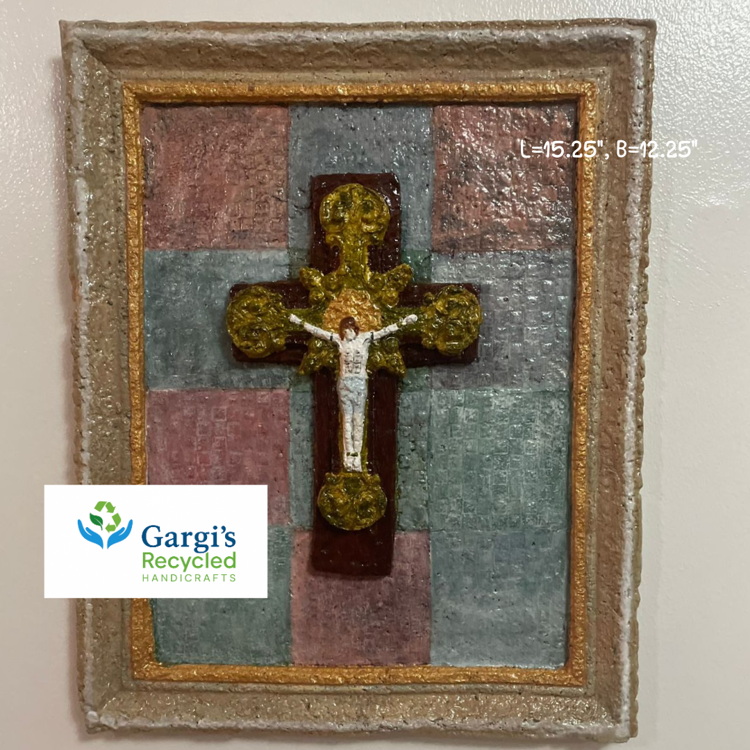 This handcrafted crucifix wall frame (L=15.25”, B=12.25”) is entirely made from shredded paper, patiently transformed into a textured, vibrant piece of sacred art. Every detail, from the patterned background to the raised frame, is molded and finished by hand, carrying both devotion and sustainability. The shimmering gold accents, and pastel shades highlight the central figure of Christ, radiating peace and light. No. The day we choose recycled over the numerous options, that day would truly mean honoring both faith and the planet, preserving beauty while protecting creation.