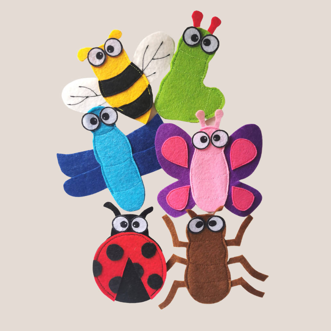 Provide opportunities for children to include these colorful insect finger puppets in their simple conversations.