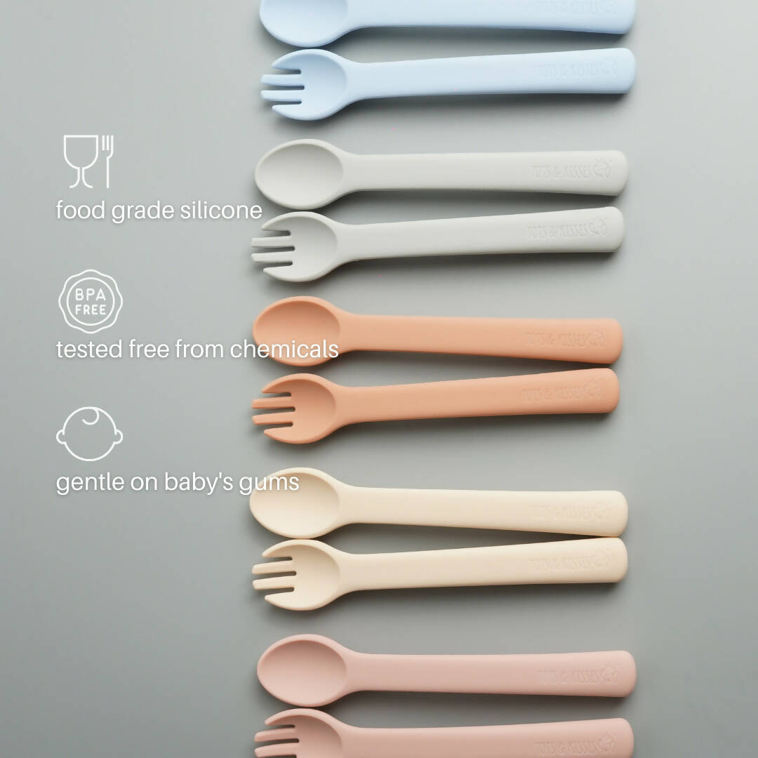 We all get it, our precious little ones want to take charge as soon as they're ready and cleared for solids. So we bring you this first spoon and fork set, made from 100% safe, tested, food-grade silicone.