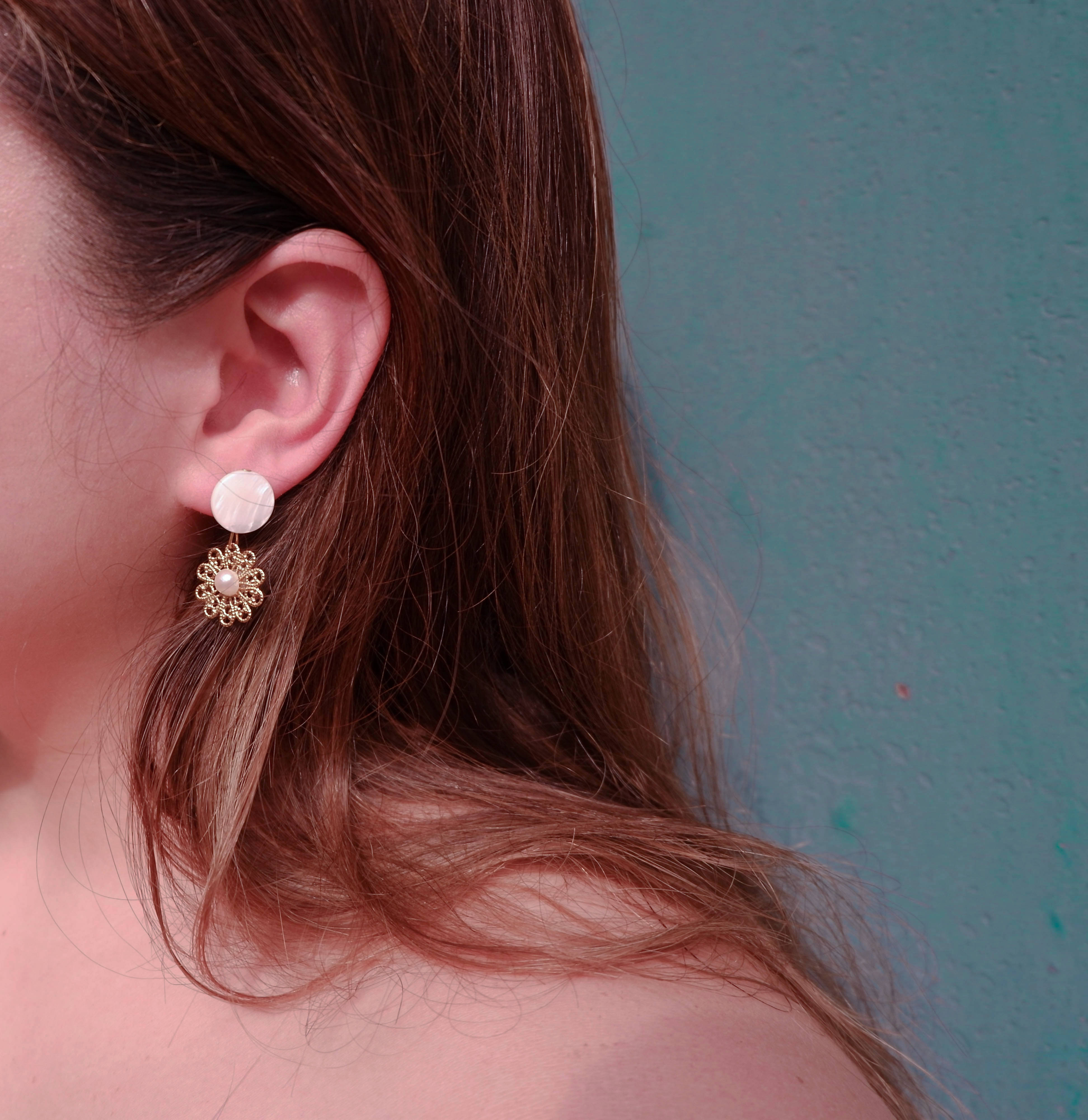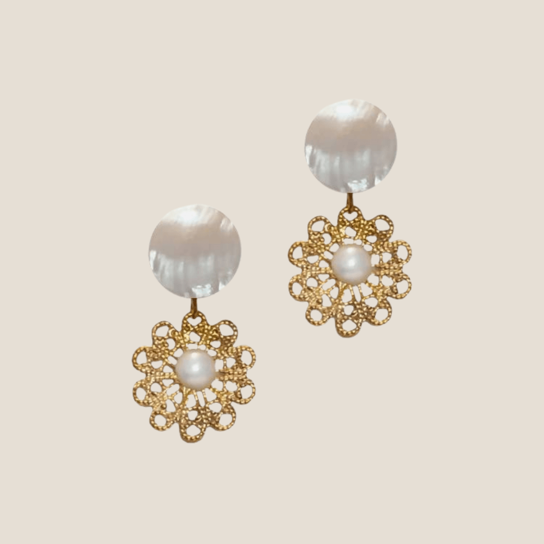 Handmade drop earrings     Components Brass Mother of pearl South sea pearls     Dimensions 1.5 inches in length Lightweight     Due to the handmade nature of our earrings, lengths and sizes may vary but very minimal.   Note: Pearls are baroque- naturally irregularly shaped and may not exactly match as a pair. Expect differences in shape, texture, coloration and size.