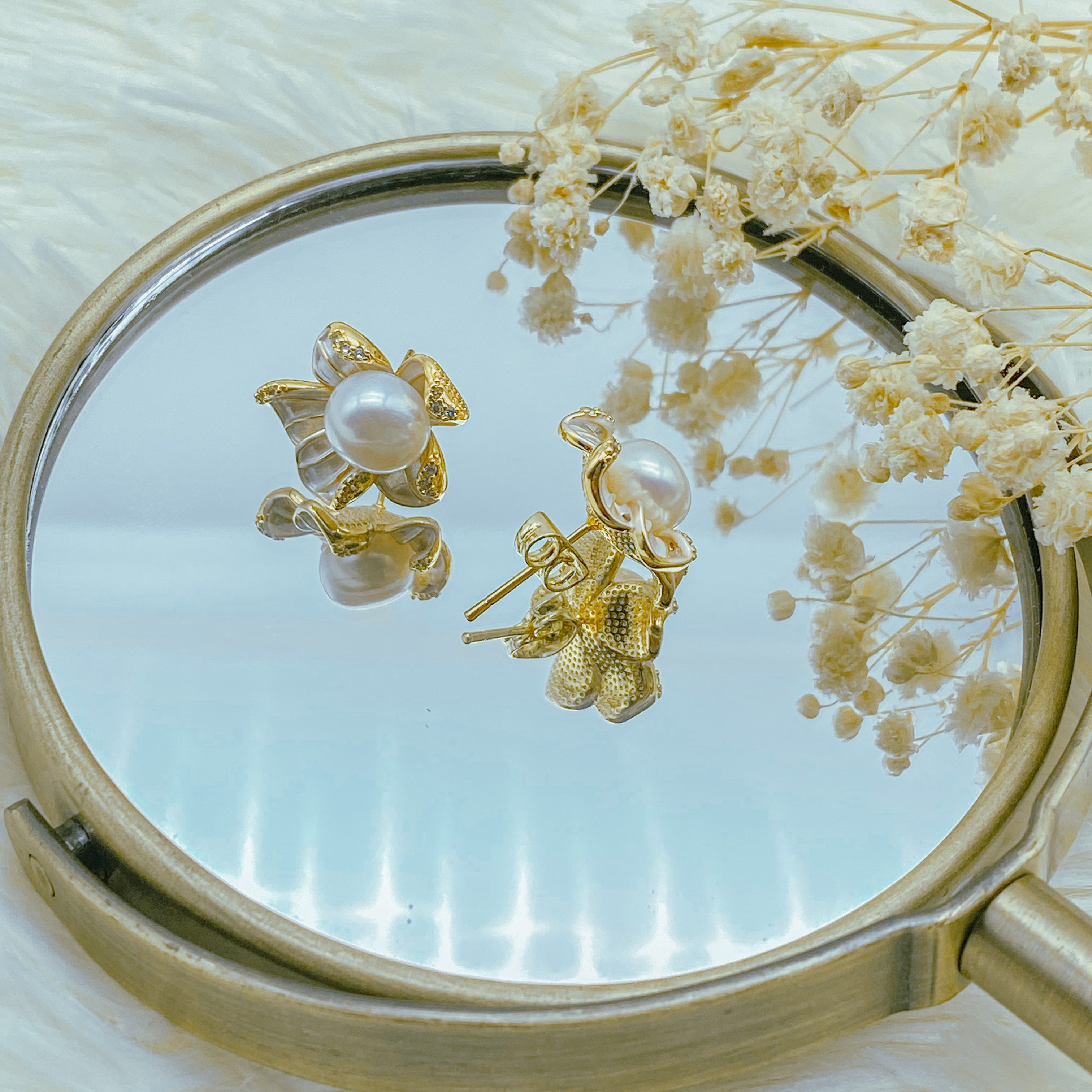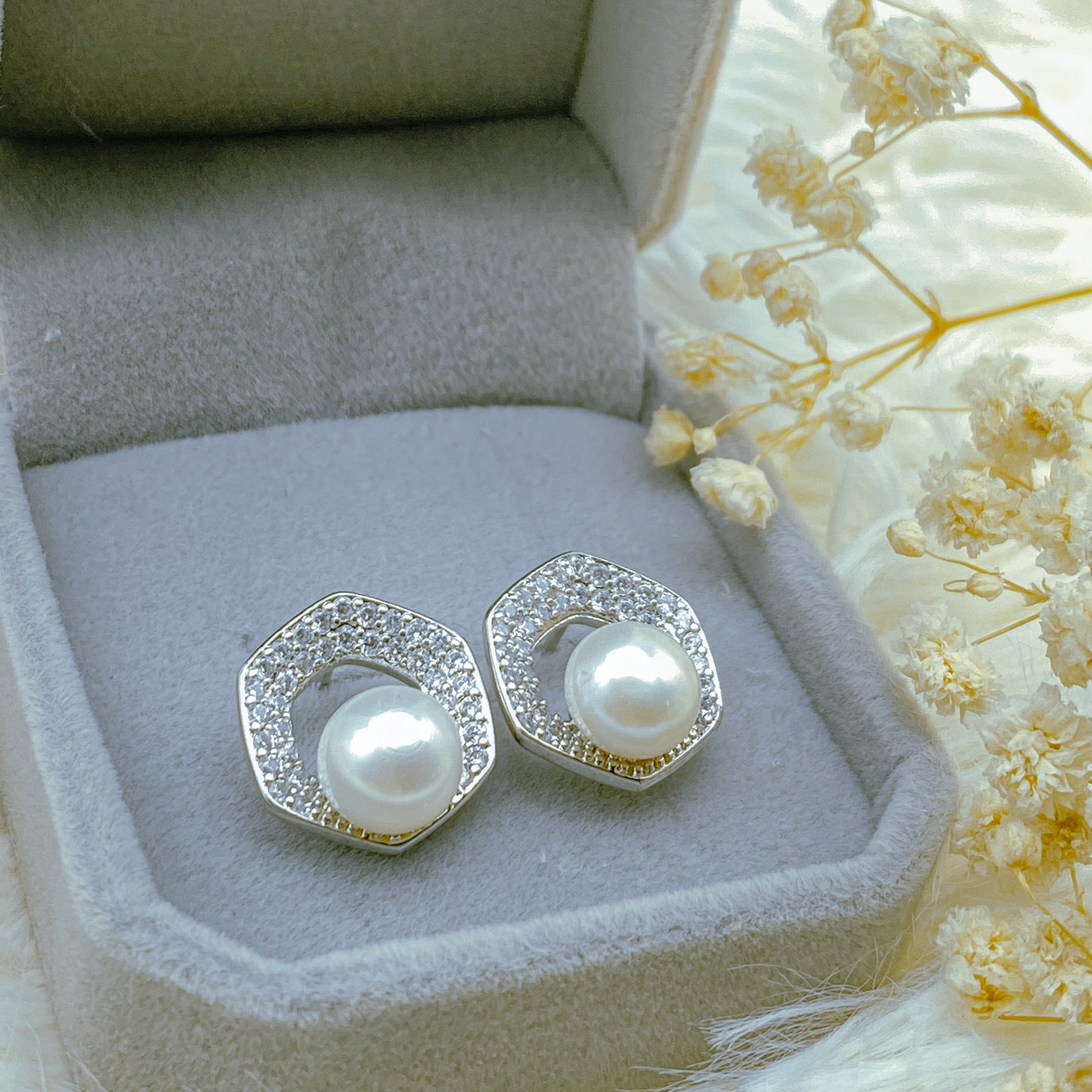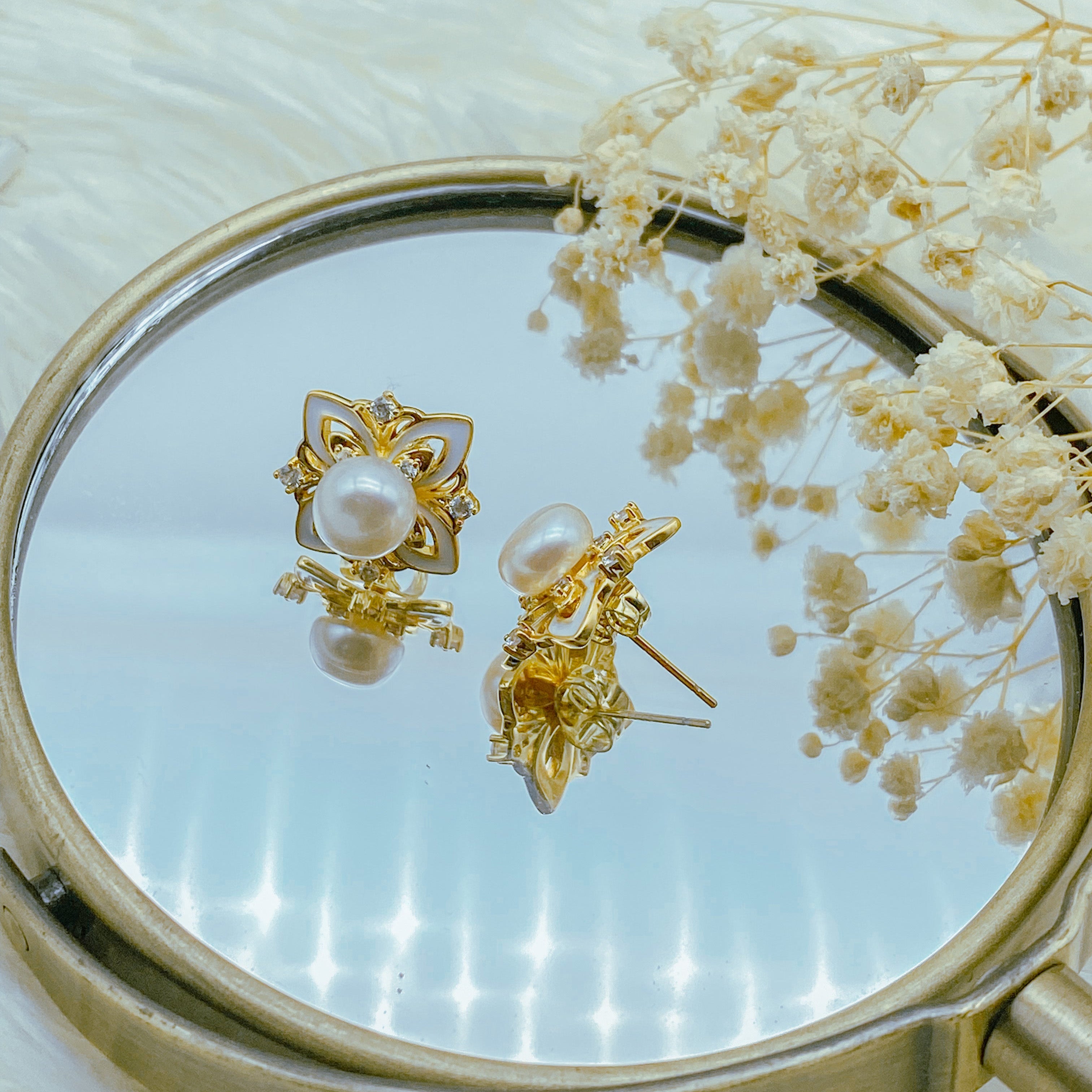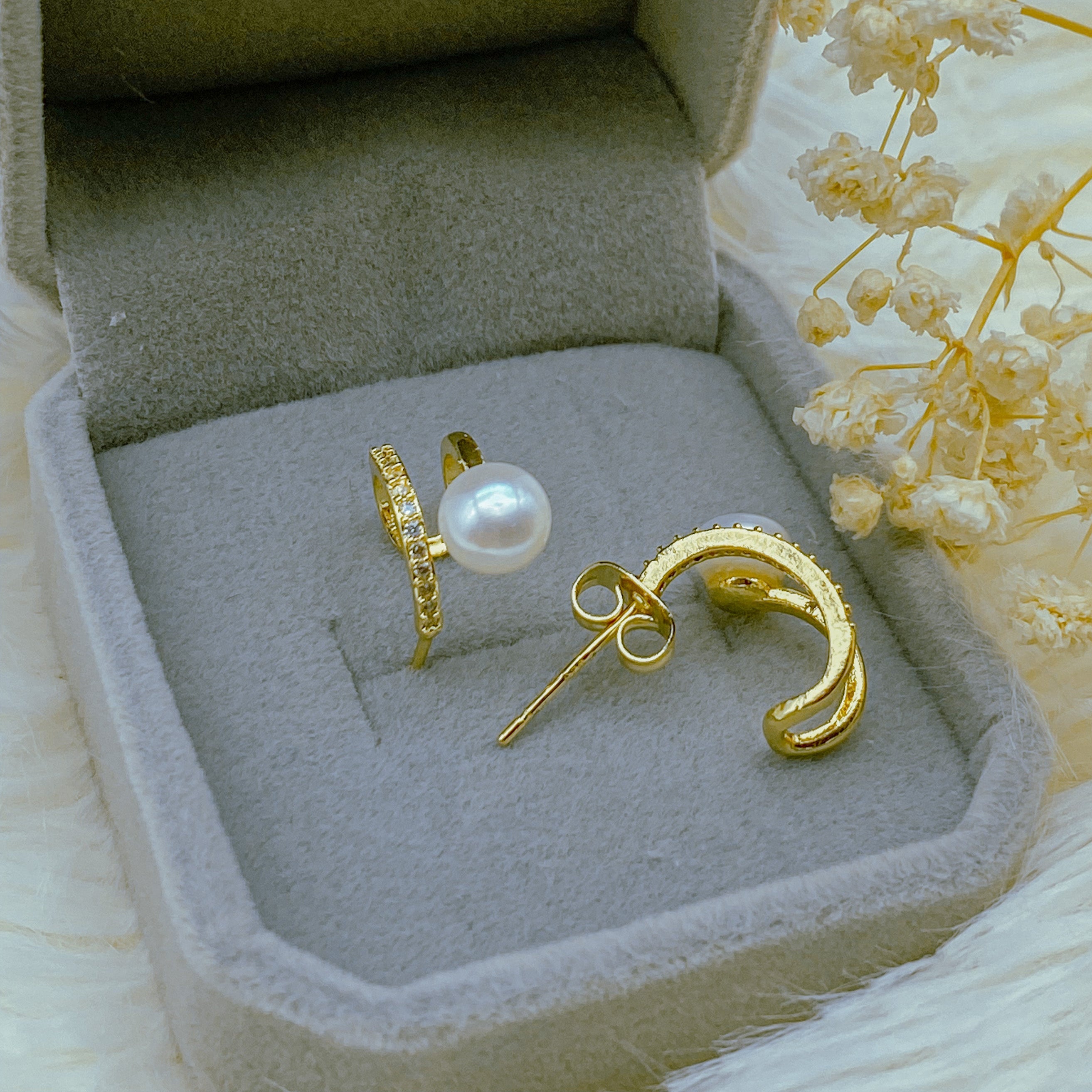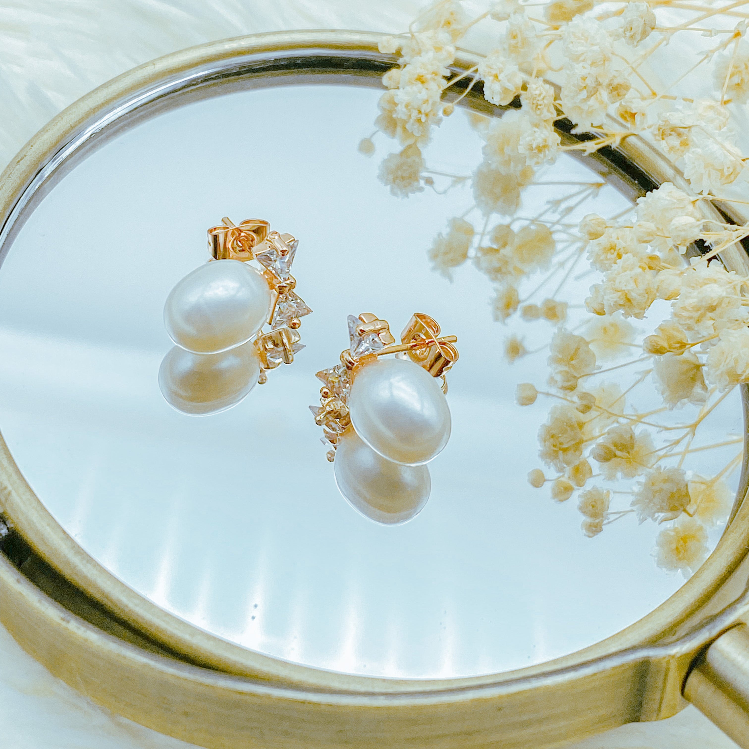 Materials:Real cultured freshwater pearls in micron setting with cubic zirconia stone.Pearls vary in size and shape.Each product is unique. Please expect slight variations.Do's & Don'ts:Do remove jewelry before exercising or when sweating profusely, cleaning with harsh chemicals, showering, and swimming.Do not forget to wipe your jewelry before storing it away. This will make sure any moisture/oil/dust is removed.Do carefully store jewelry in separate compartments of a jewelry box to prevent them from scratching each other and dulling the finish.