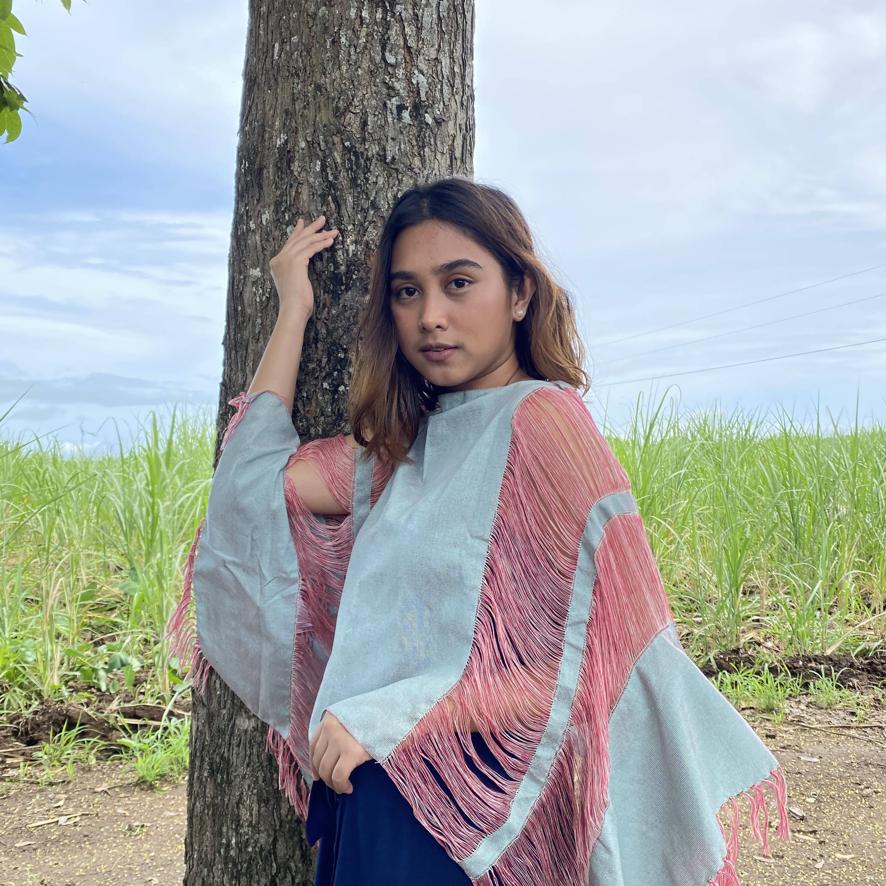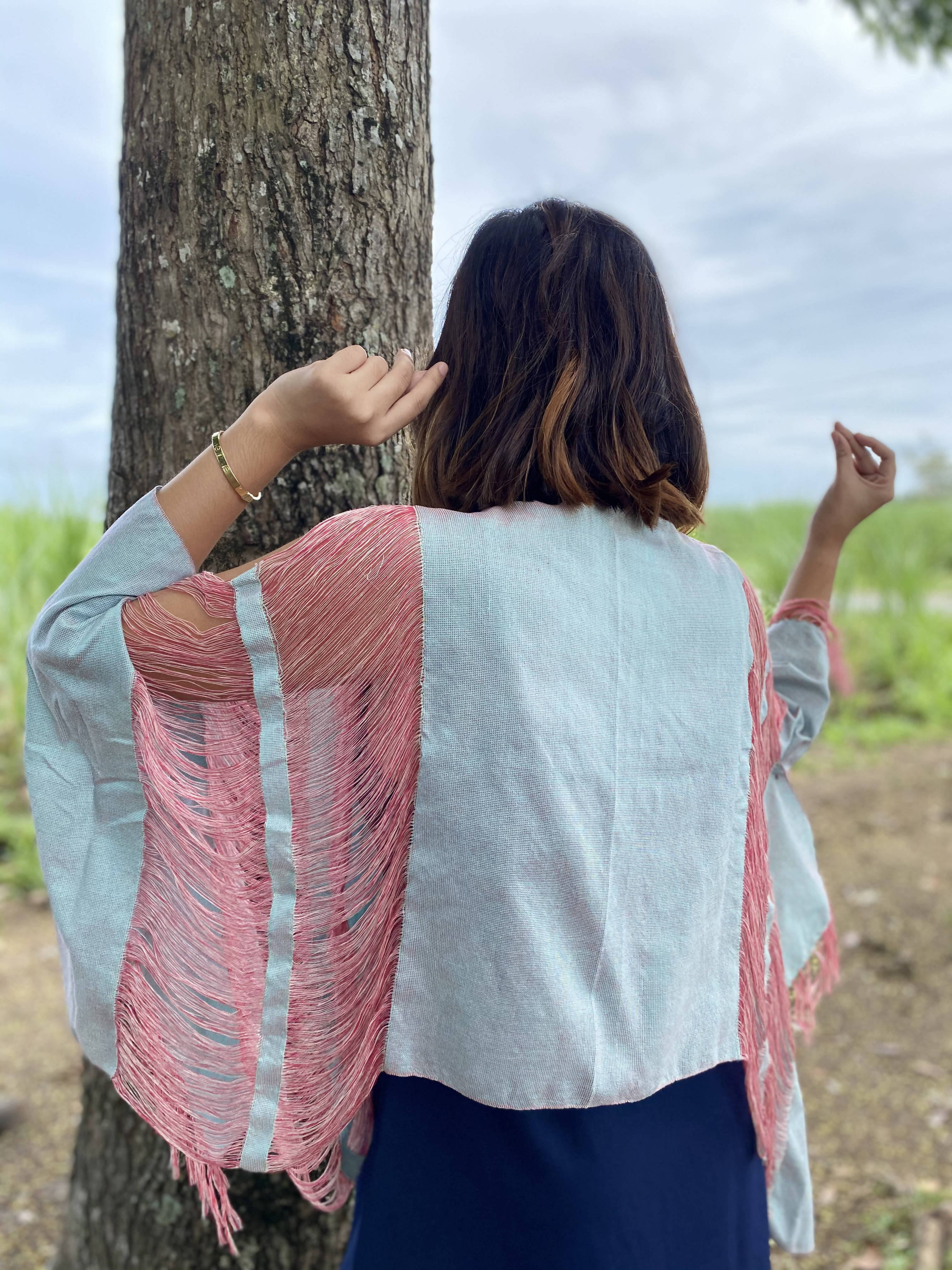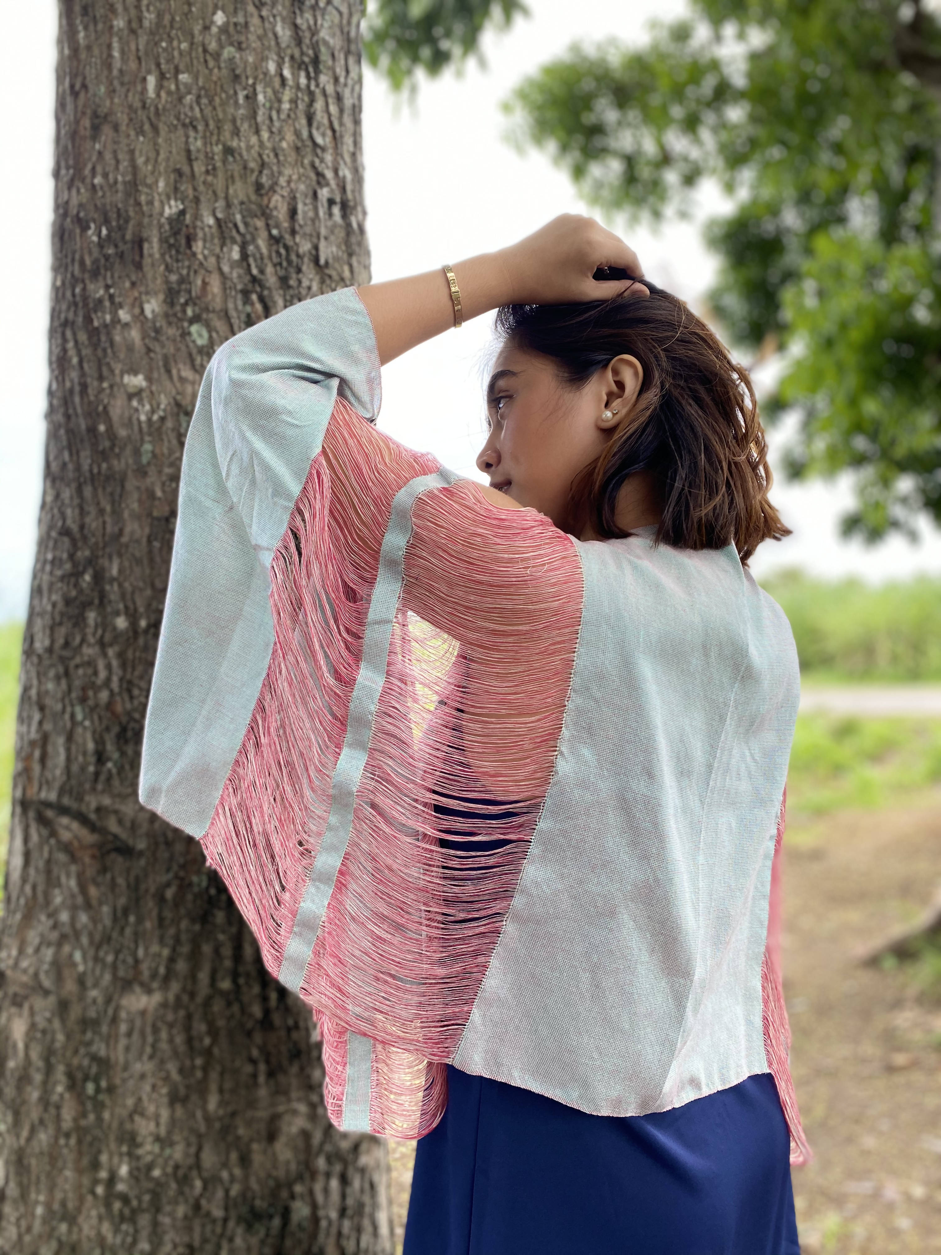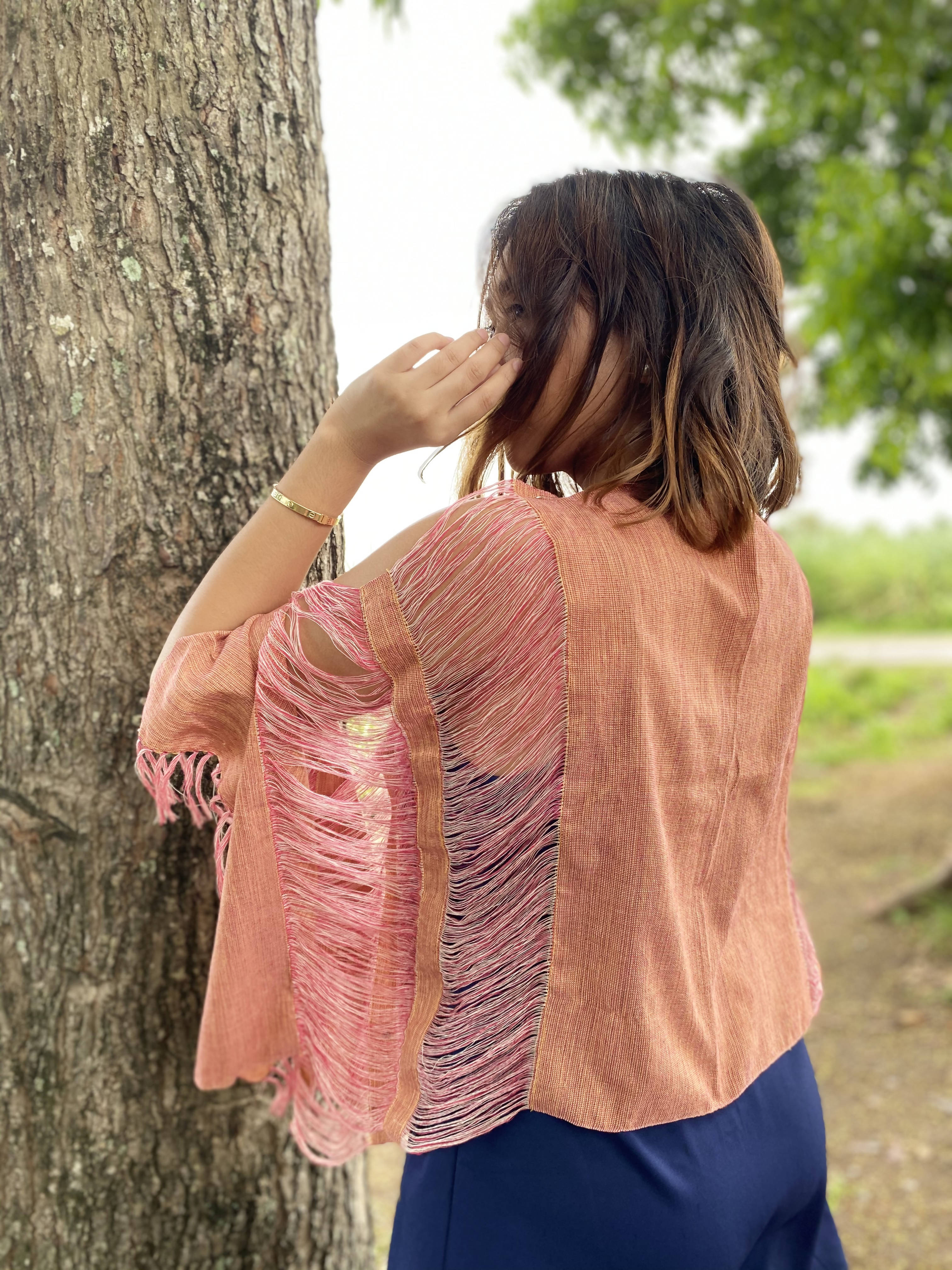 The Playful Fringes top, for softness and durability, Vida Hayes designs these pastel colors a fun combination of the handwoven top. Negros Island weavers in the Philippines use their expertise in hablon weaving, Vida added a fun fringe gap and added a soft tassel on the edge.