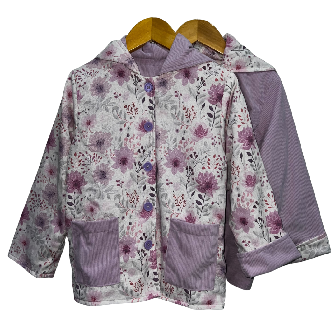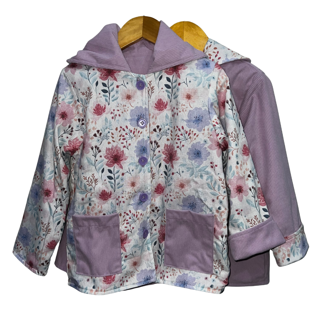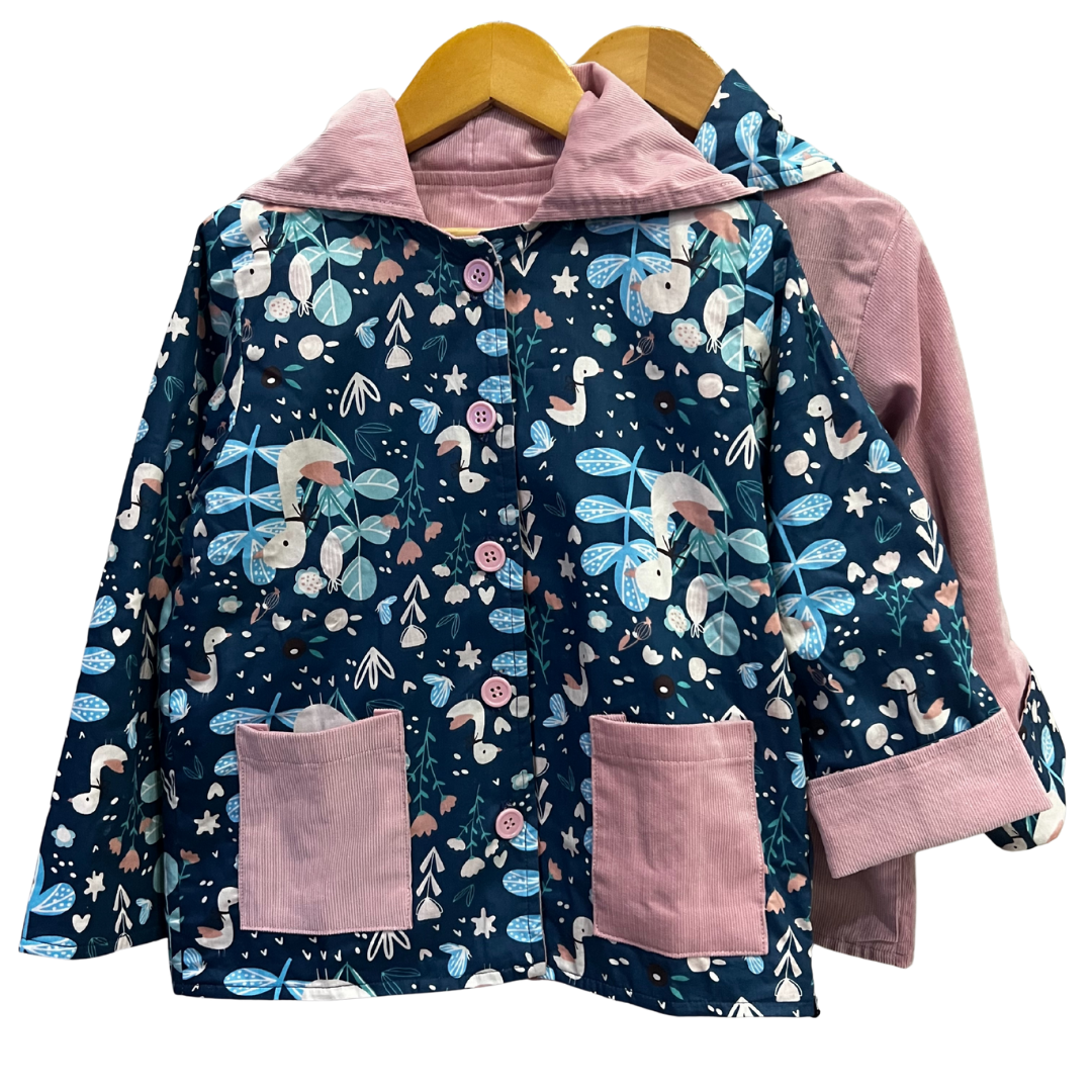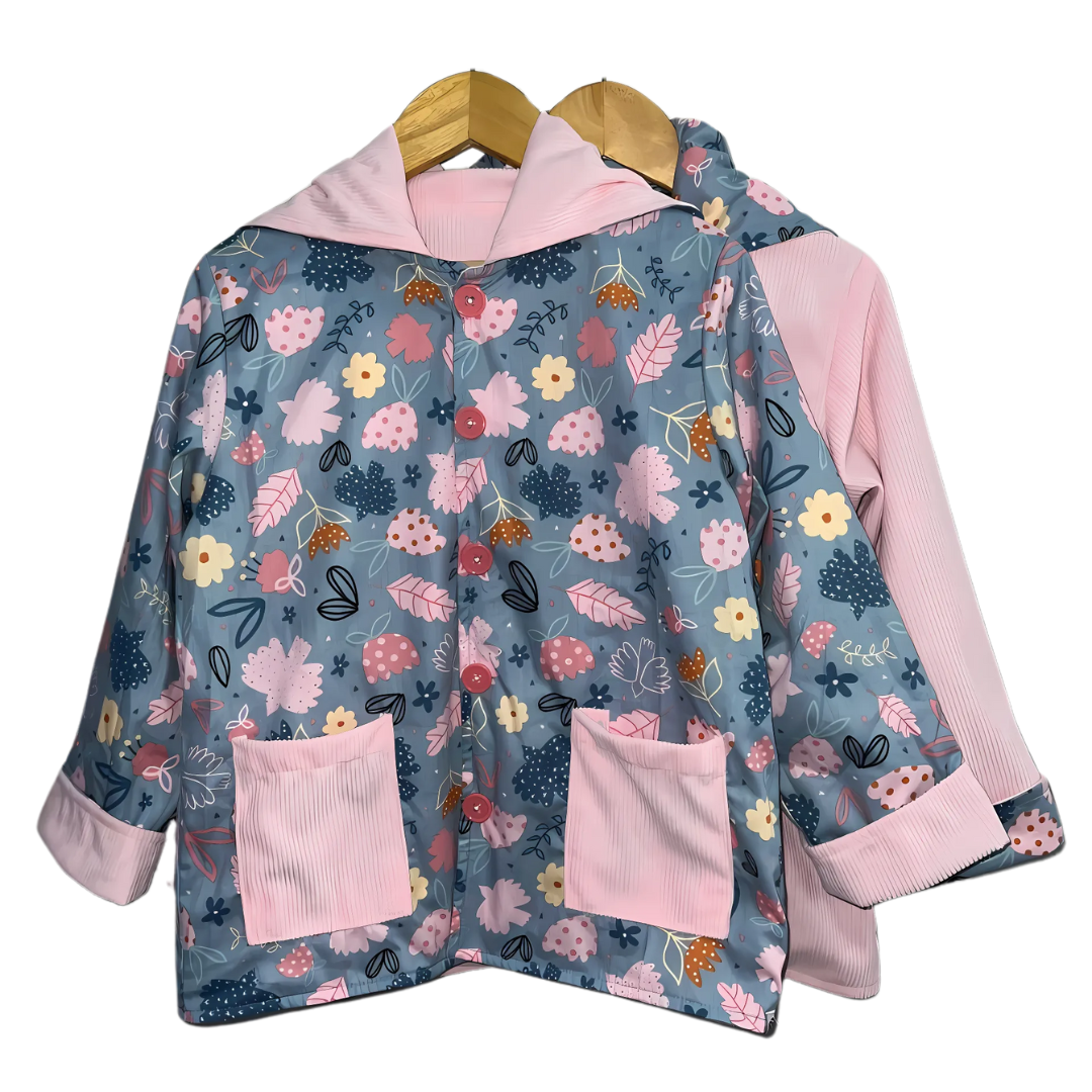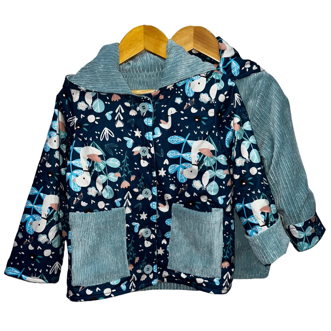 Product Feature: A reversible jacket for boys ages 2-8 Yrs.  with complementary wood buttons.Features a reversible hood, a pocket on the printed side.This is a reversible apparel. 100% cotton on print and cotton blend corduroy on plain side. Care Instructions: Gentle machine wash, on cold.Wash with like colors.Do not bleach.Do not soak.Iron on medium heat. Do not iron over brand labels or snap closure buttons.When washing, be mindful of the amount of detergent used as this, in some cases, may affect the durability and color of the cotton.